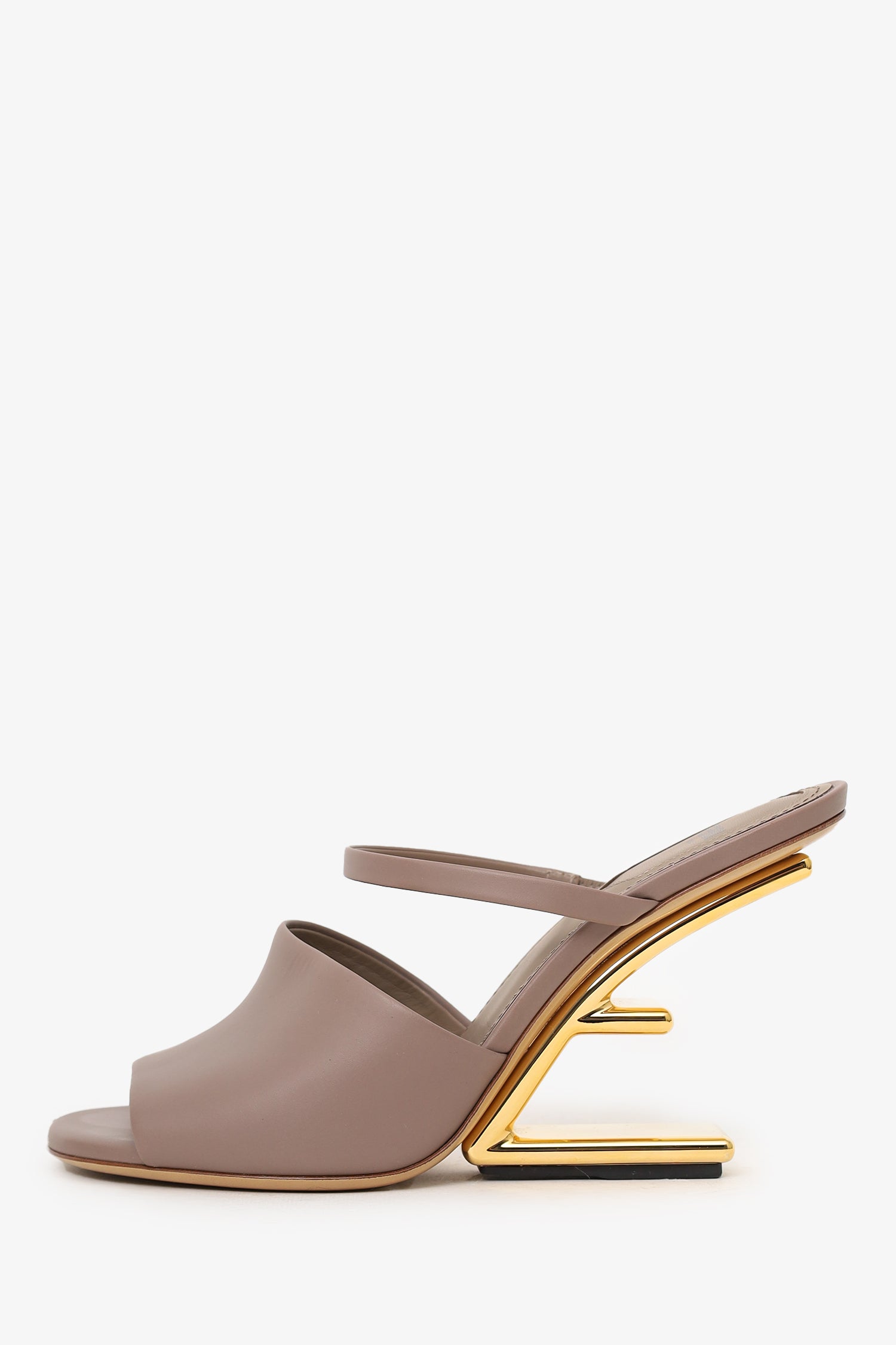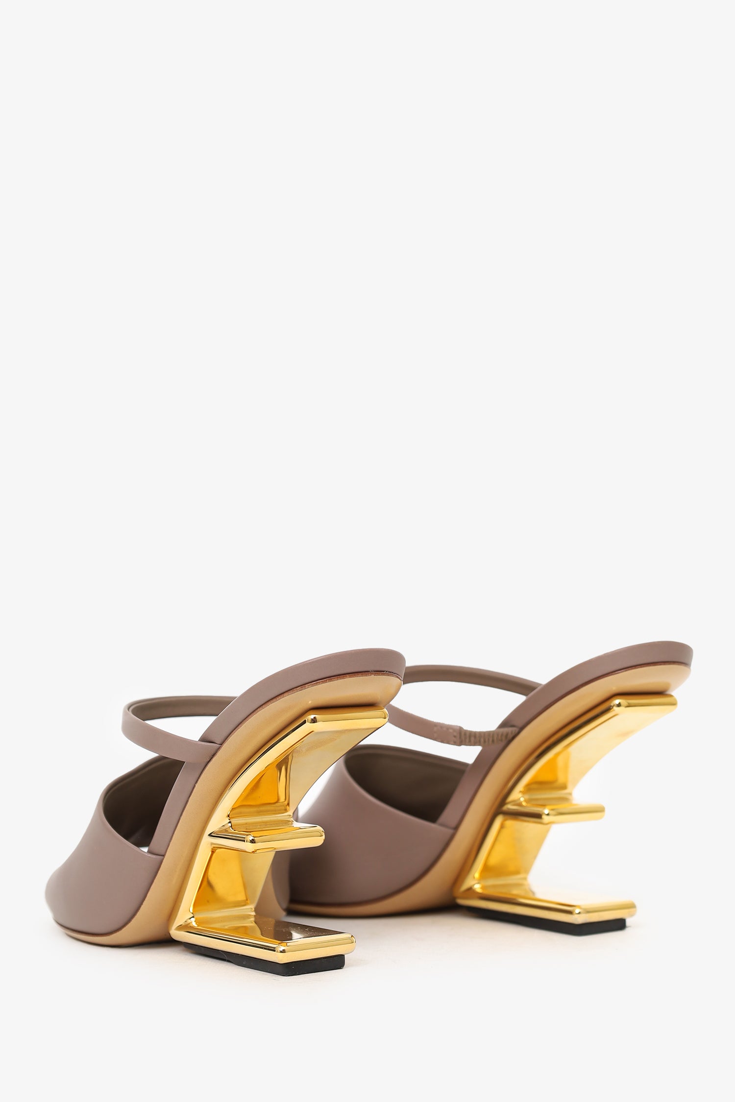 Refresh availabilityFendi Taupe Leather 'Fendi First' Heels. Slip on. Round toe. Gold-tone hardware. Tonal stitching.