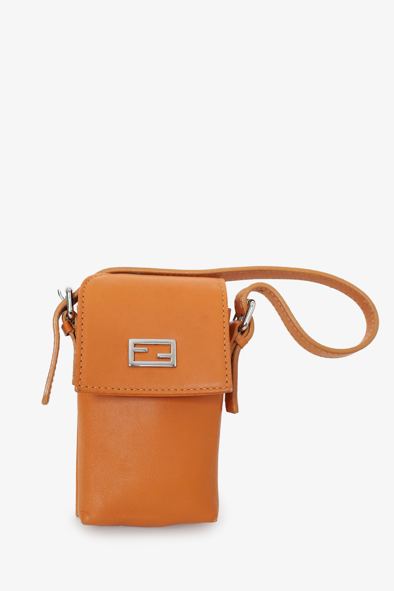 Refresh availabilityFendi Vintage Brown Leather Mini Phone Pouch. Snap closure. Fold-over front flap. Silver-toned hardware. Tonal stitching.