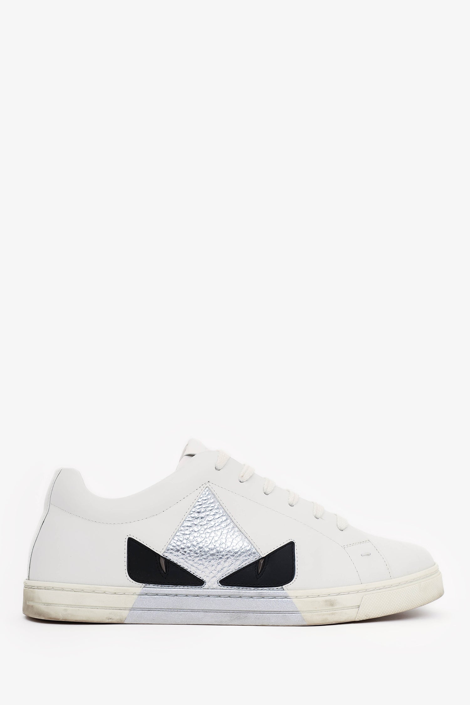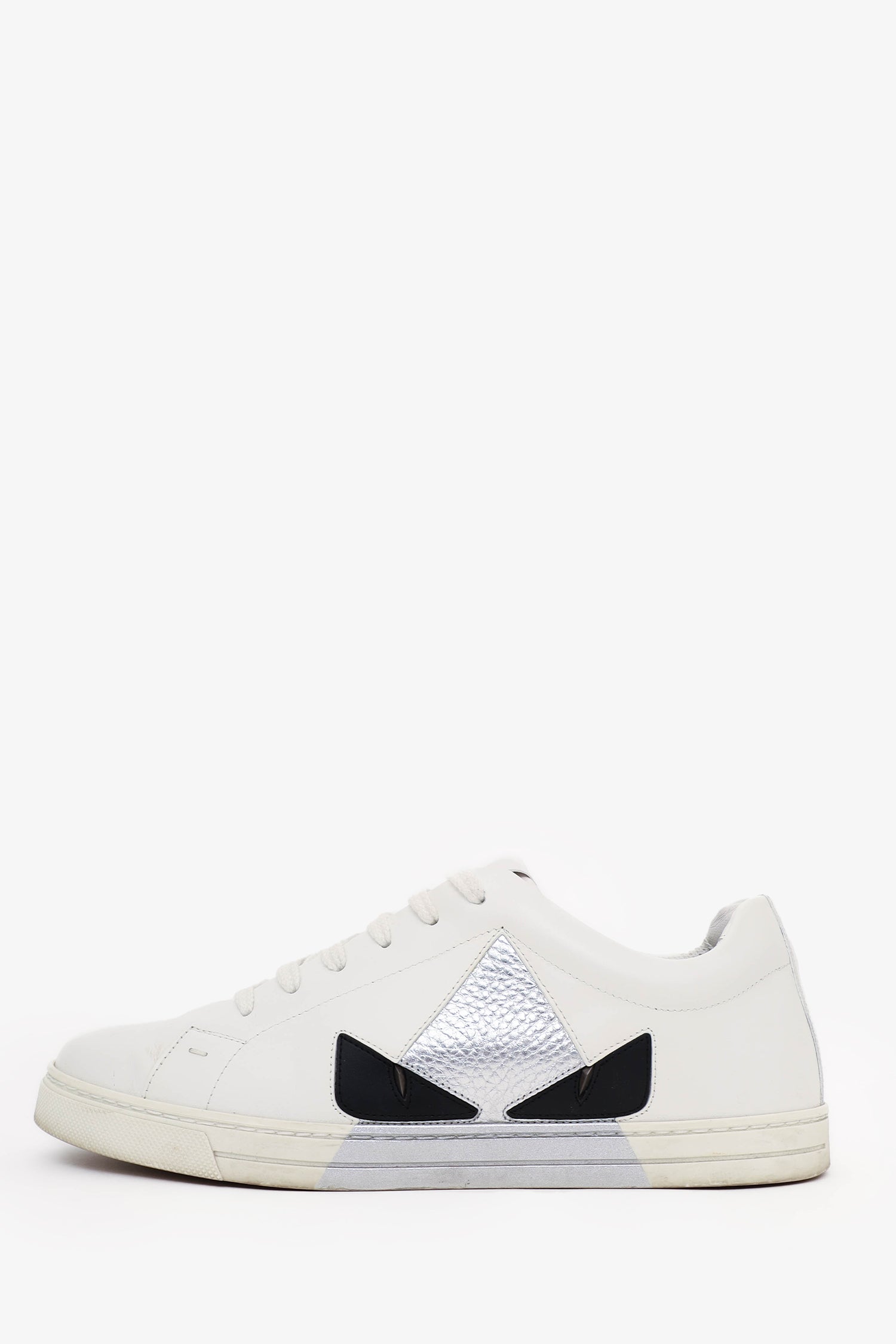 Refresh availabilityFendi White Calfskin Bugs Low Top Sneakers. Slip-on. Front lace-up closure. Round toe. Tonal stitching.