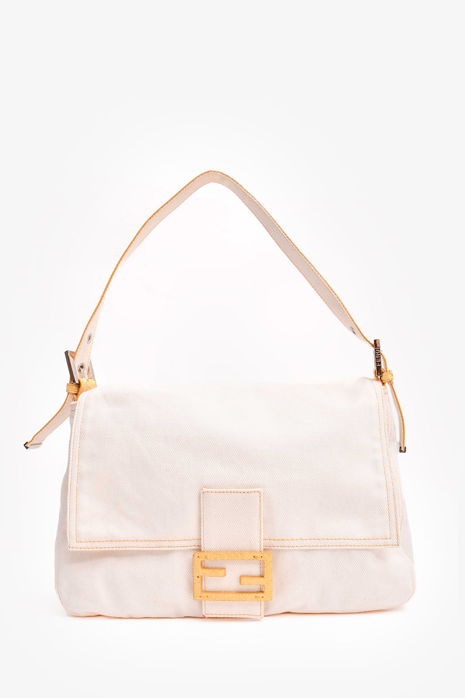 Refresh availabilityFendi White Denim/Yellow Python Top Stitched Mamma Baguette Bag. Yellow topstitching. Silver-tone hardware. Snap closure. Zipped interior. Satin lined interior.