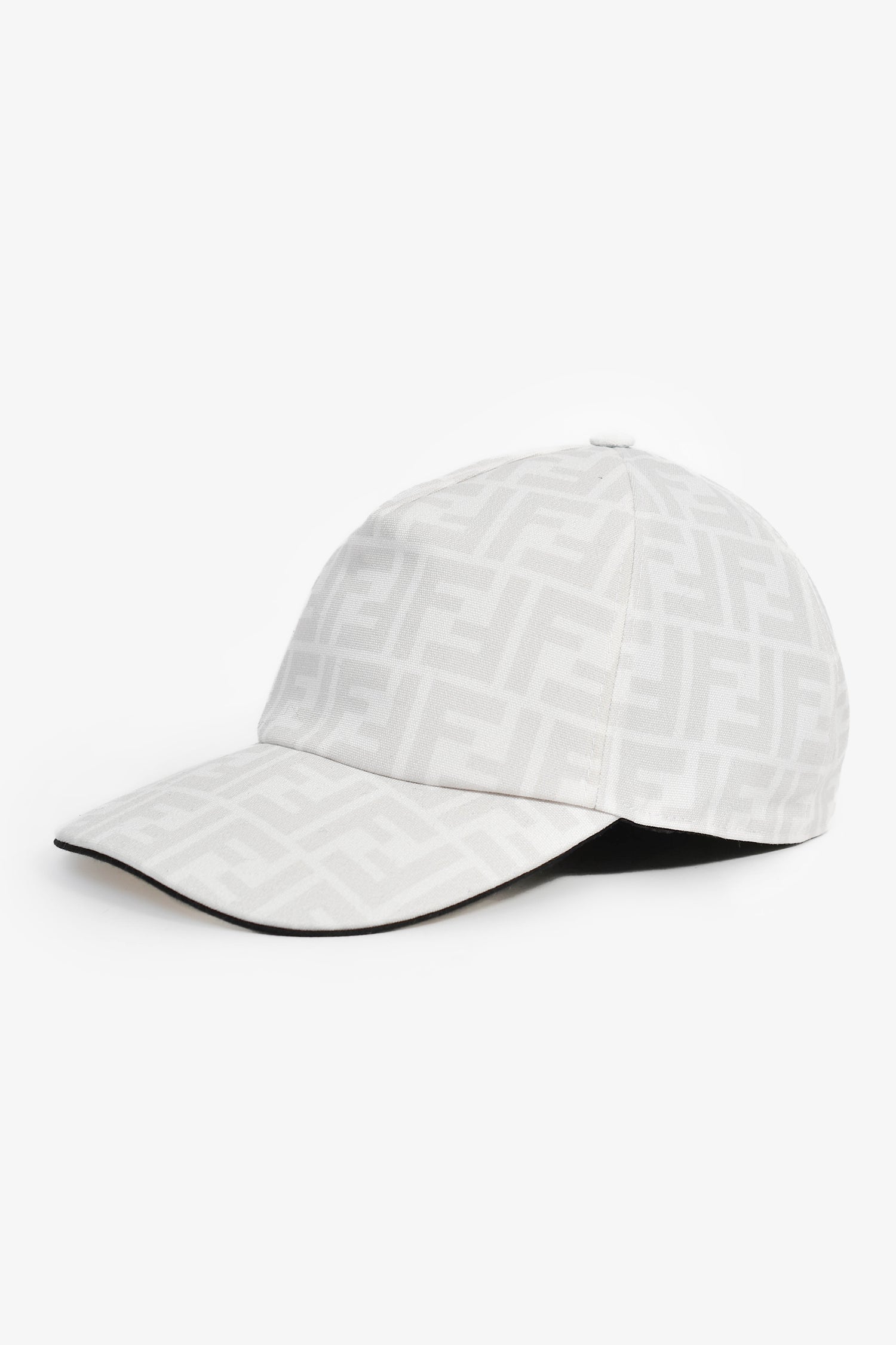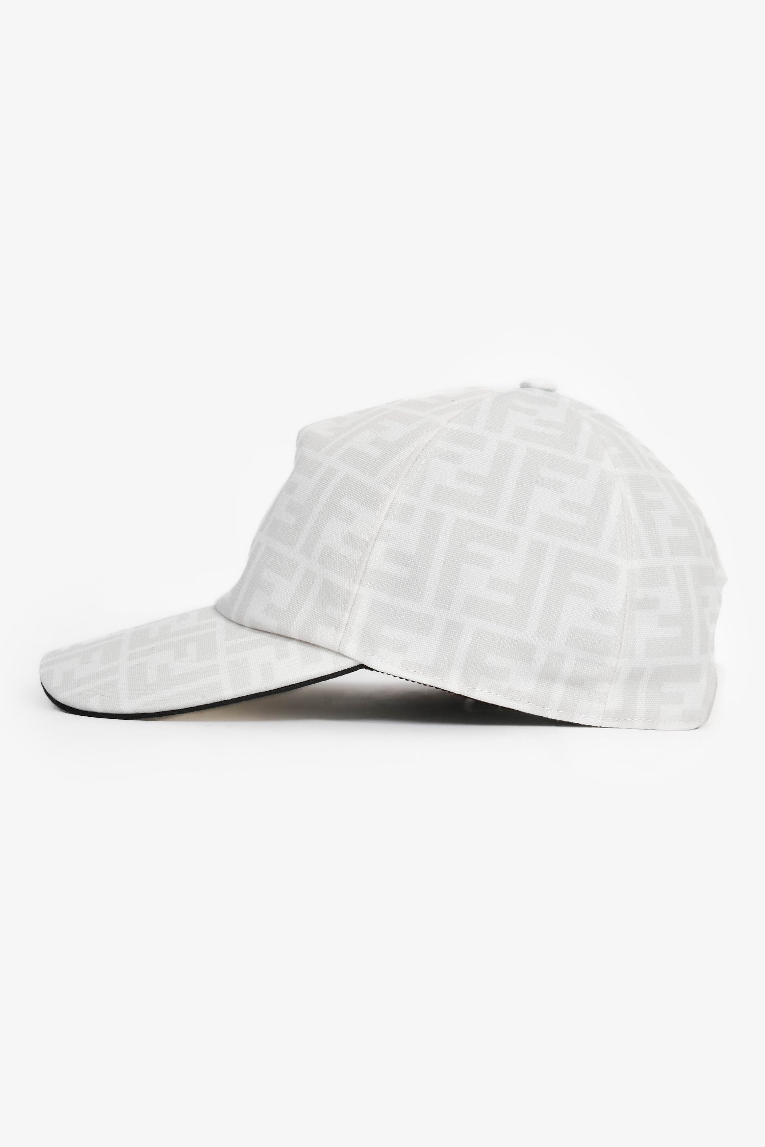 Refresh availabilityFendi White FF Baseball Hat. Interior grosgrain band. Rear velcro strap. Zucca print. Wide brim. Tonal stitching.