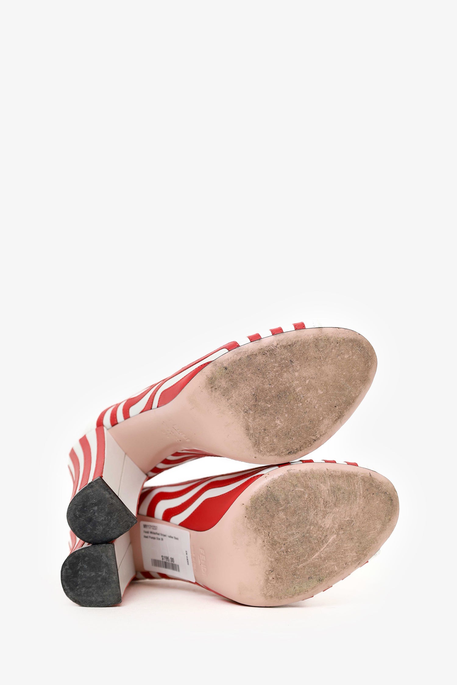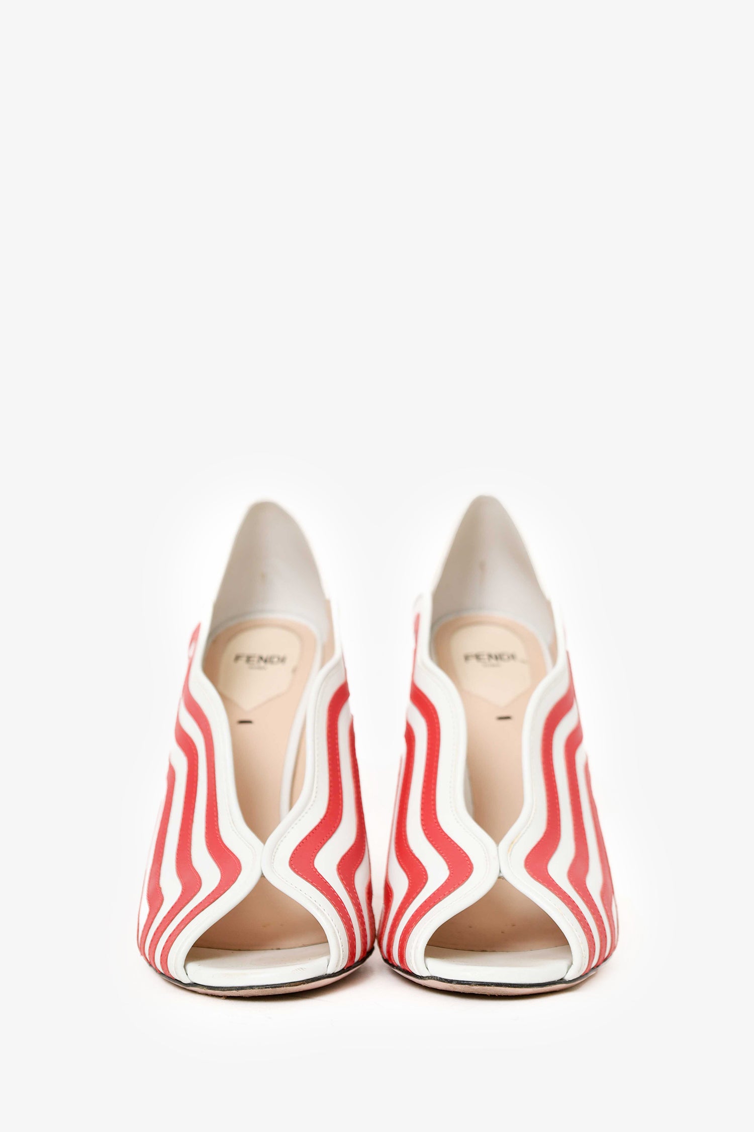Refresh availabilityFendi White/Red Striped Leather Block Heel Pumps. Slip-on. Round peep-toe. Tonal stitching.