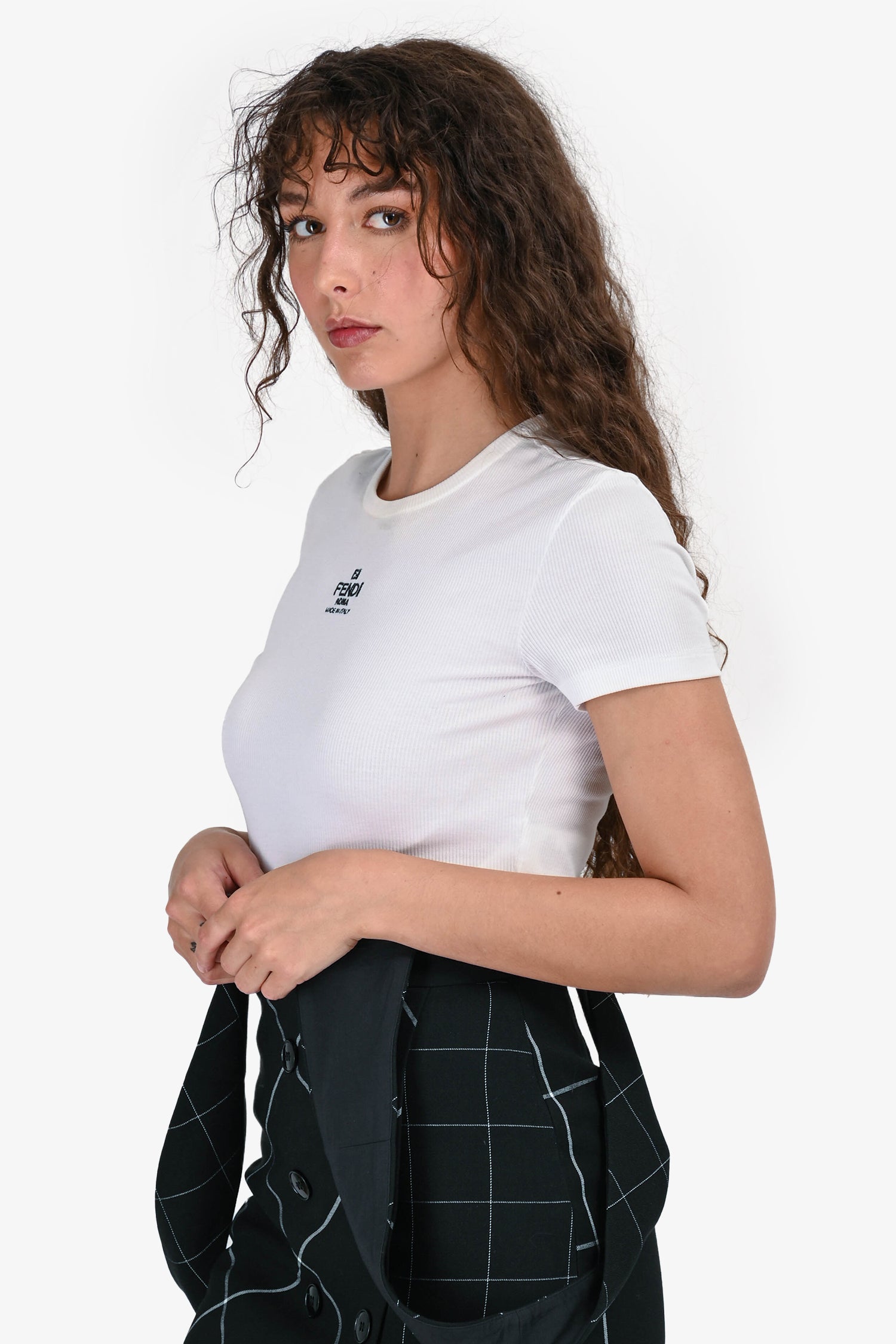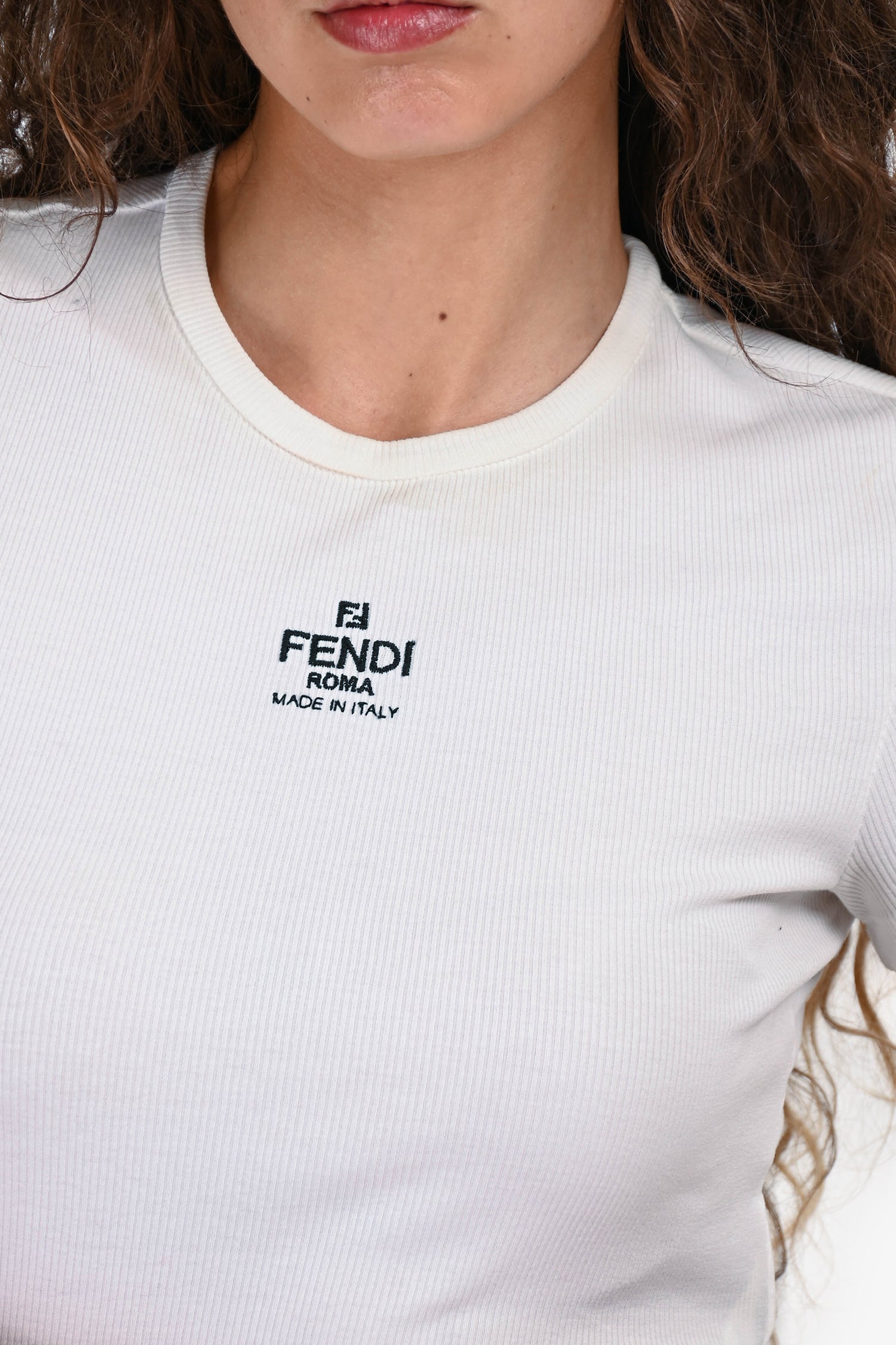 Refresh availabilityFendi White Ribbed Embroidered Logo Short Sleeves T-Shirt. Crew neckline. Short sleeves. Ribbed stretch fabric. Embroidered logo at chest. Pull-on. Tonal stitching.
