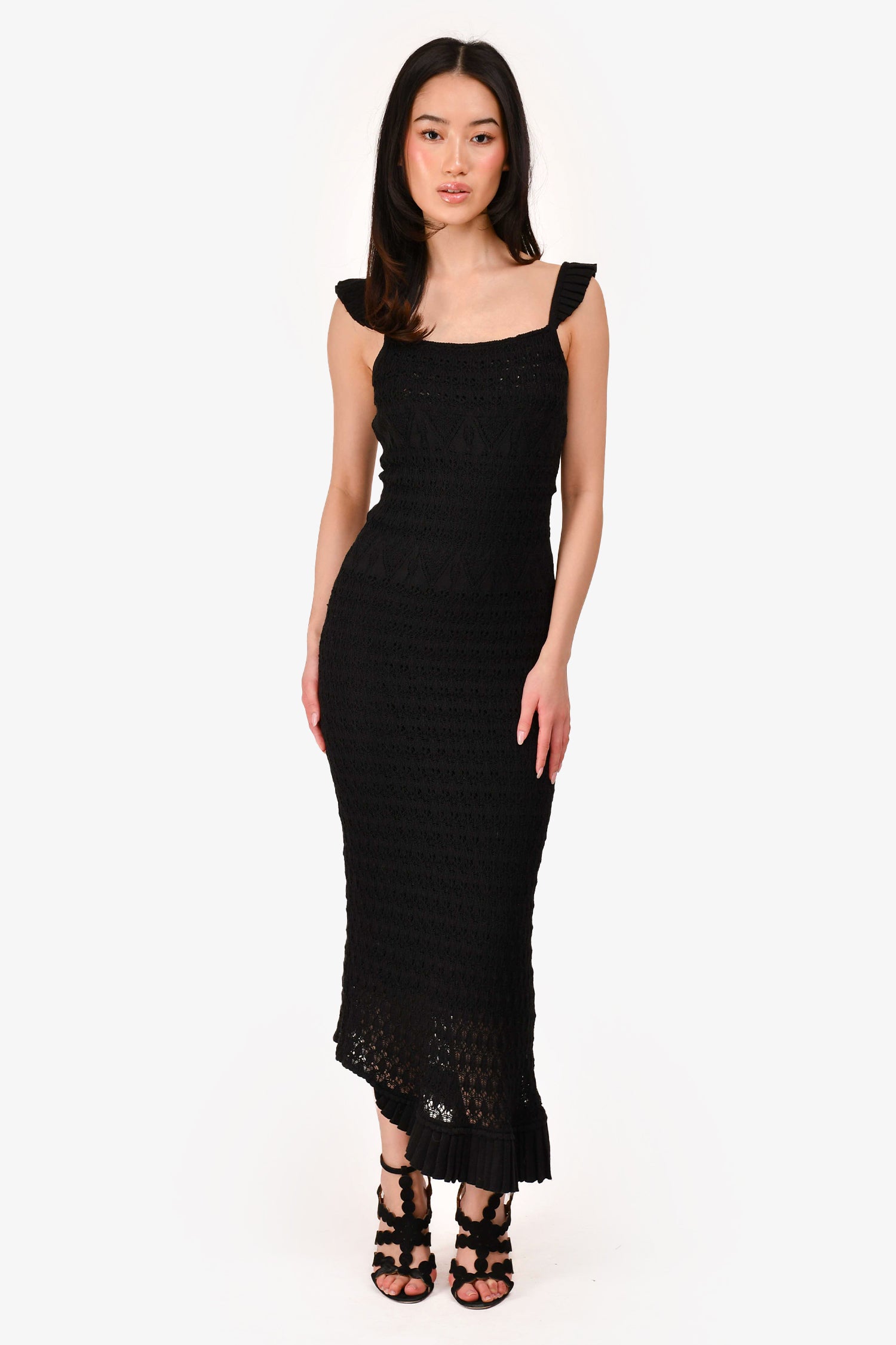 Refresh availabilityFerre Black Wool Maxi Dress. Square neckline. Ruffled sleeves. Lined. Tonal stitching.