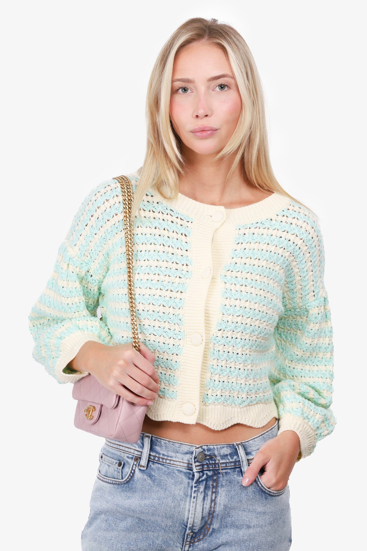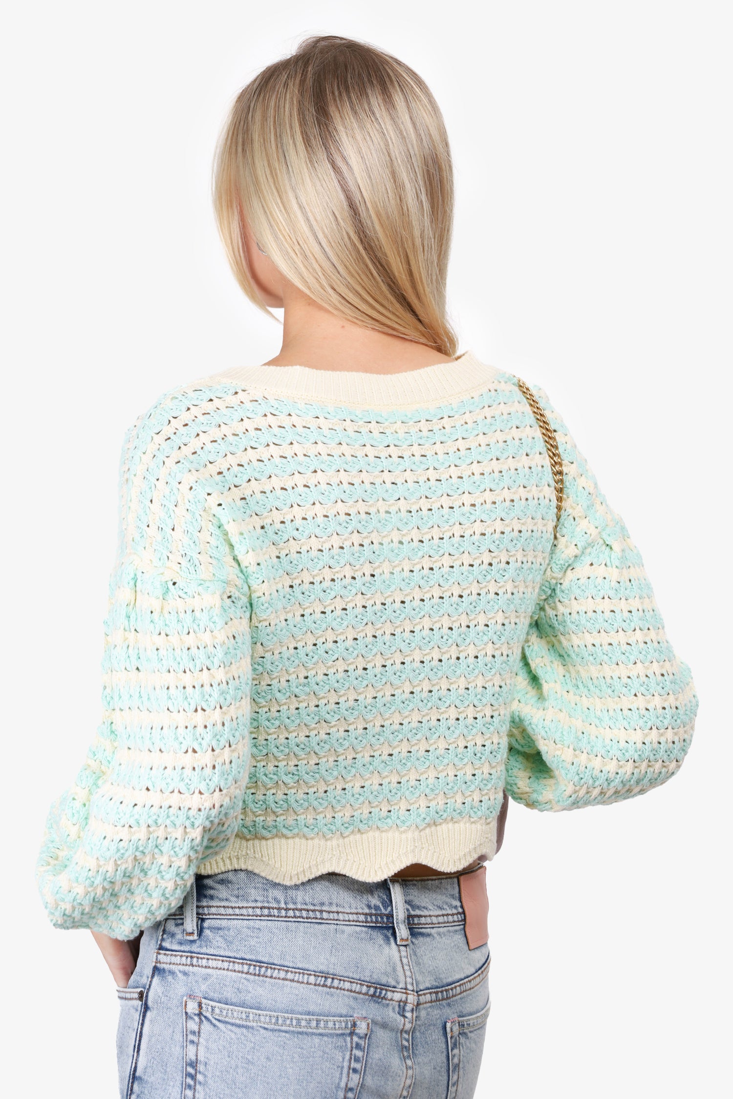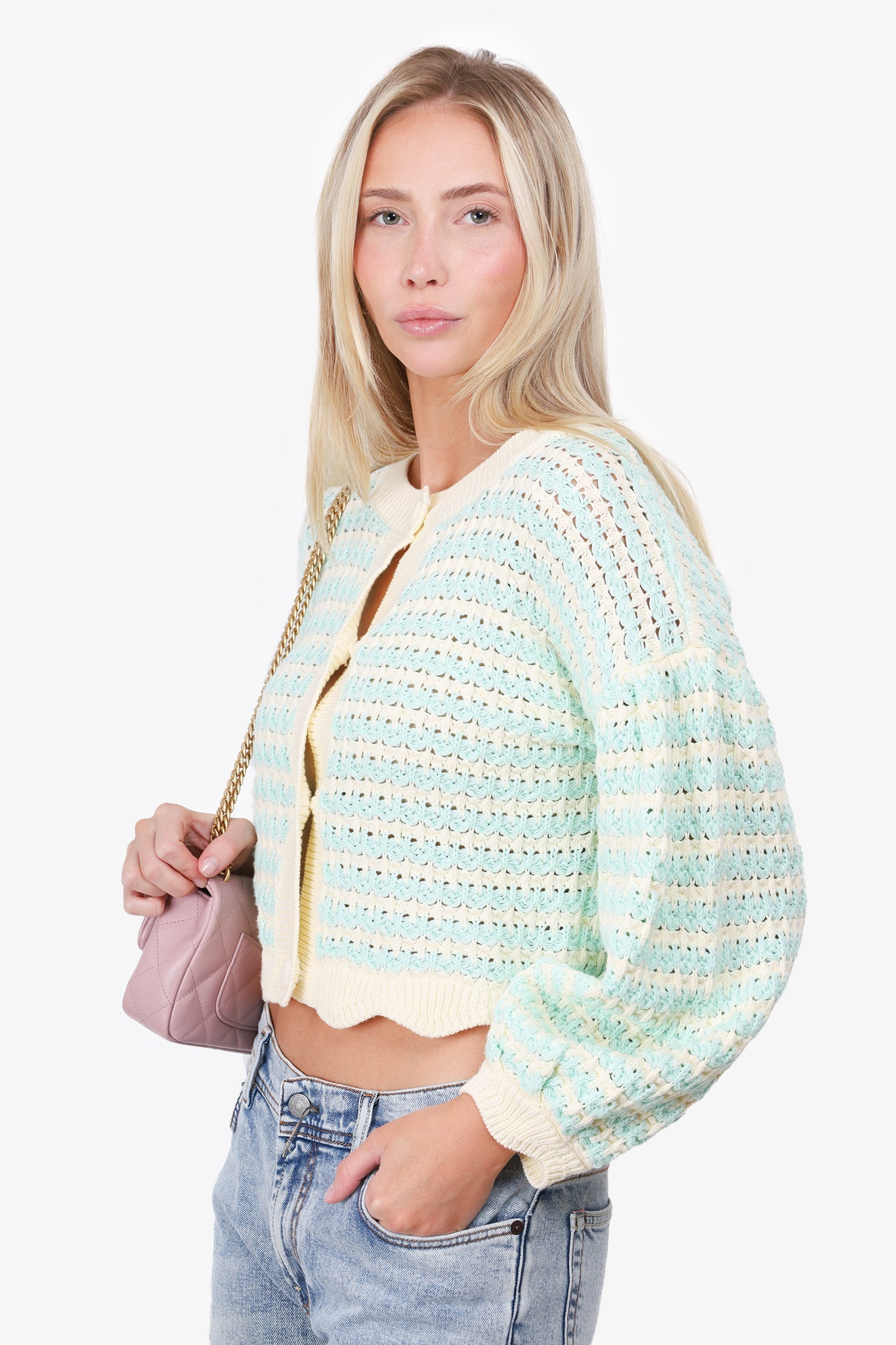 Refresh availabilityFor Love and Lemons Yellow/Green Striped Knit Cardigan. Front button-up closure. Balloon sleeves. Unlined. Tonal stitching.
