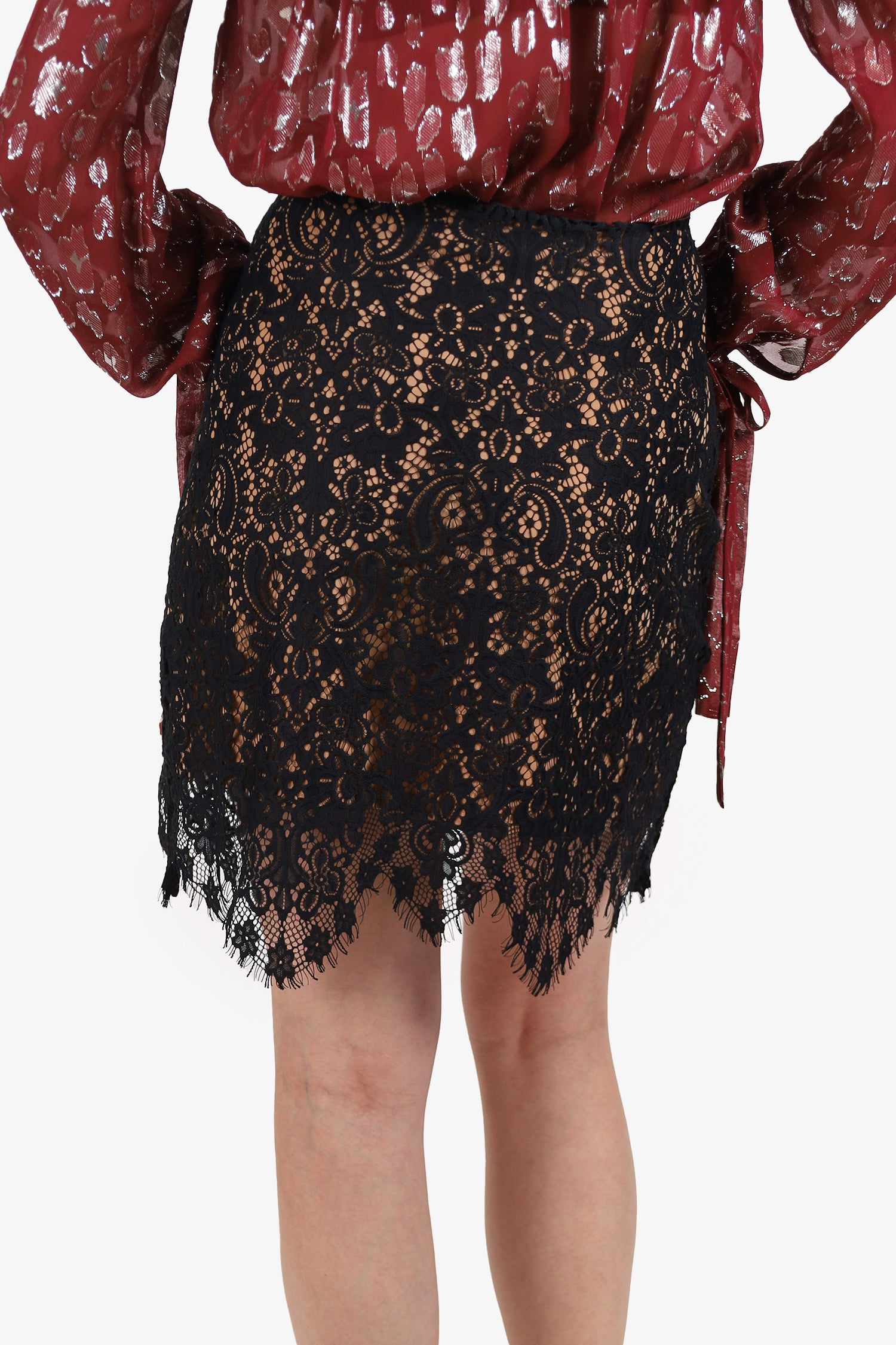 Refresh availabilityFor Love & Lemons Black Lace Mini Skirt. Slip-on. Rear zip with hook closure. Attached interior lining. Tonal stitching.