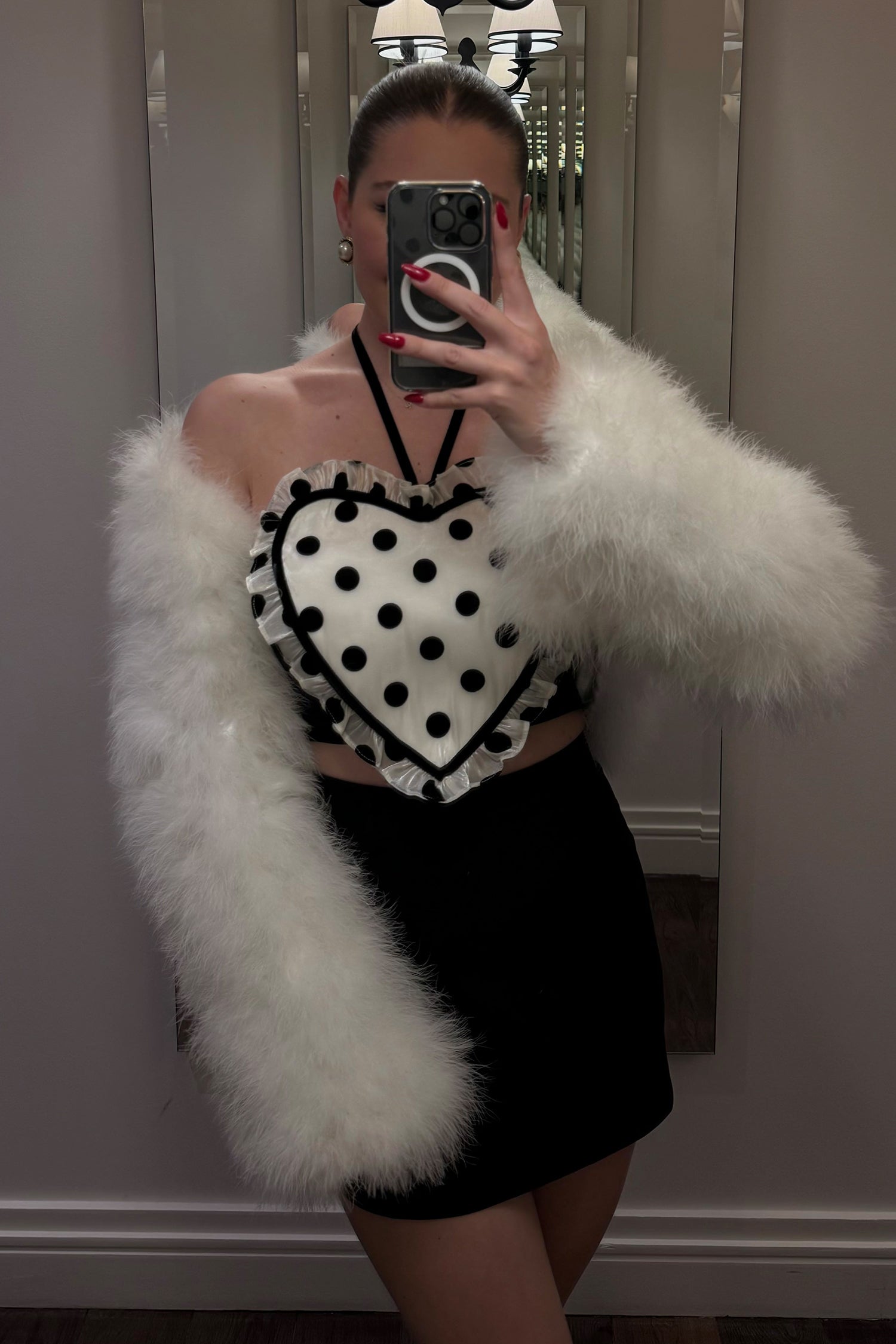 Refresh availabilityFor Love & Lemons Black/White Polka Dot Ruffle Detail Heart Corset. Pull-on. Halter-neckline with tie-up closure. Rear hook closure. Built-in boning. Tonal stitching.