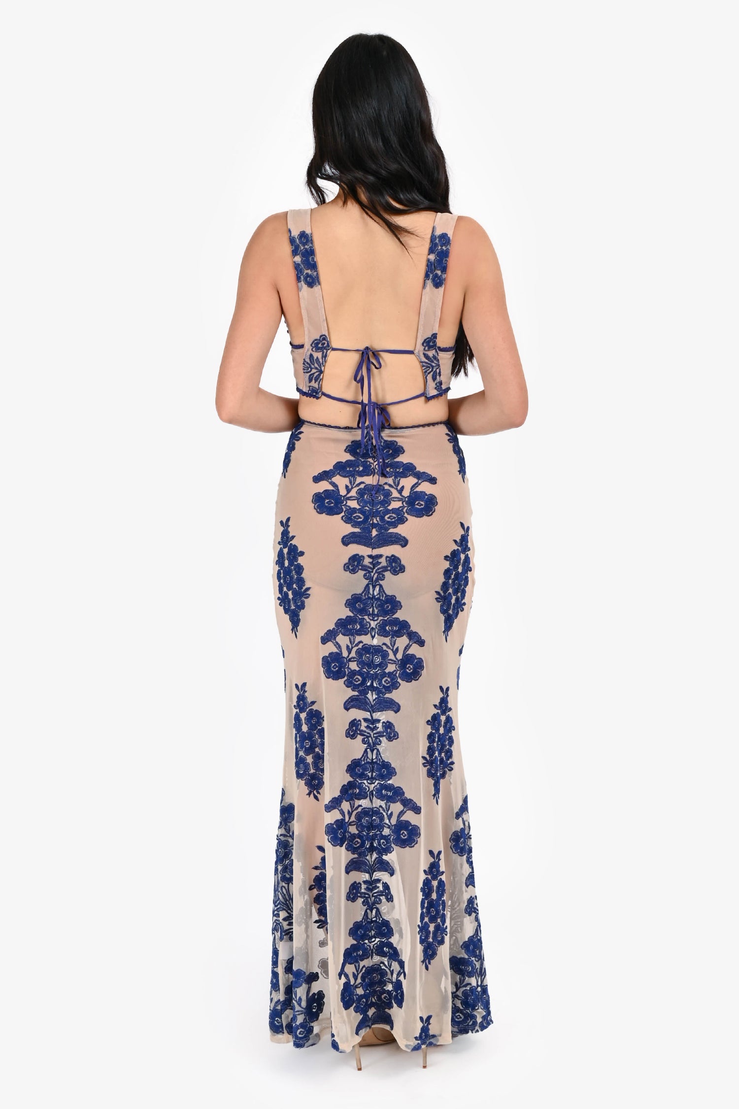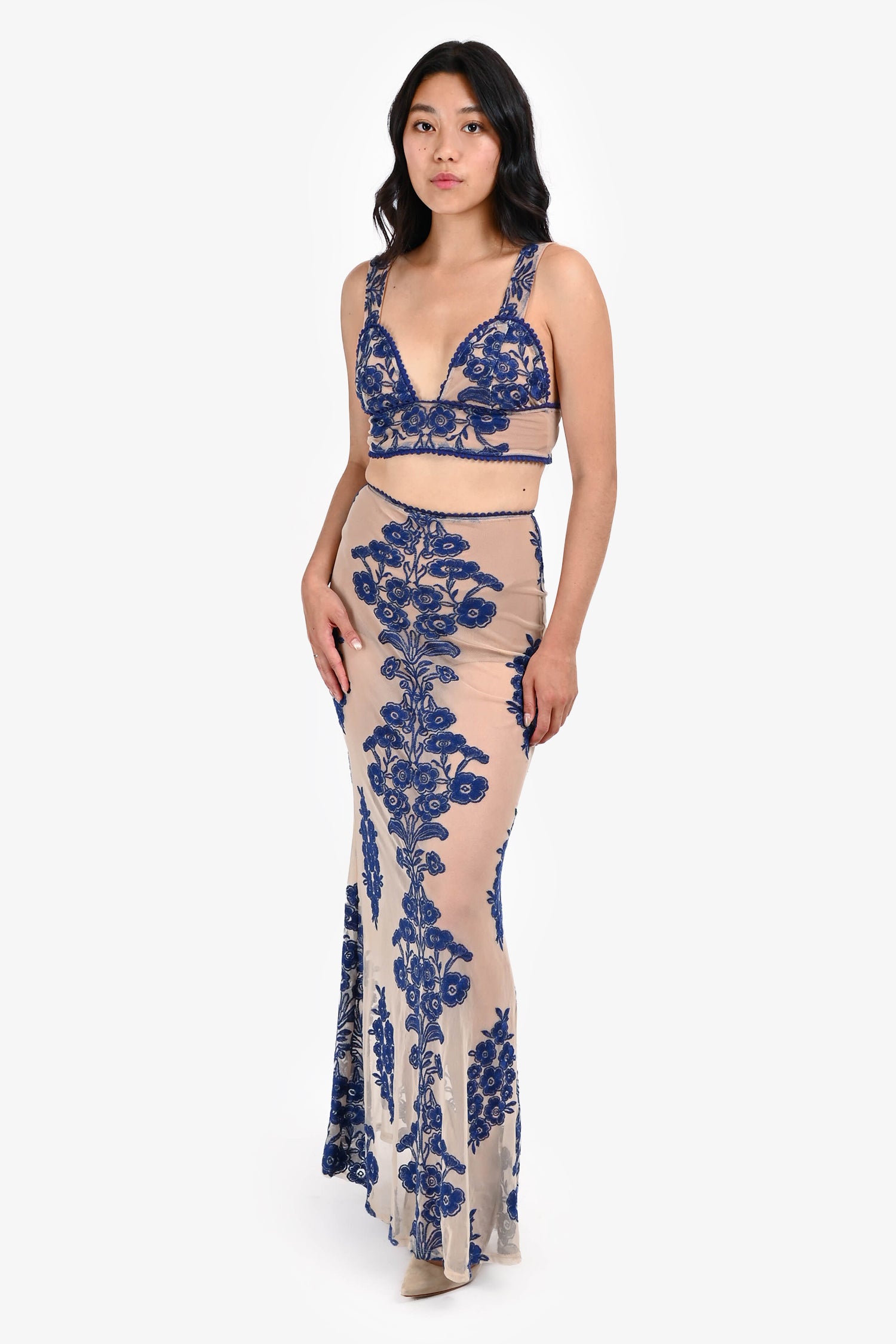 Refresh availabilityFor Love & Lemons Blue Floral Embroidered Nude Mesh Bralette + Skirt Set. Bralette: Back tie strings closure. Skirt: Concealed side zip closure. Both fully lined. Tonal stitching.