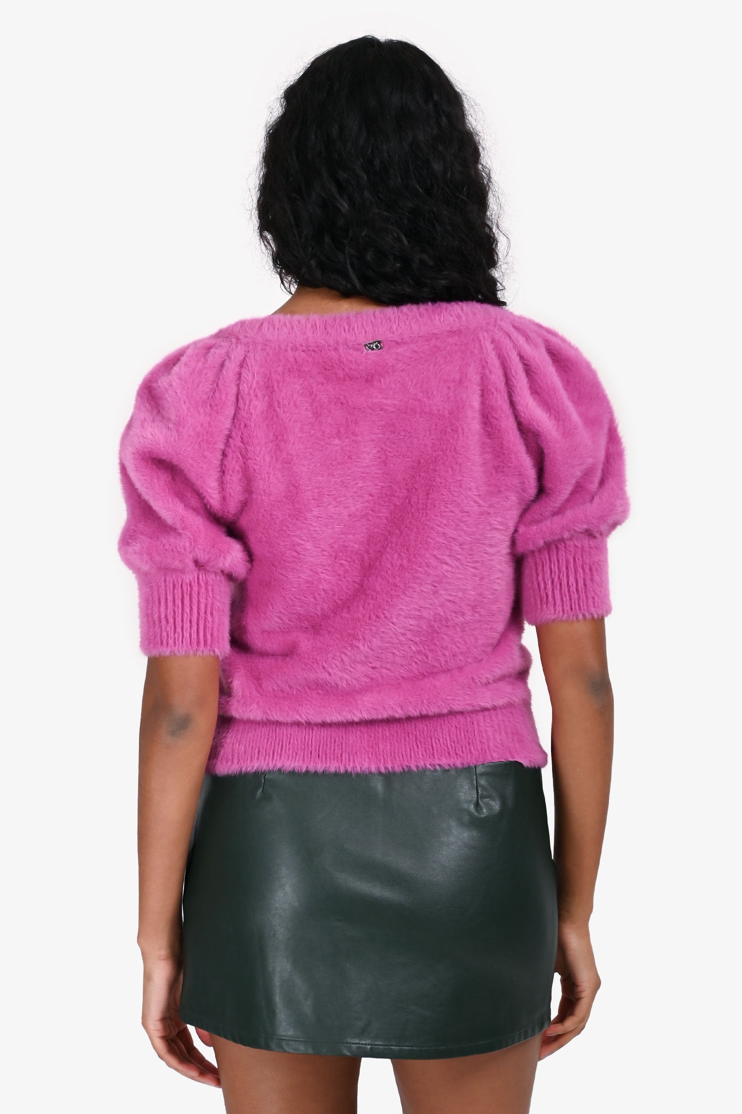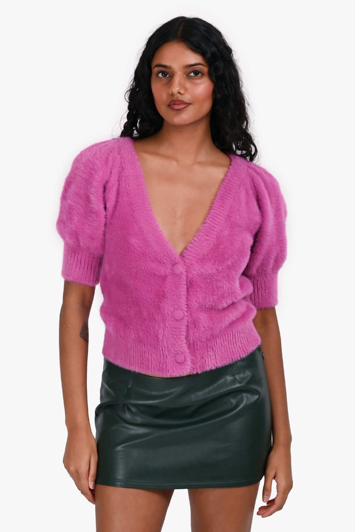 Refresh availabilityFor Love & Lemons Fuchsia Fuzzy Cardigan. Pull-on. V-neckline. Front button-up closure. Ribbed neck, cuffs, and hem.