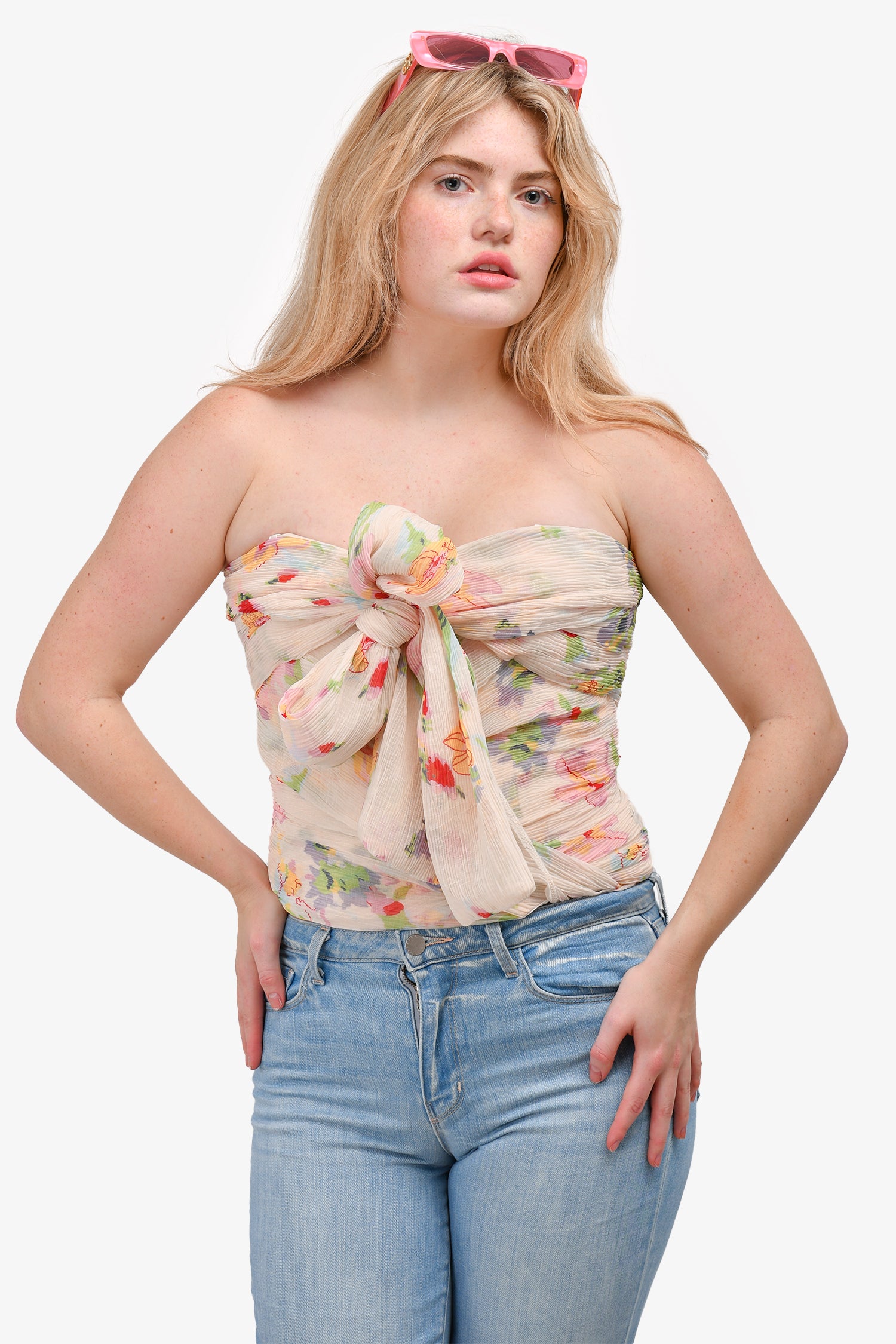 Refresh availabilityFor Love & Lemons Ivory Floral Printed Strapless Top. Micro-pleats throughout. Zipped back with a snap closure. Bow front. Floral motif throughout. Corseted with boning.