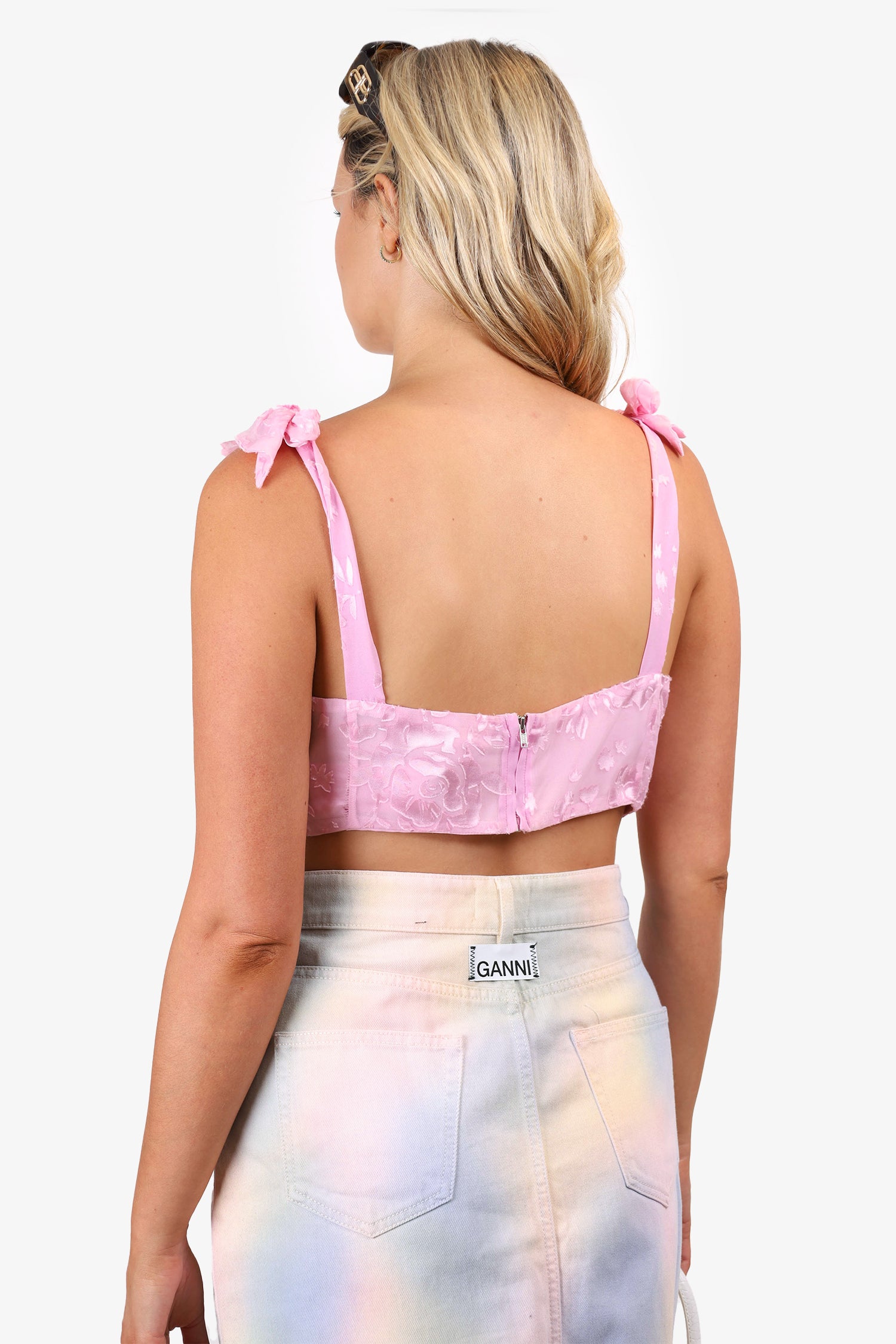 Refresh availabilityFor Love & Lemons Pink Crystal Embellished Bra Top. Scoop neckline. Rear zip closure. Adjustable tie straps. Lined. Tonal stitching.