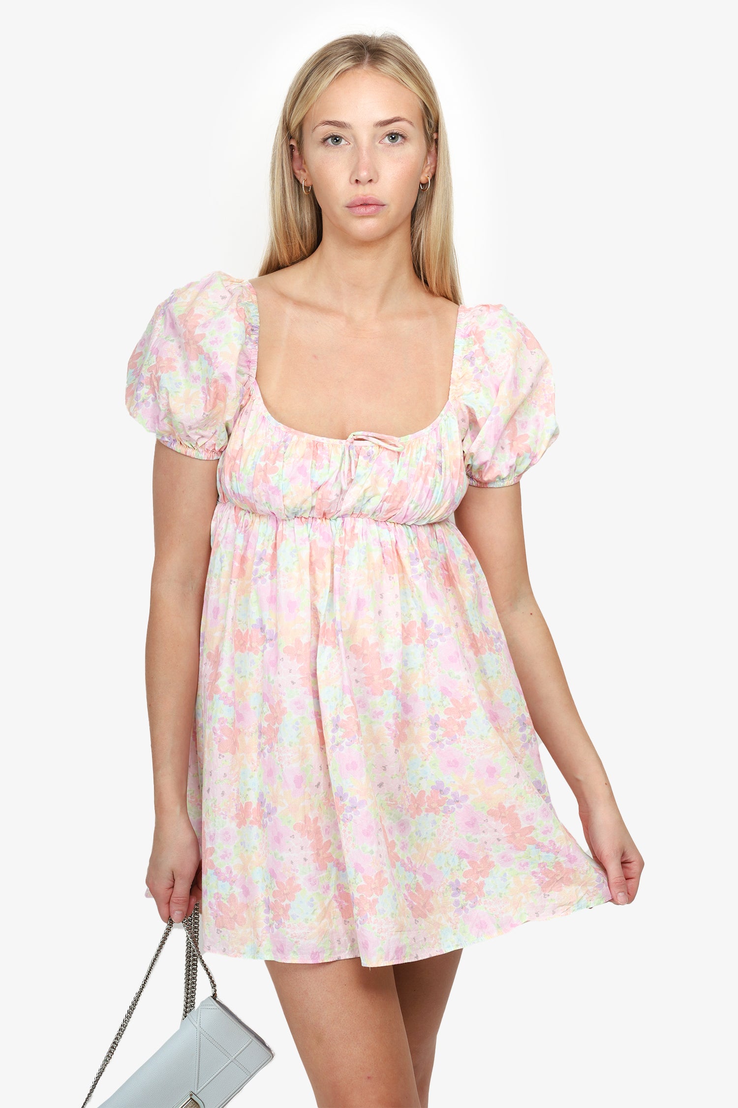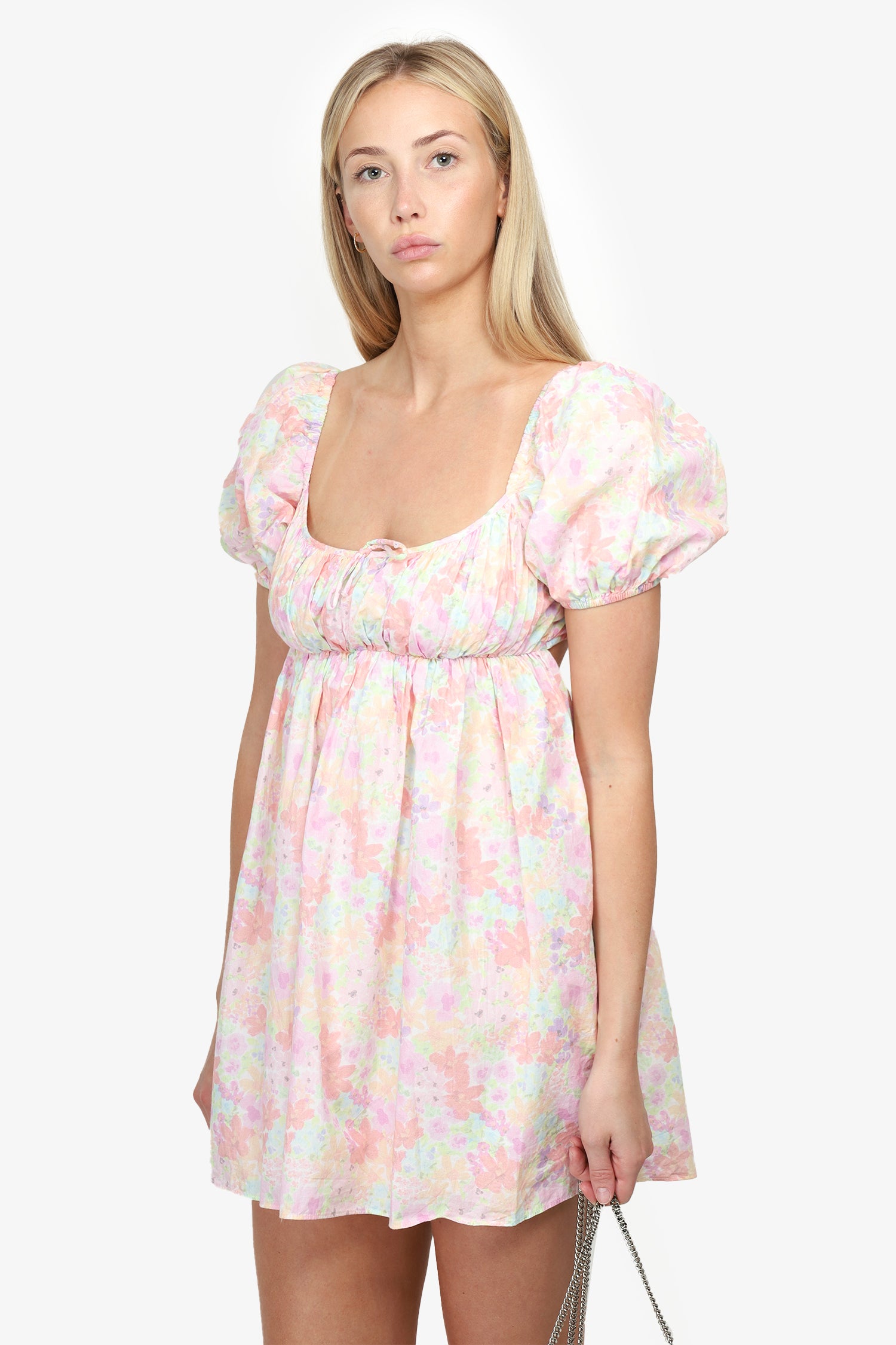 Refresh availabilityFor Love & Lemons Pink Floral Puff Sleeve Mini Dress. Rear tie closure. Short sleeves. Round neckline. Tonal stitching.