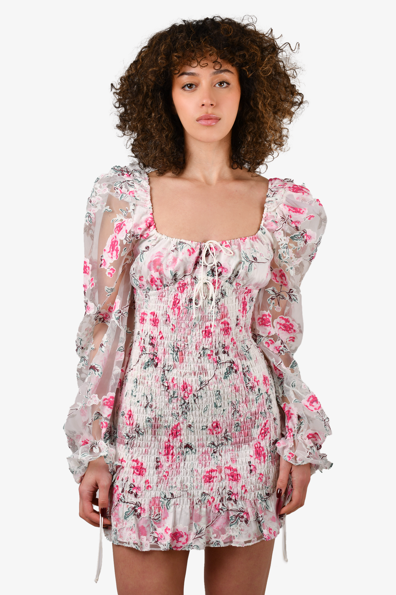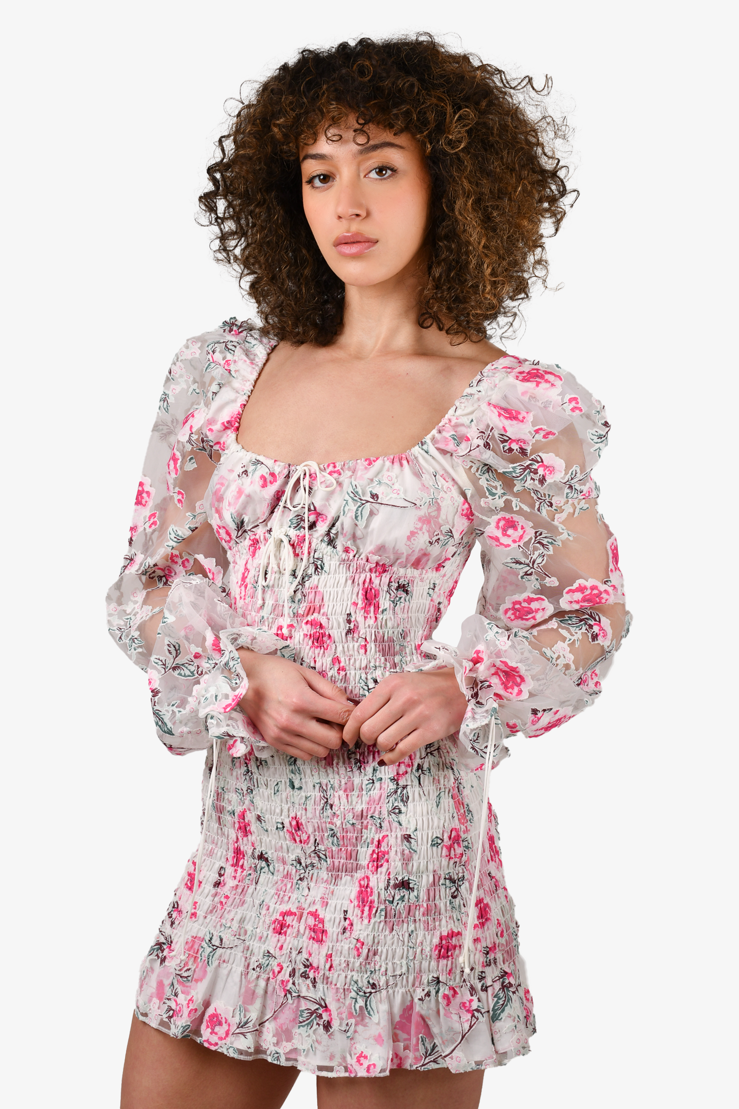 Refresh availabilityFor Love & Lemons Pink Floral Ruched Dress. Pull-on. Square neckline with cinched tie-up. Tie-up on sleeve cuffs. Tonal stitching. Original tags intact.