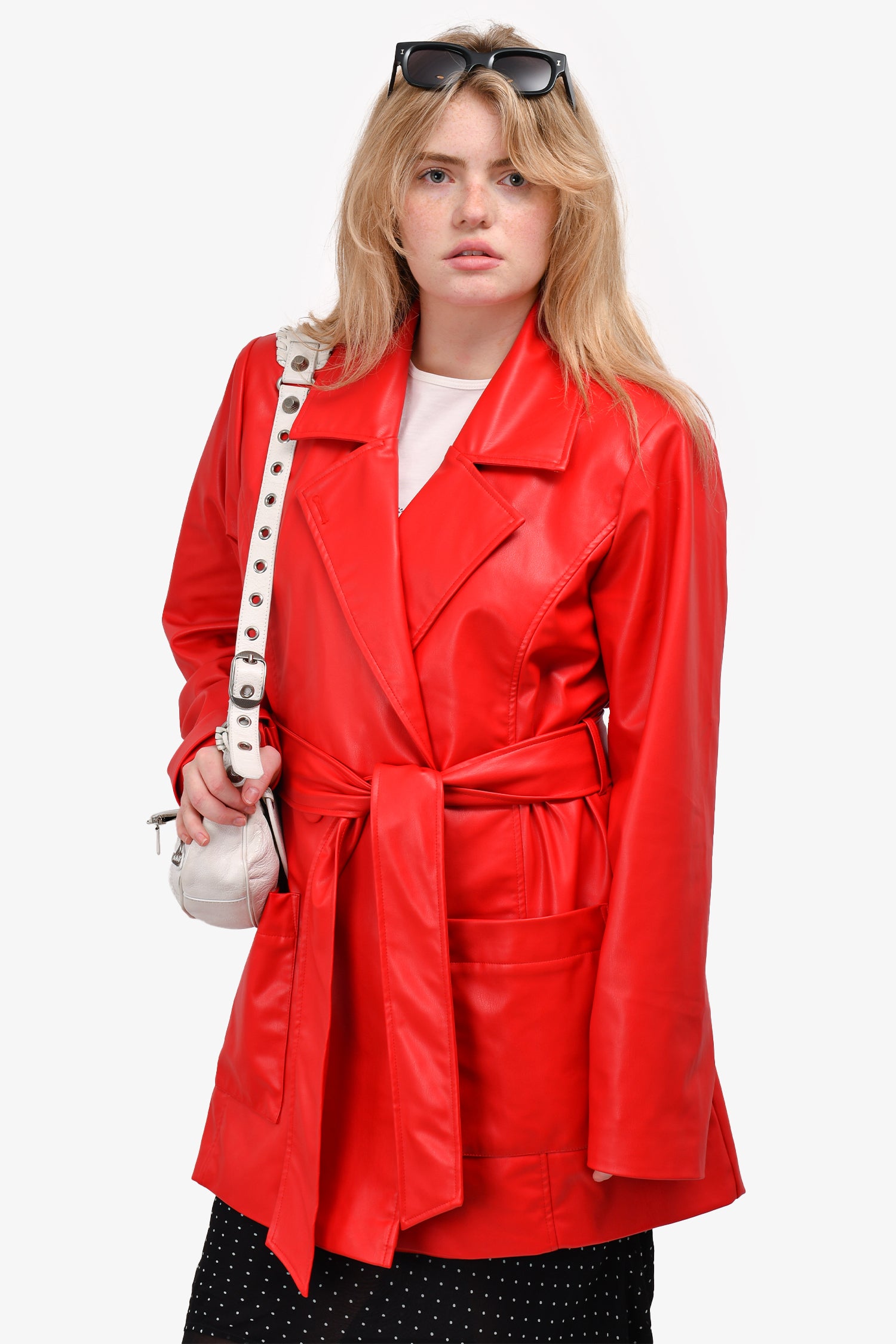 Refresh availabilityFor Love & Lemons Red Faux Leather Belted Jacket. Lined interior. 2 exterior pockets. Button closures. Tonal stitching.