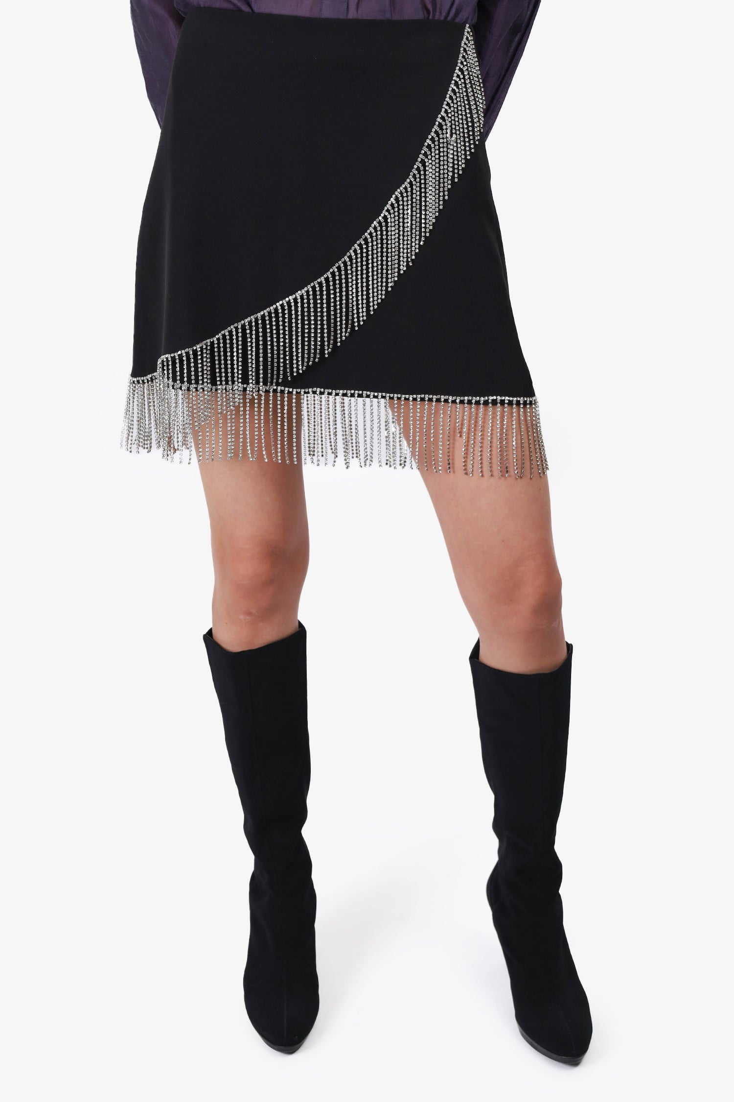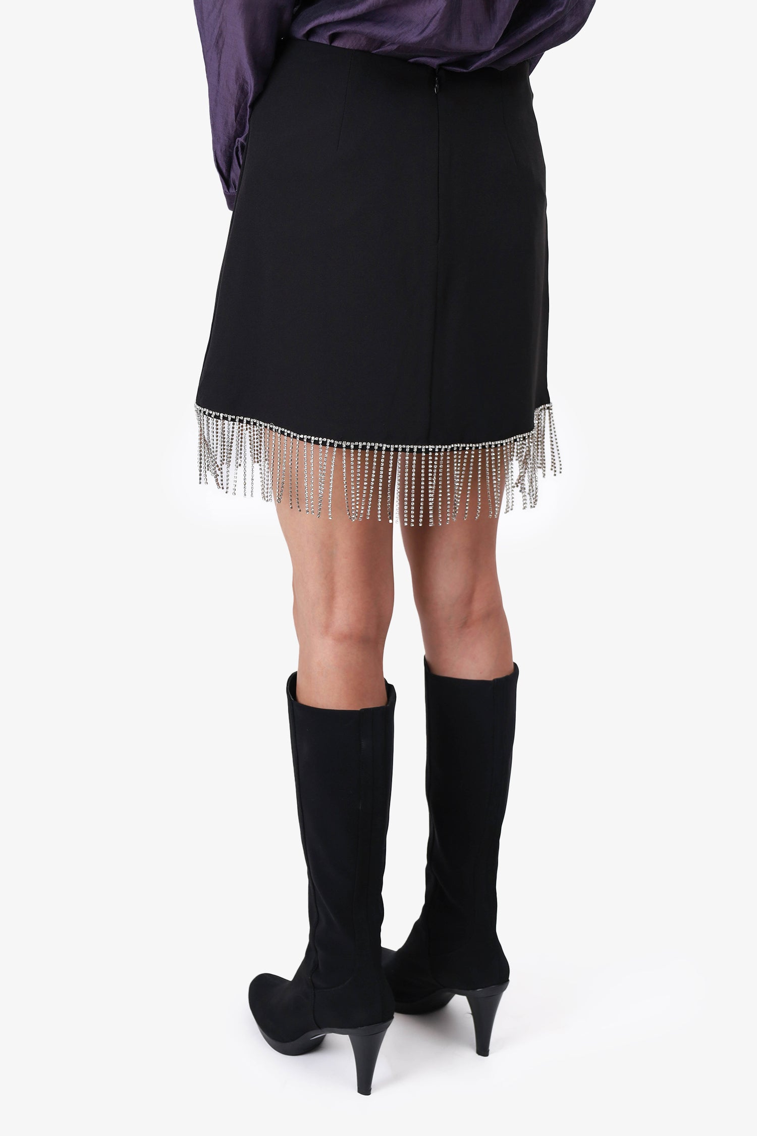 Refresh availabilityFORE Black Rhinestone Fringe Mini Skirt. Rear zip closure. Unlined. Tonal stitching. Silver-tone hardware.