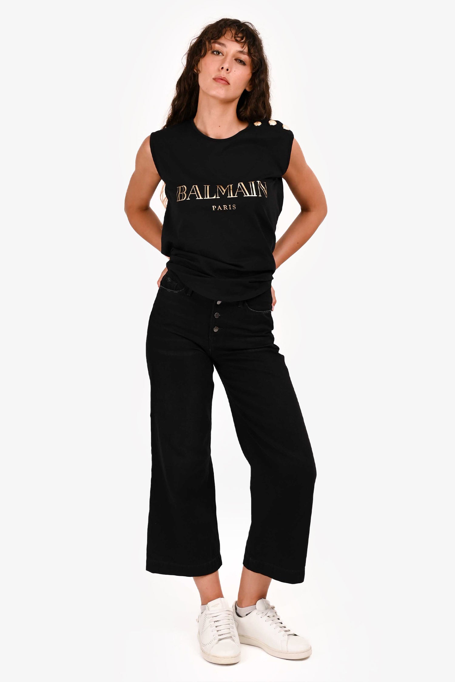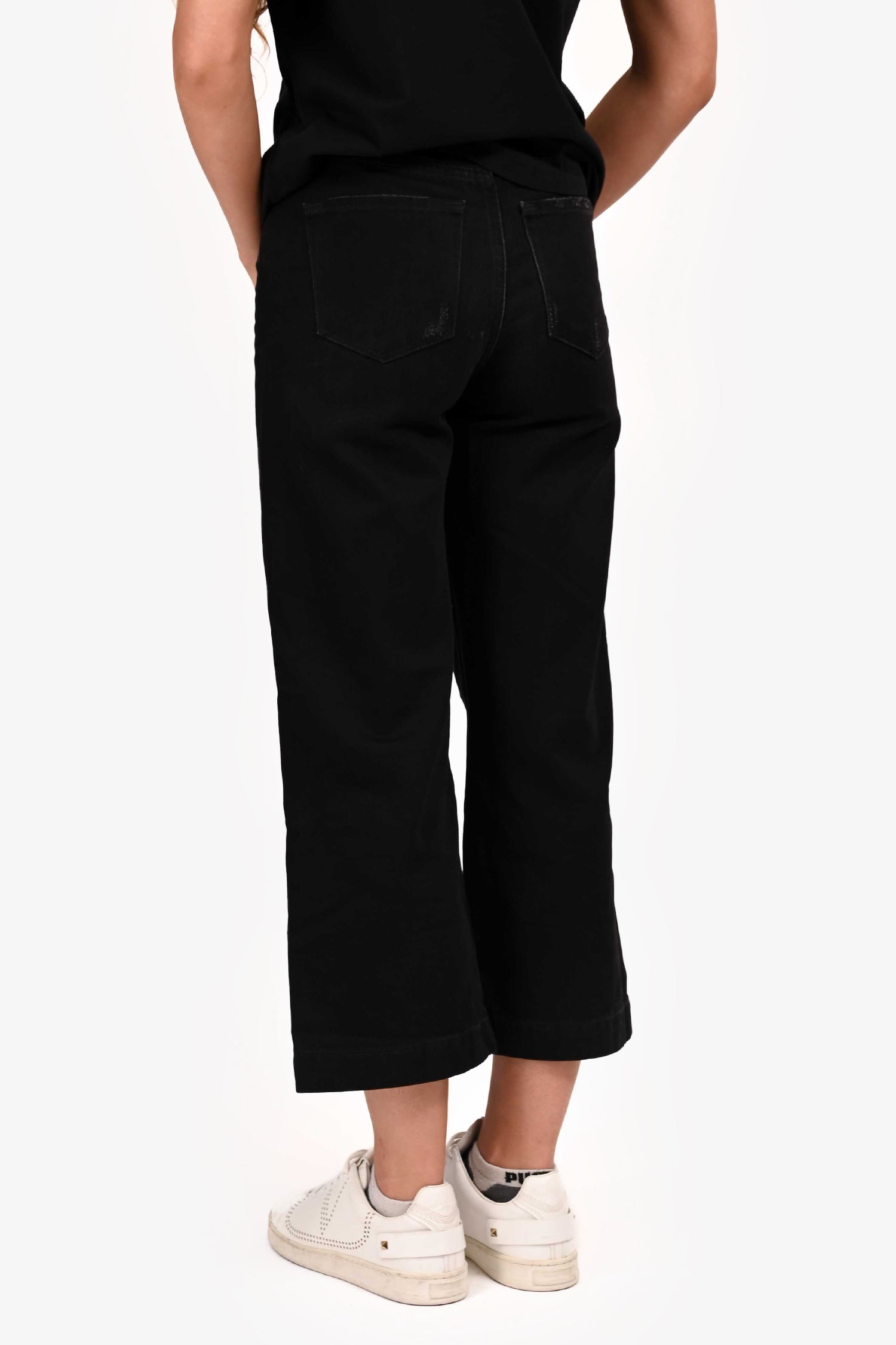 Refresh availabilityFrame Black Wash 'Ali' Wide Leg Denim. Classic five-pocket styling. Front button closure. Distressed details throughout. Tonal stitching.