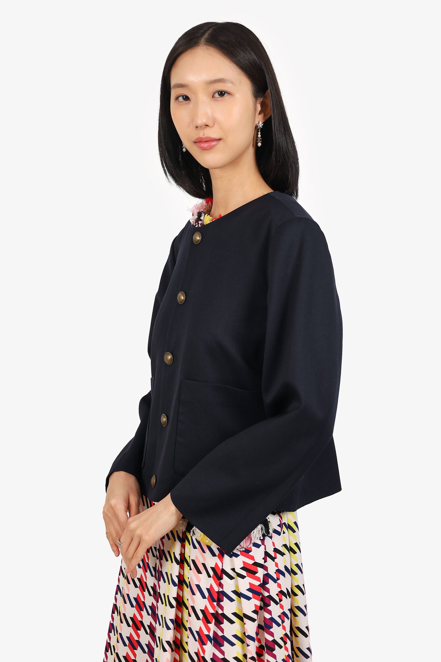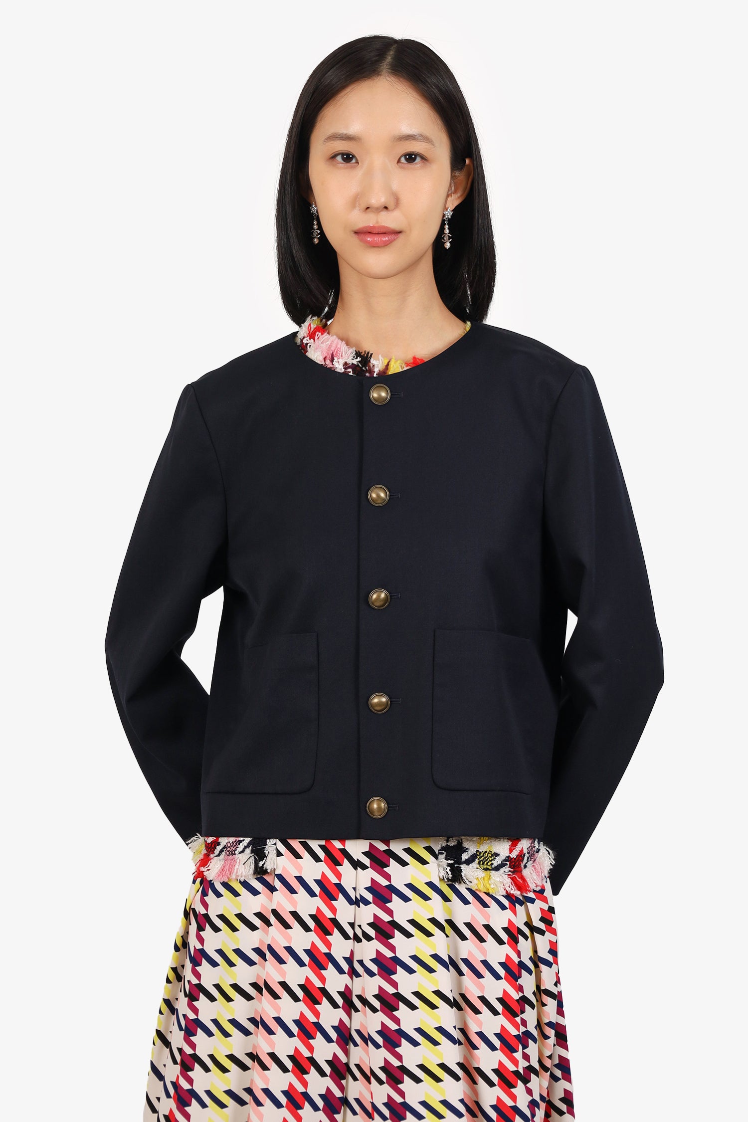 Refresh availabilityFrame Black Wool Button Down Twill Jacket. Pull-on. Round neckline. Front button-up closure. 2 front exterior slip pockets. Lined interior. Copper-tone hardware. Tonal stitching.
