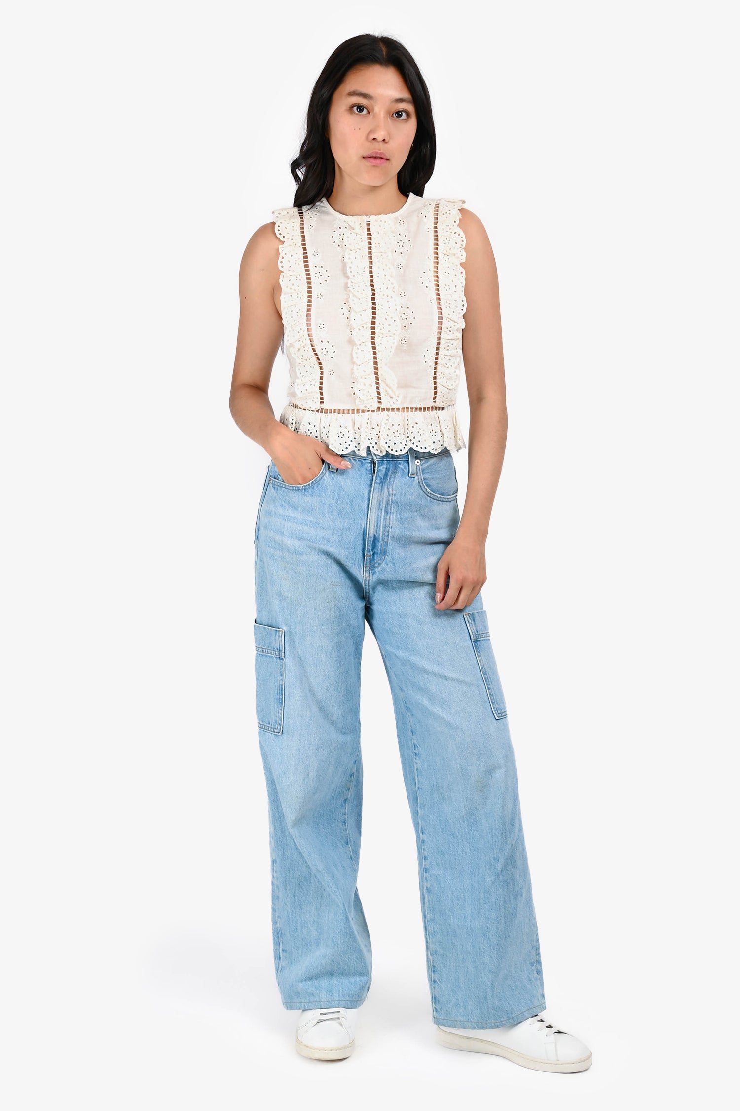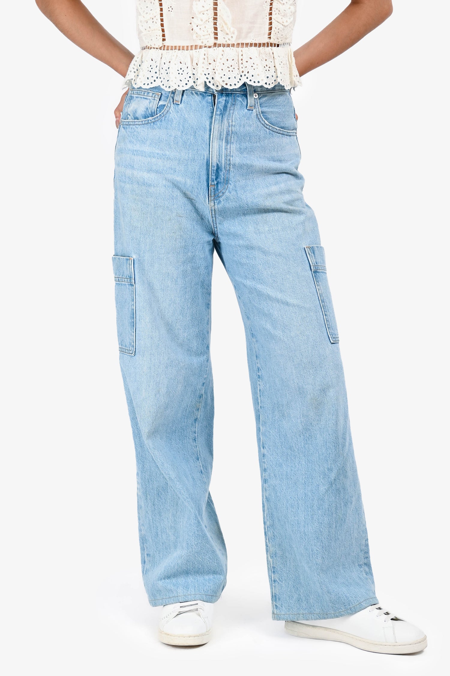 Refresh availabilityFrame Blue Cargo Wide Leg Jeans. Button and zip fly closure. Side and back pockets with additional cargo pockets on legs. Contrast stitching.