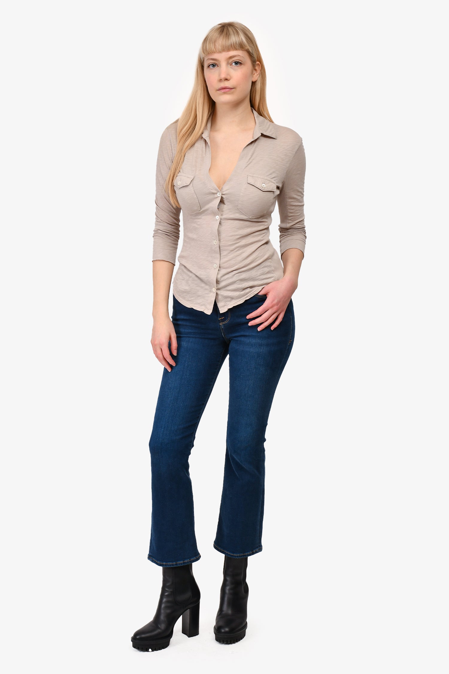 Refresh availabilityFrame Blue Denim Dark Wash Flare Jeans. Zip-up with a button closure. 5 slip pockets. Belt loops. Contrast stitching.