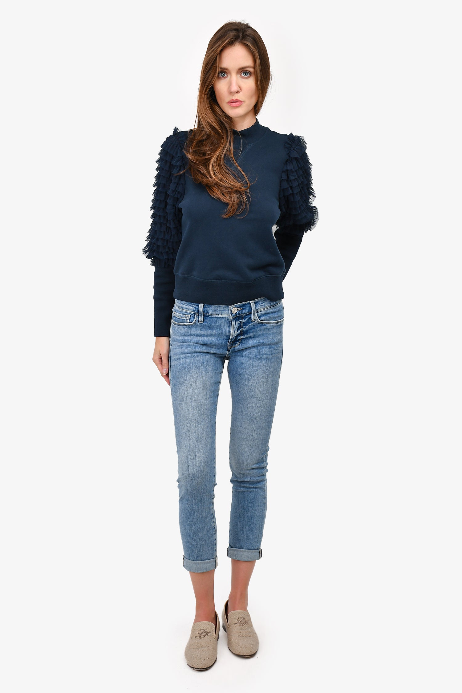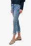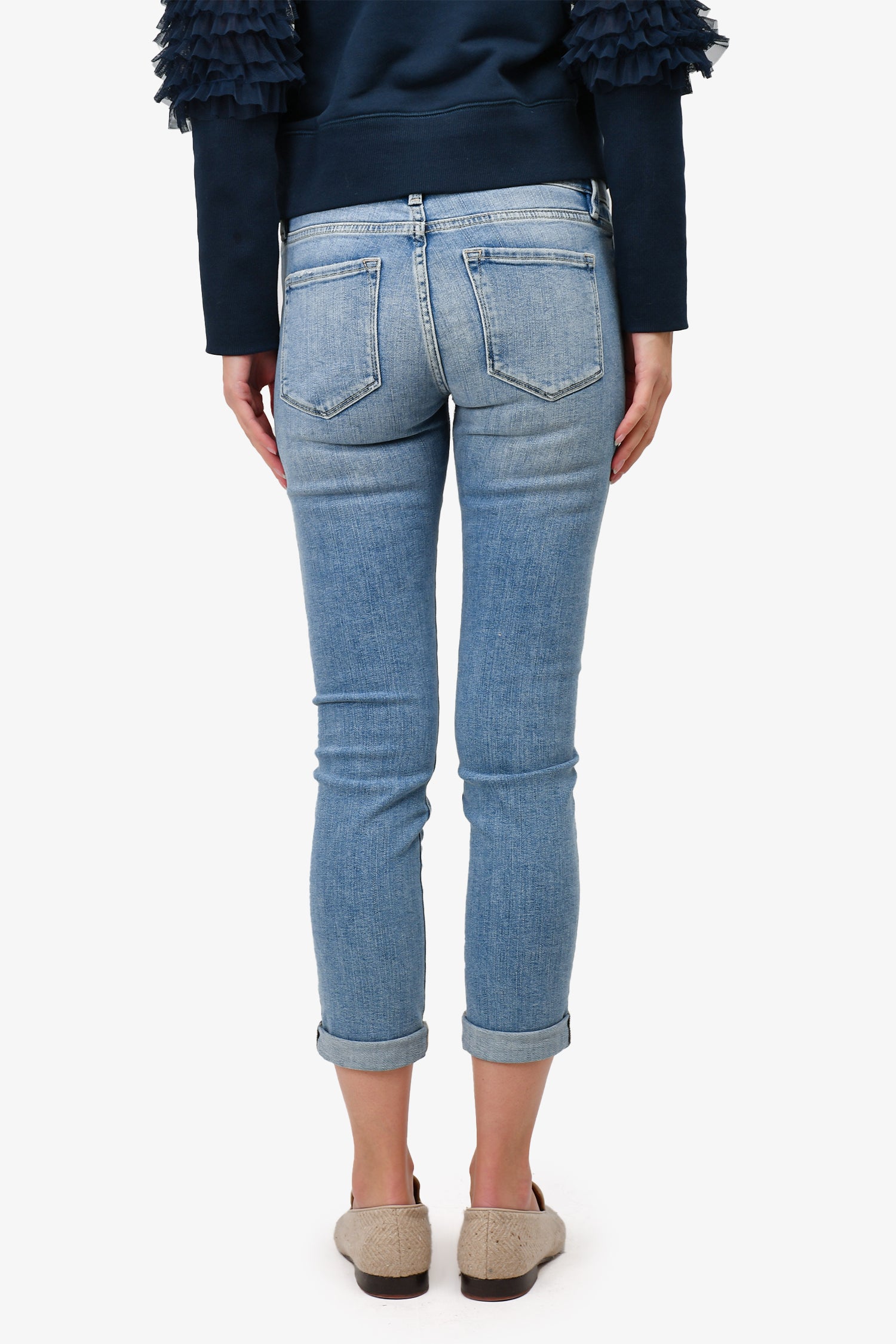Refresh availabilityFrame Blue Denim Light Wash Jeans. Low-rise waistline. Front button and zip-up closure. Silver-tone hardware. Five-pocket design. Cuffed at the hem. Tonal stitching.