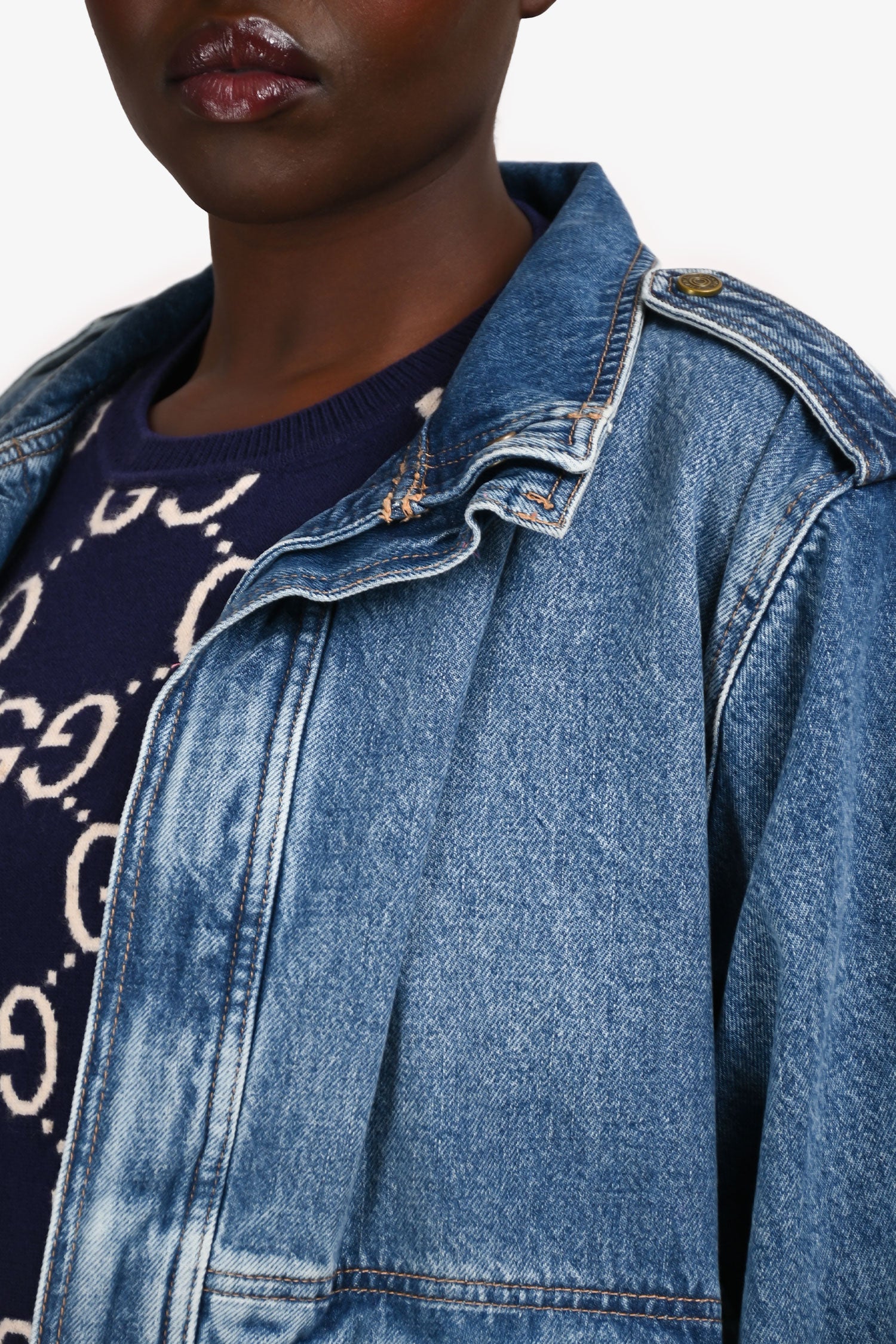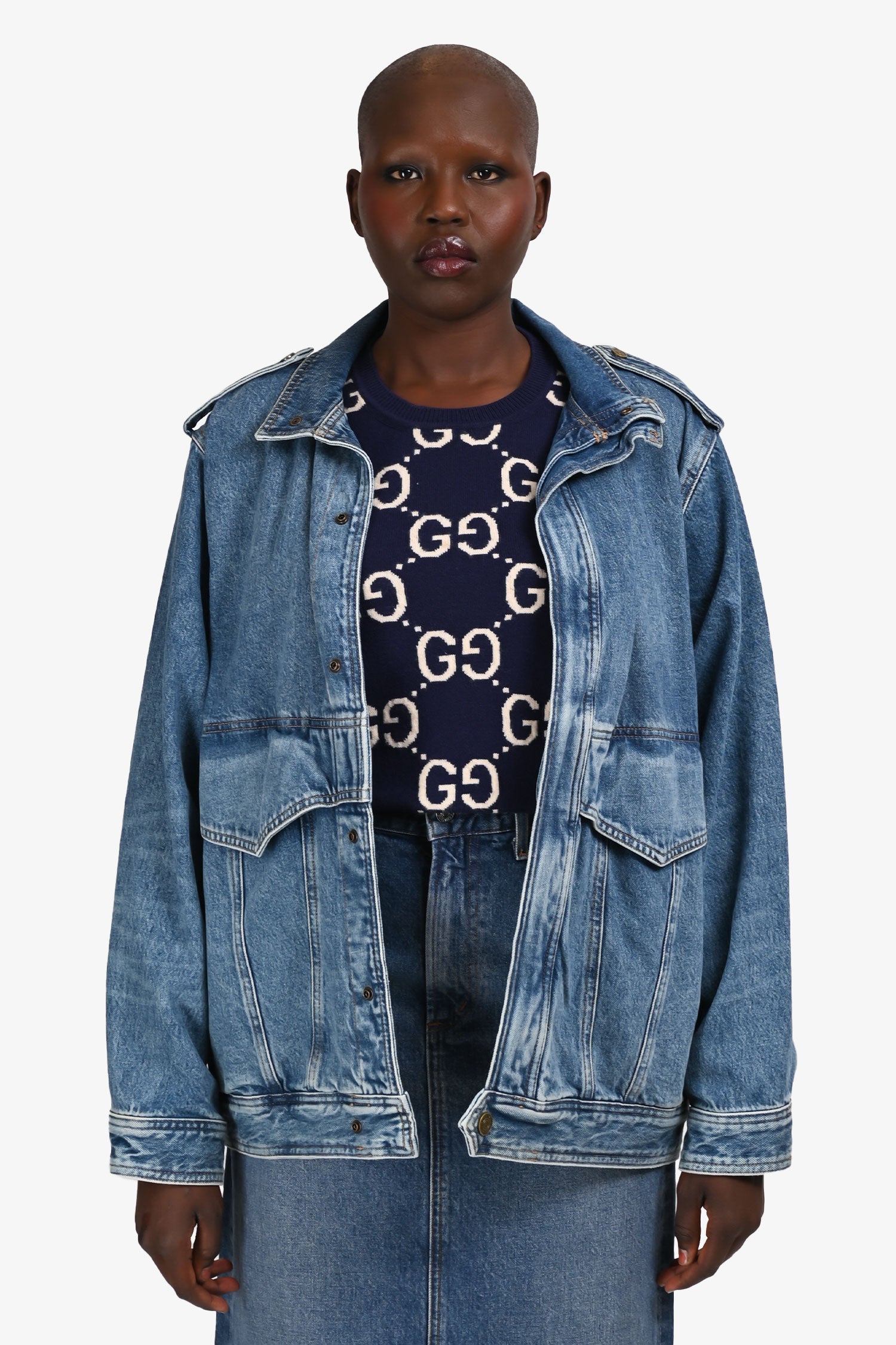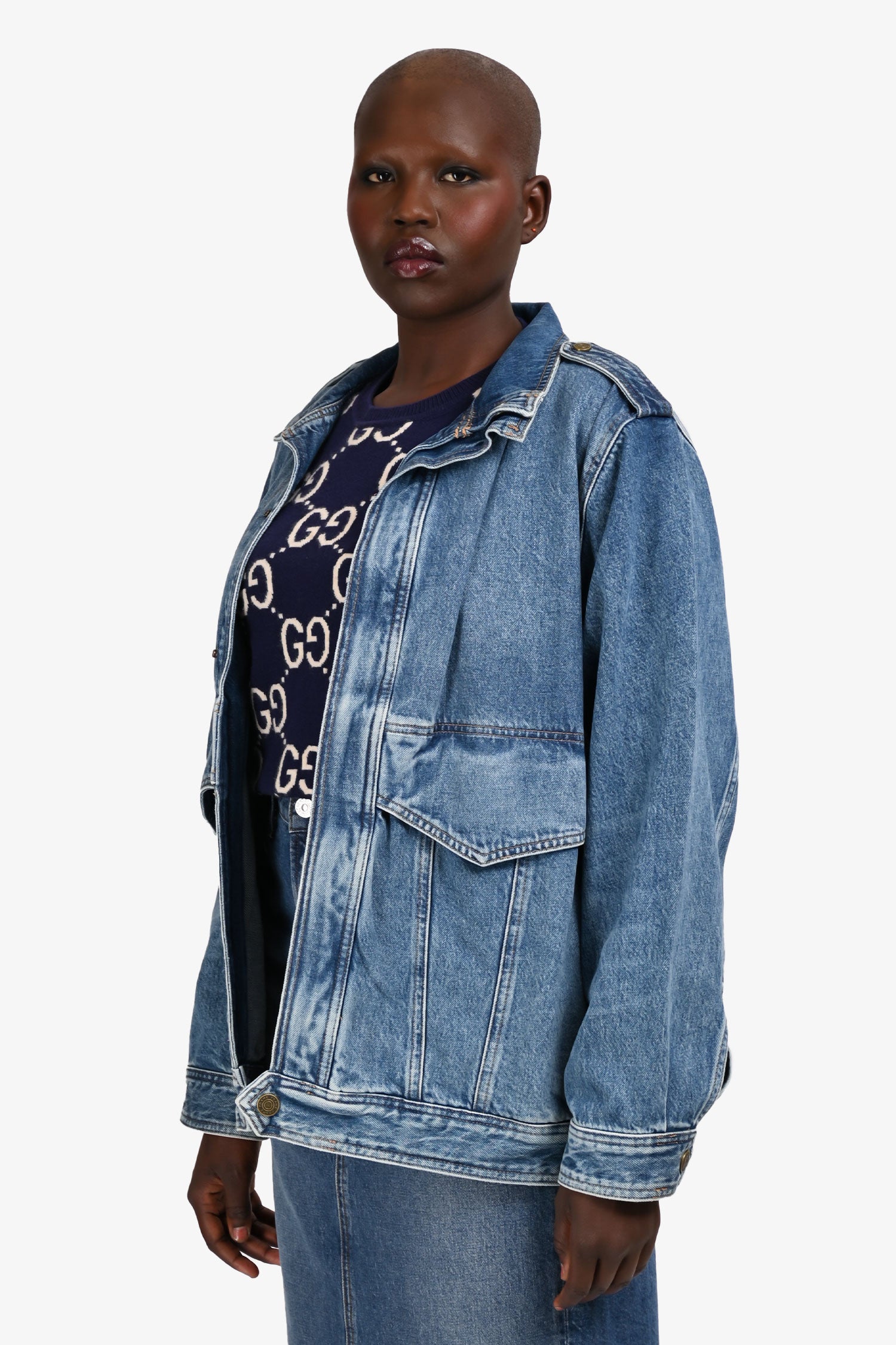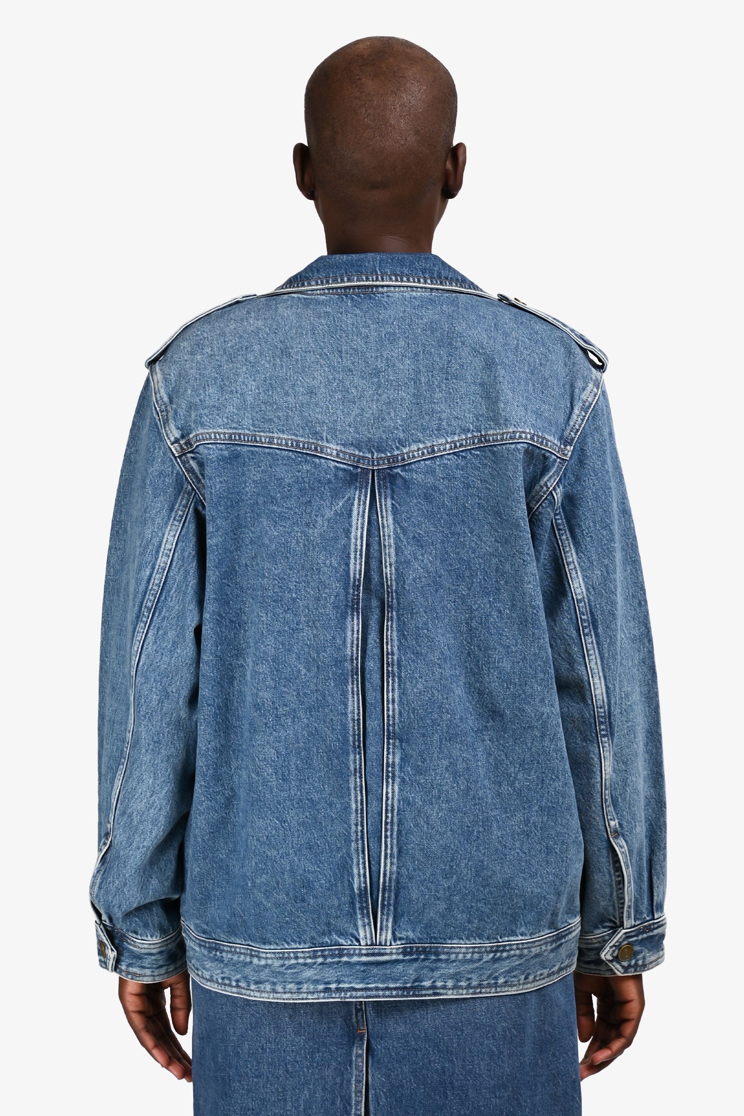 Refresh availabilityFrame Blue Denim Oversized Button Down Jacket. Pull-on. Hidden snap closure in the front. 2 exterior slip-in pockets with fold-over closure, and 2 side pockets. Tonal stitching.