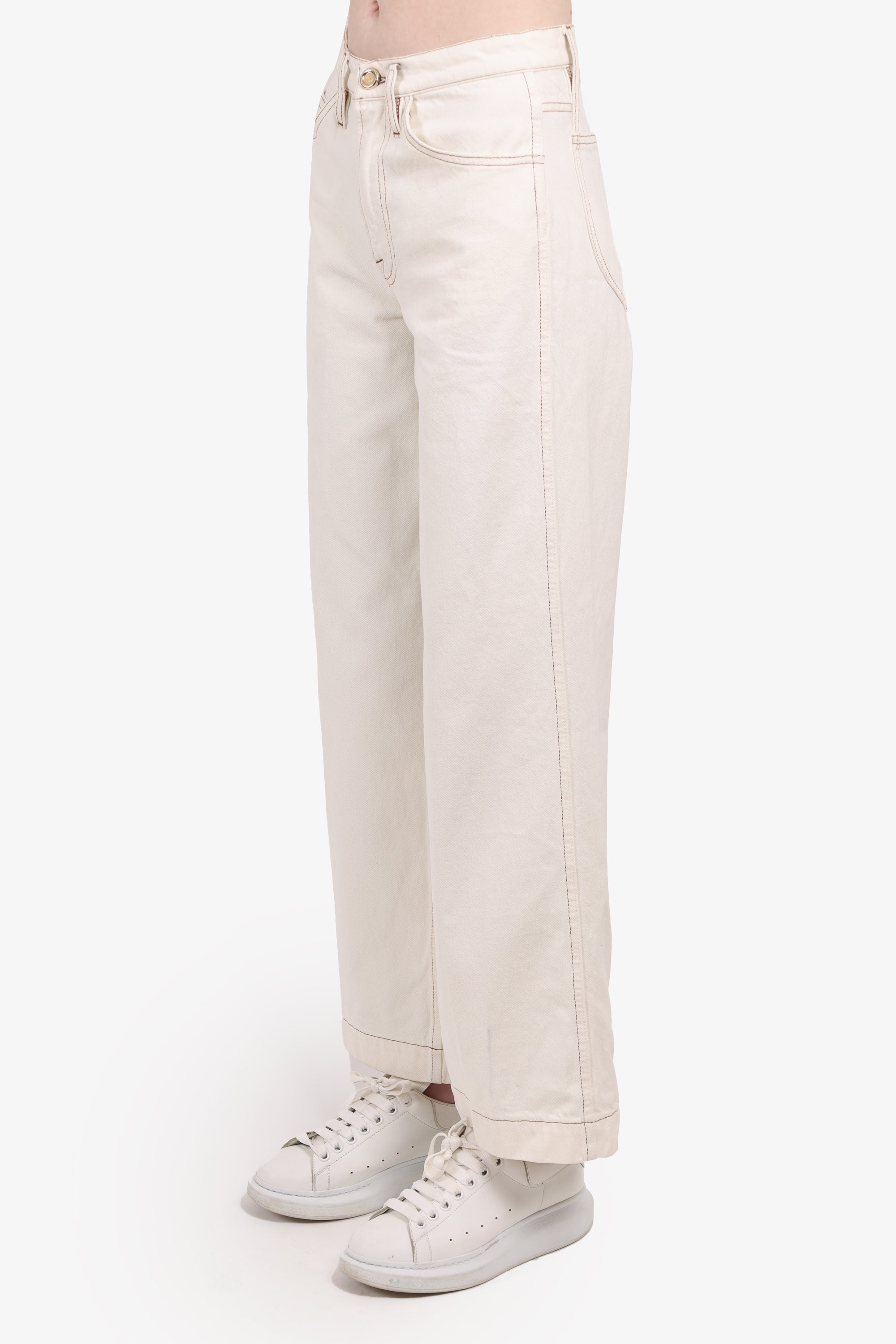Frame Cream Wide Leg 'Pixie' Jeans. Front button and zipper closure. Front and back slip pockets. Gold-toned hardware. Brown stitching.