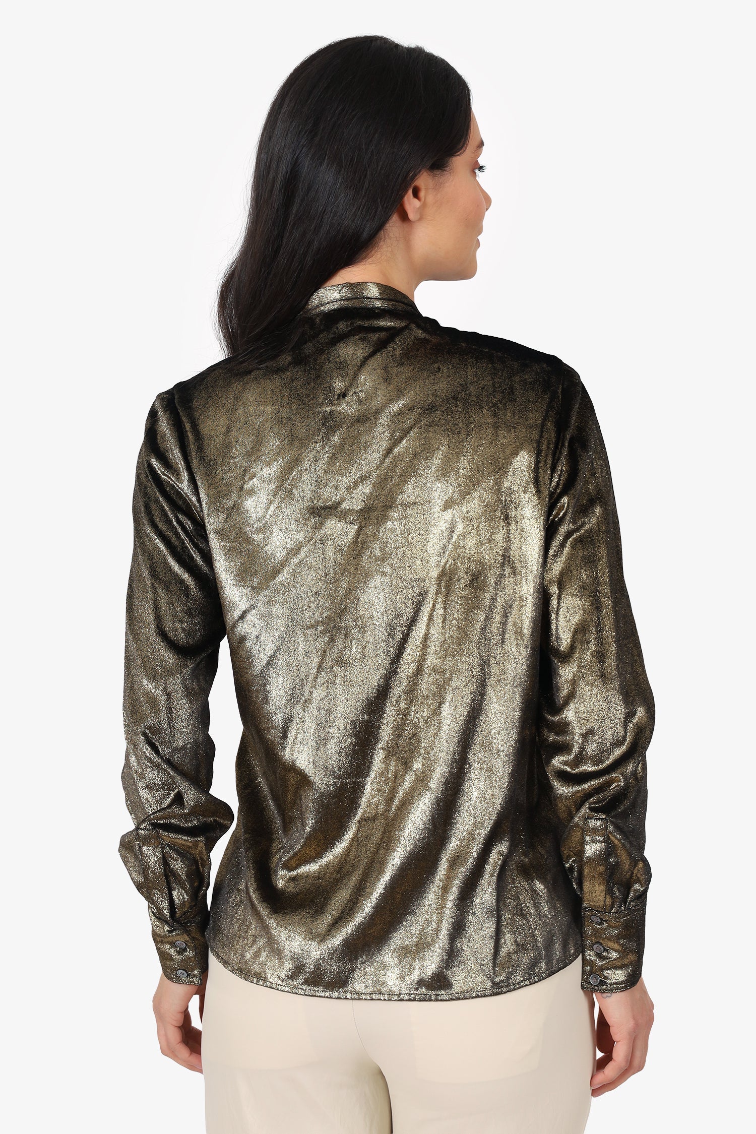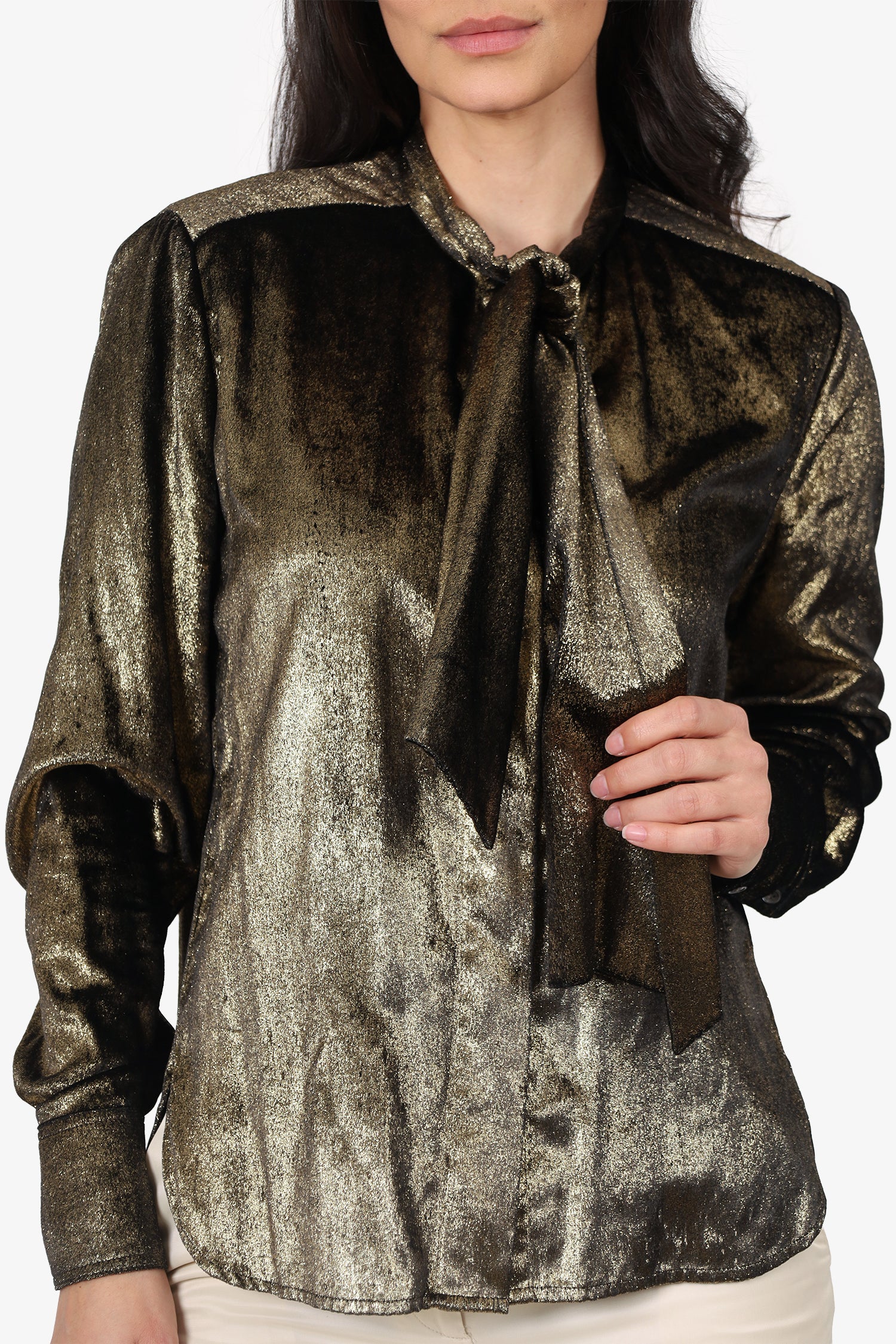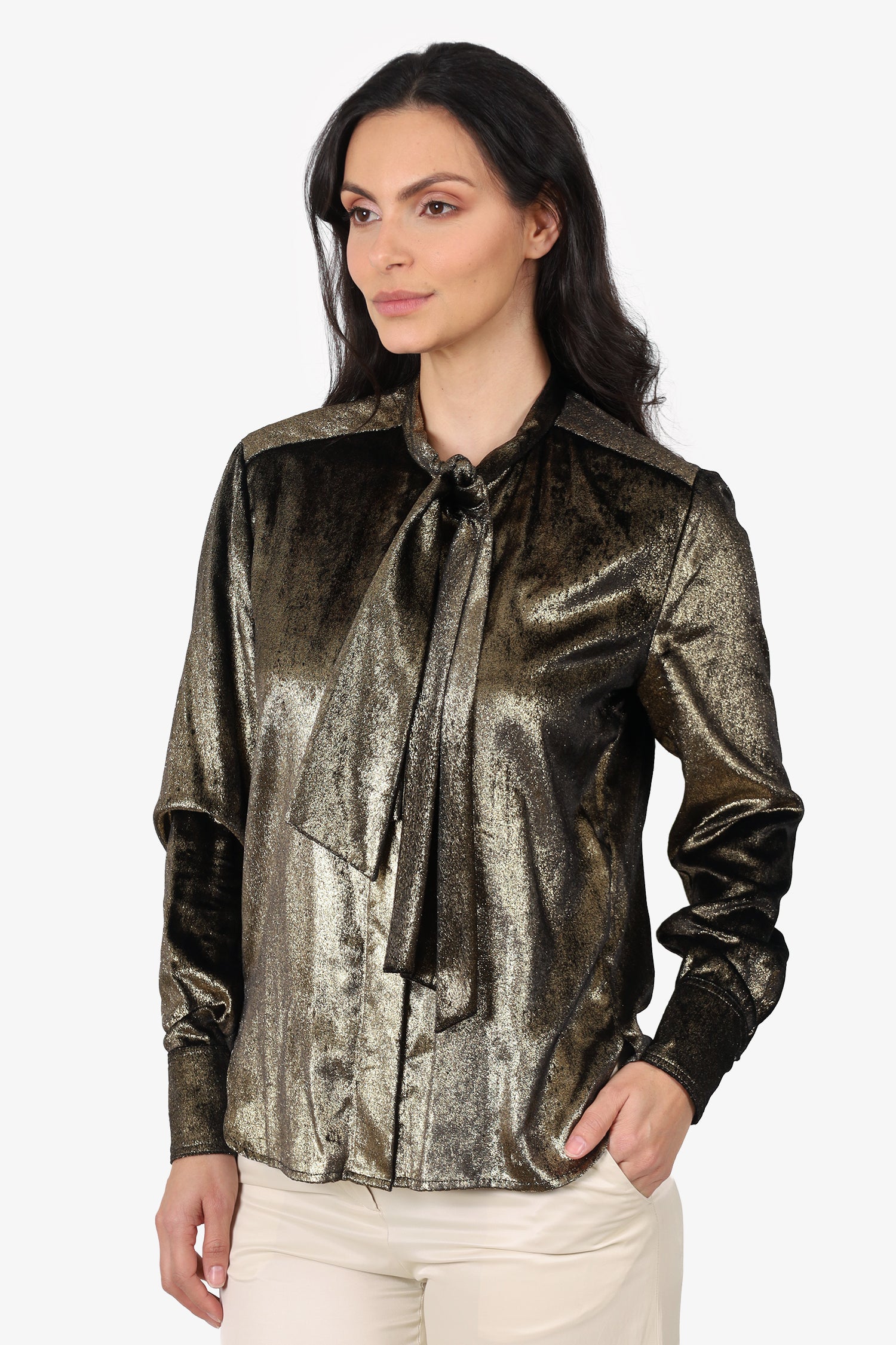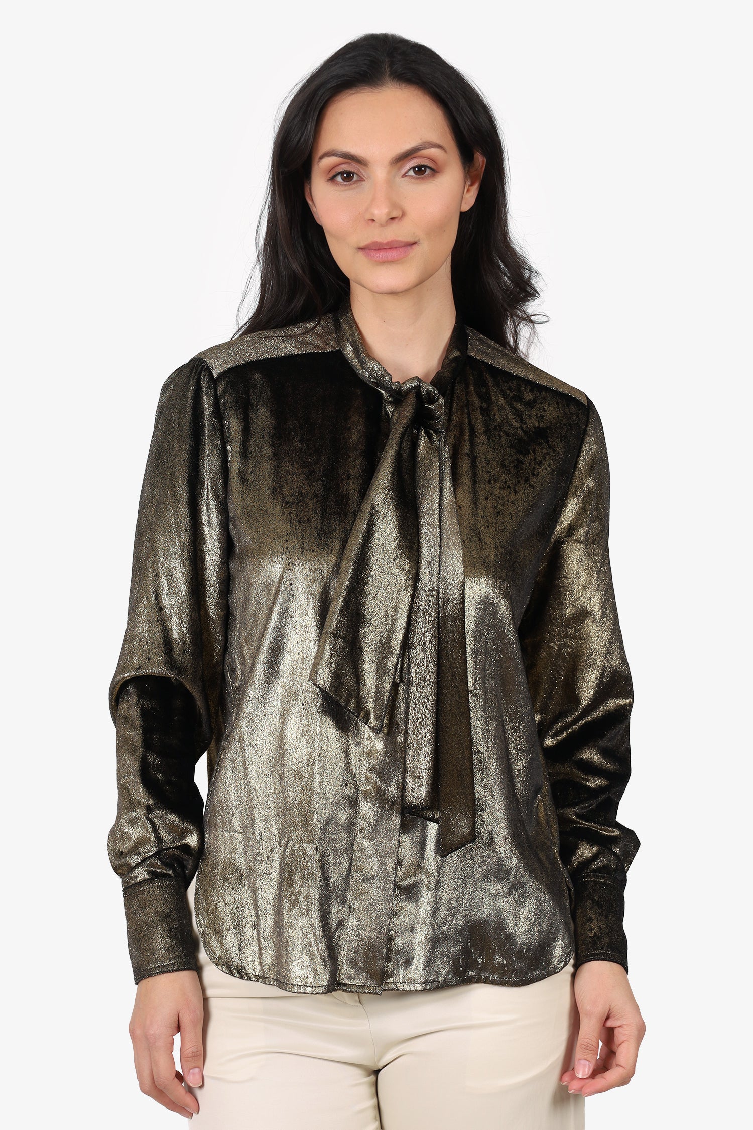 Refresh availabilityFrame Gold Metallic Tie Front Blouse. Pull-on. Round neckline with tie-up closure. Front button-up closure. Sleeve cuffs with button-up closure. Tonal stitching.
