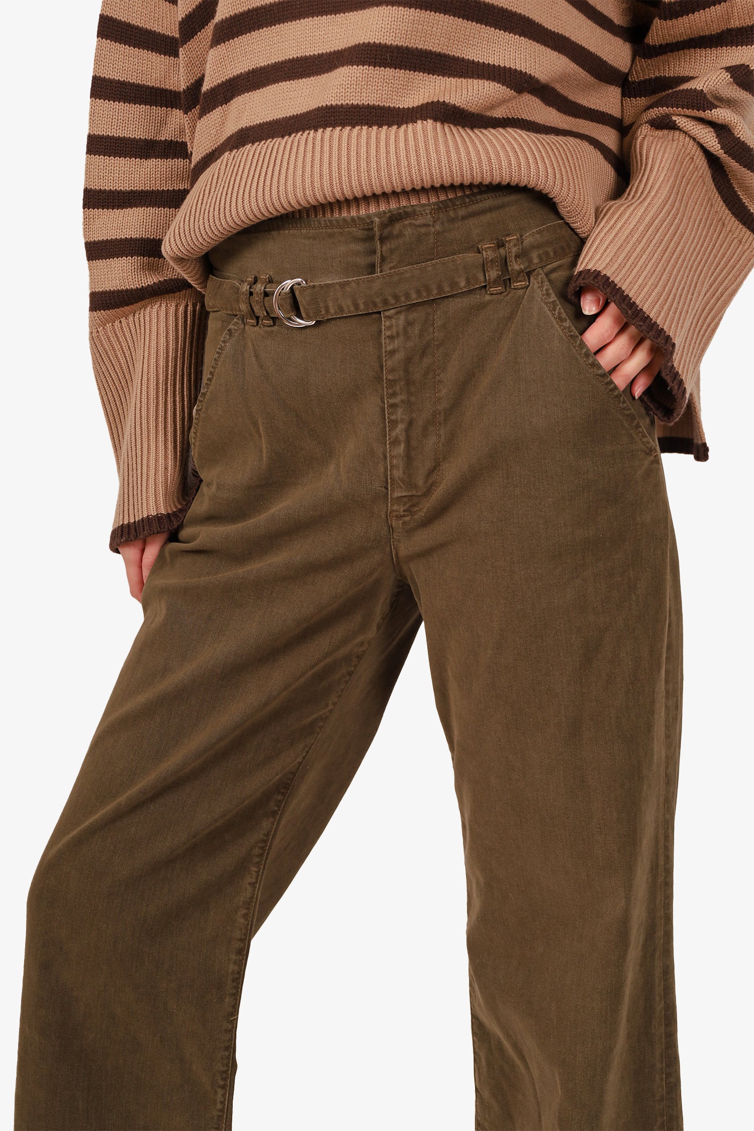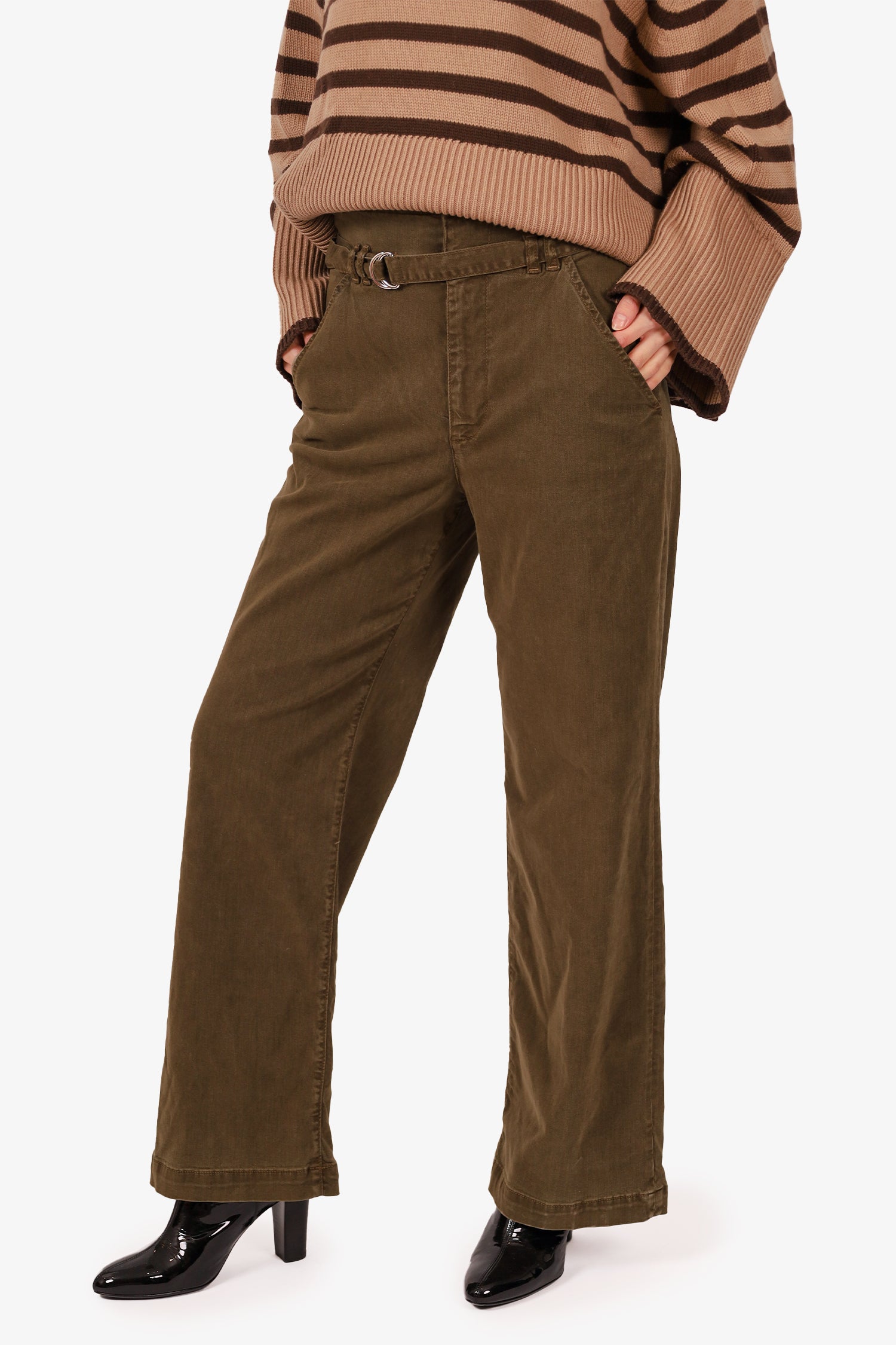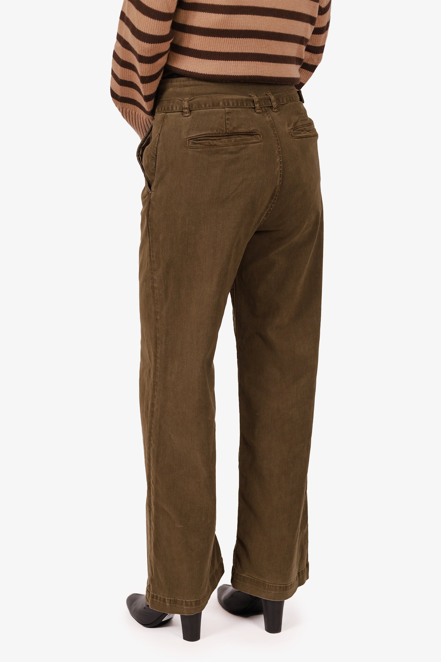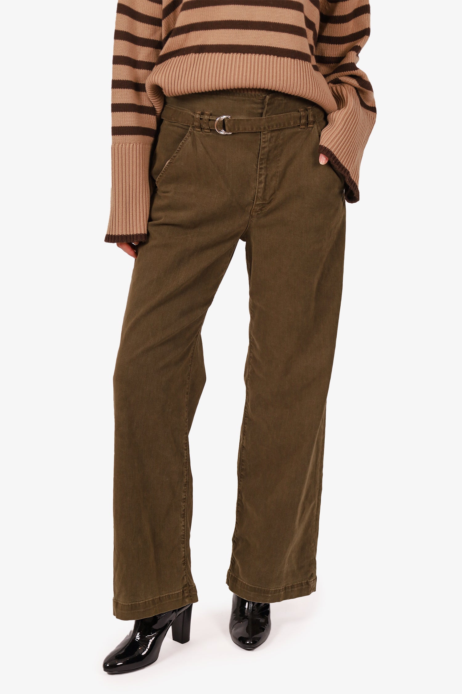 Refresh availabilityFrame Green Wide-Leg Pants. Front zip with hook and button-up closure. 2 front slip pockets and 2 rear slip pockets. Waistband belt loops with removable pull-through belt. Silver-tone hardware. Tonal stitching.