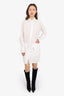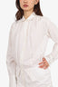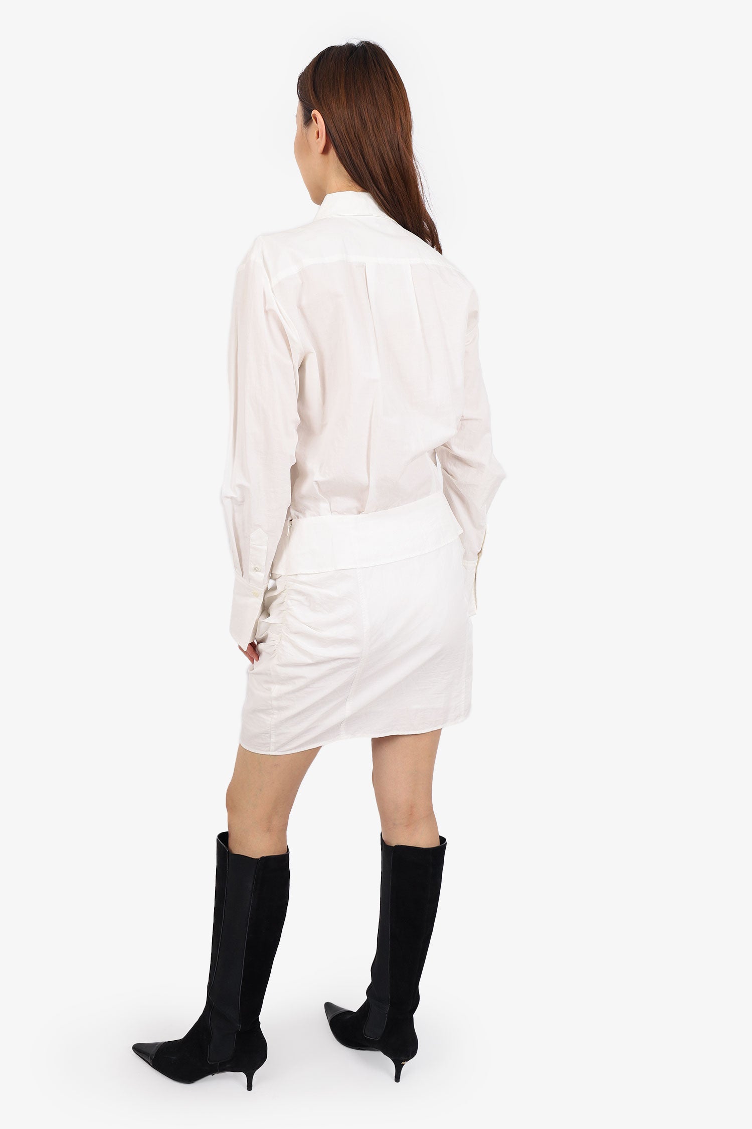 Refresh availabilityFrame White Cotton Button Down Shirt Dress. Collared neckline. Front button-up closure. Side zip and snap button closure. Button sleeve cuff closure. Ruching details on sides of dress and along sleeves. Fold-over panel detail along waistline. Unlined. Tonal stitching.