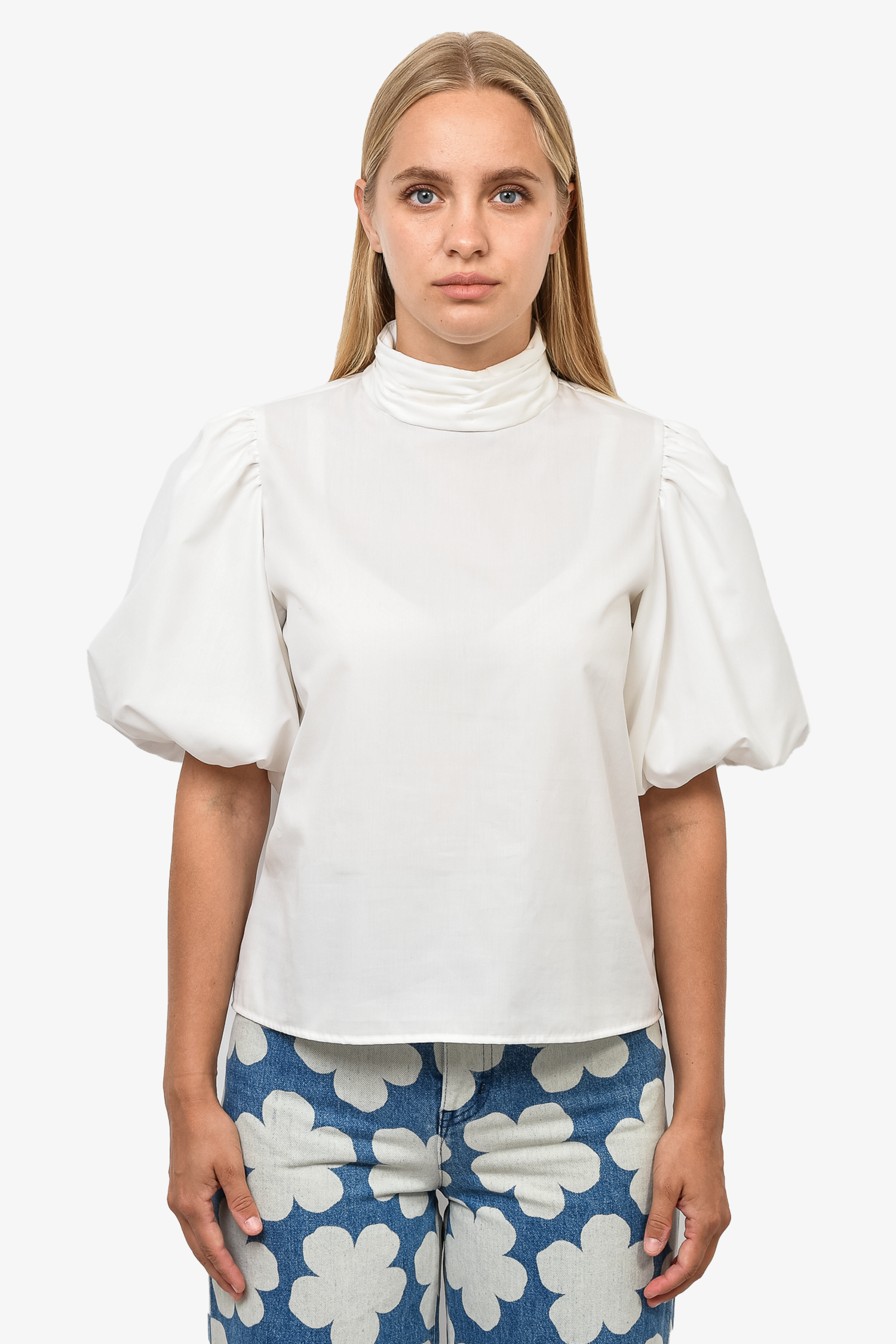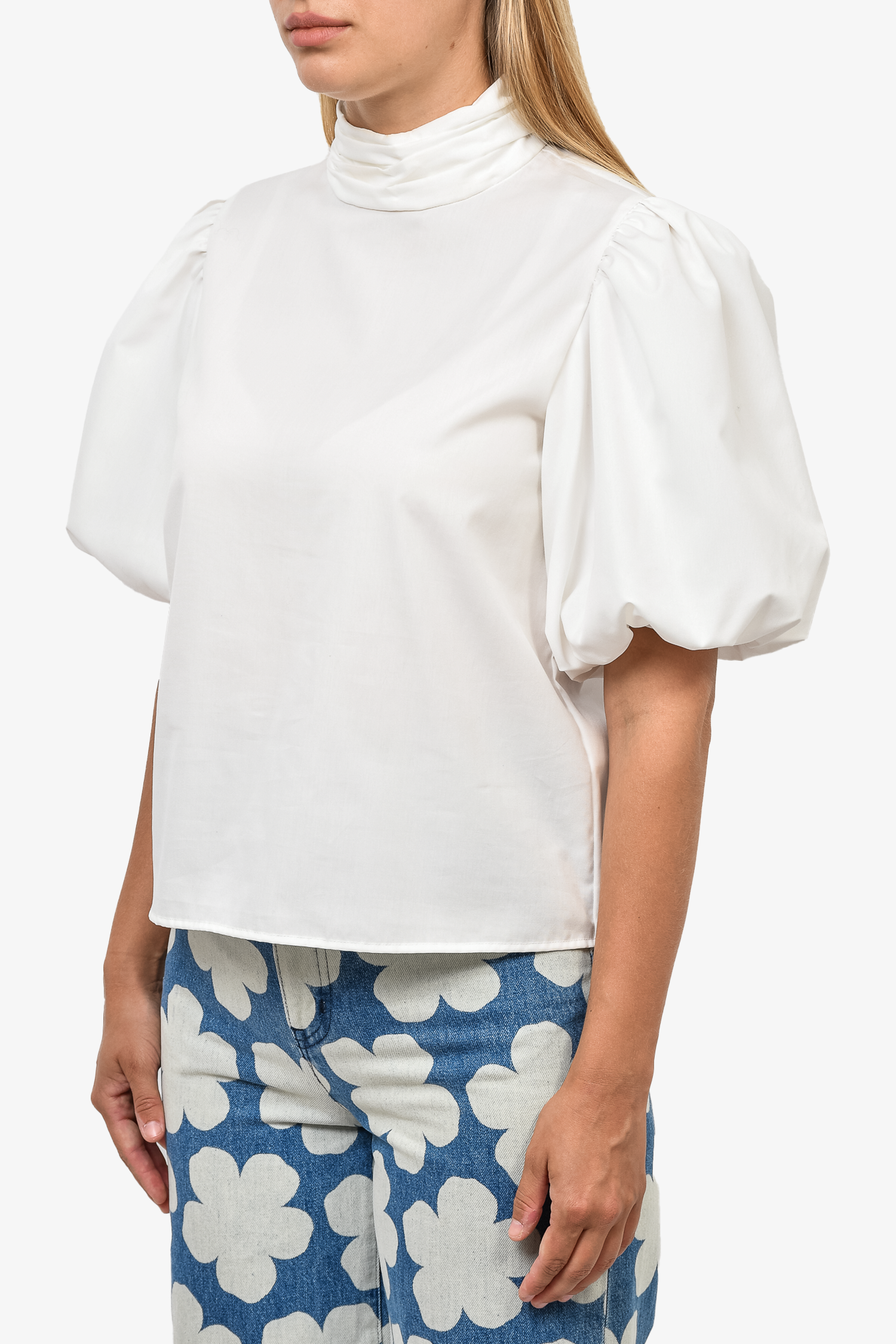 Refresh availabilityFrame White Cotton Puff Sleeve High Neck Top. Button closures. Elasticized waist. Tonal stitching.