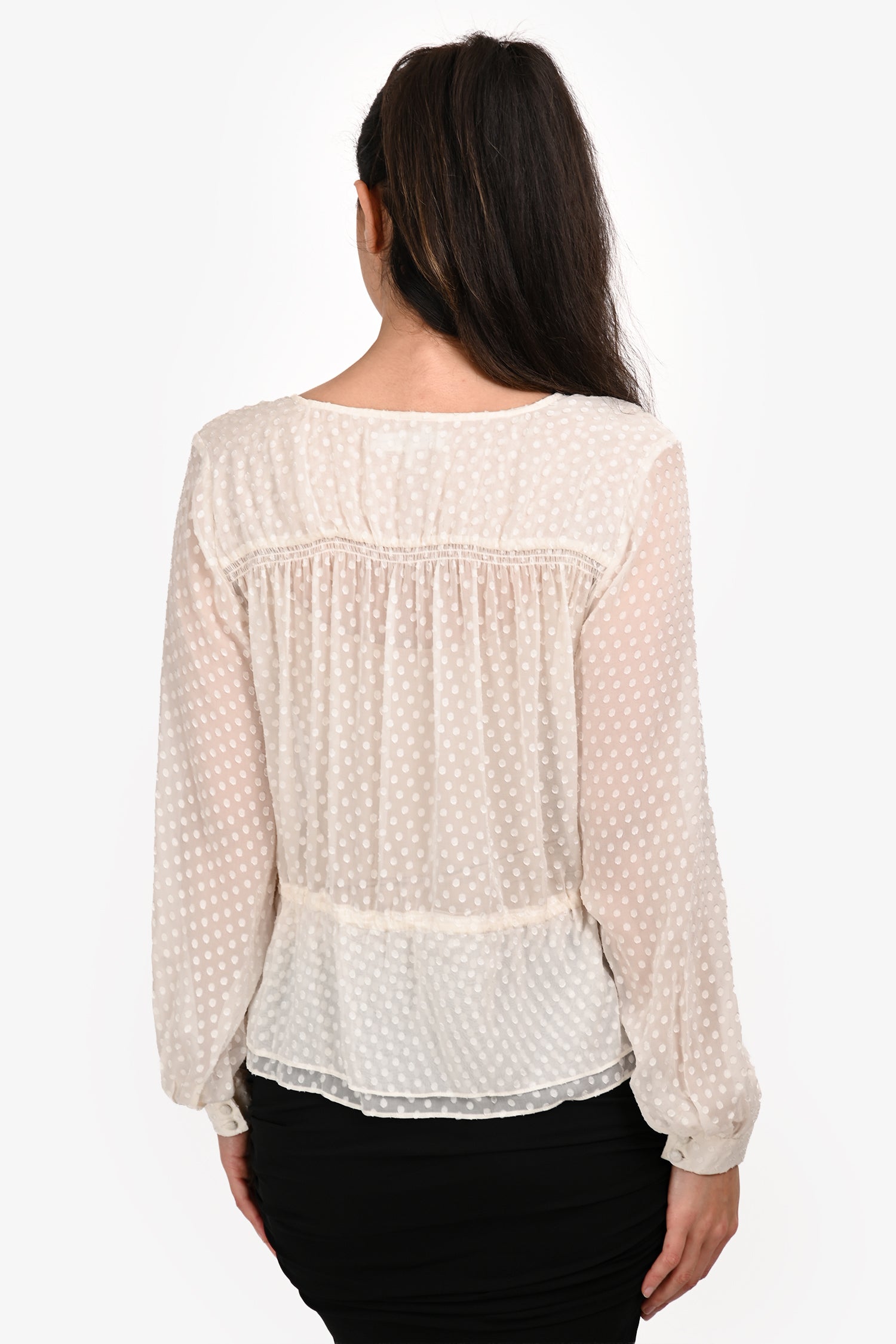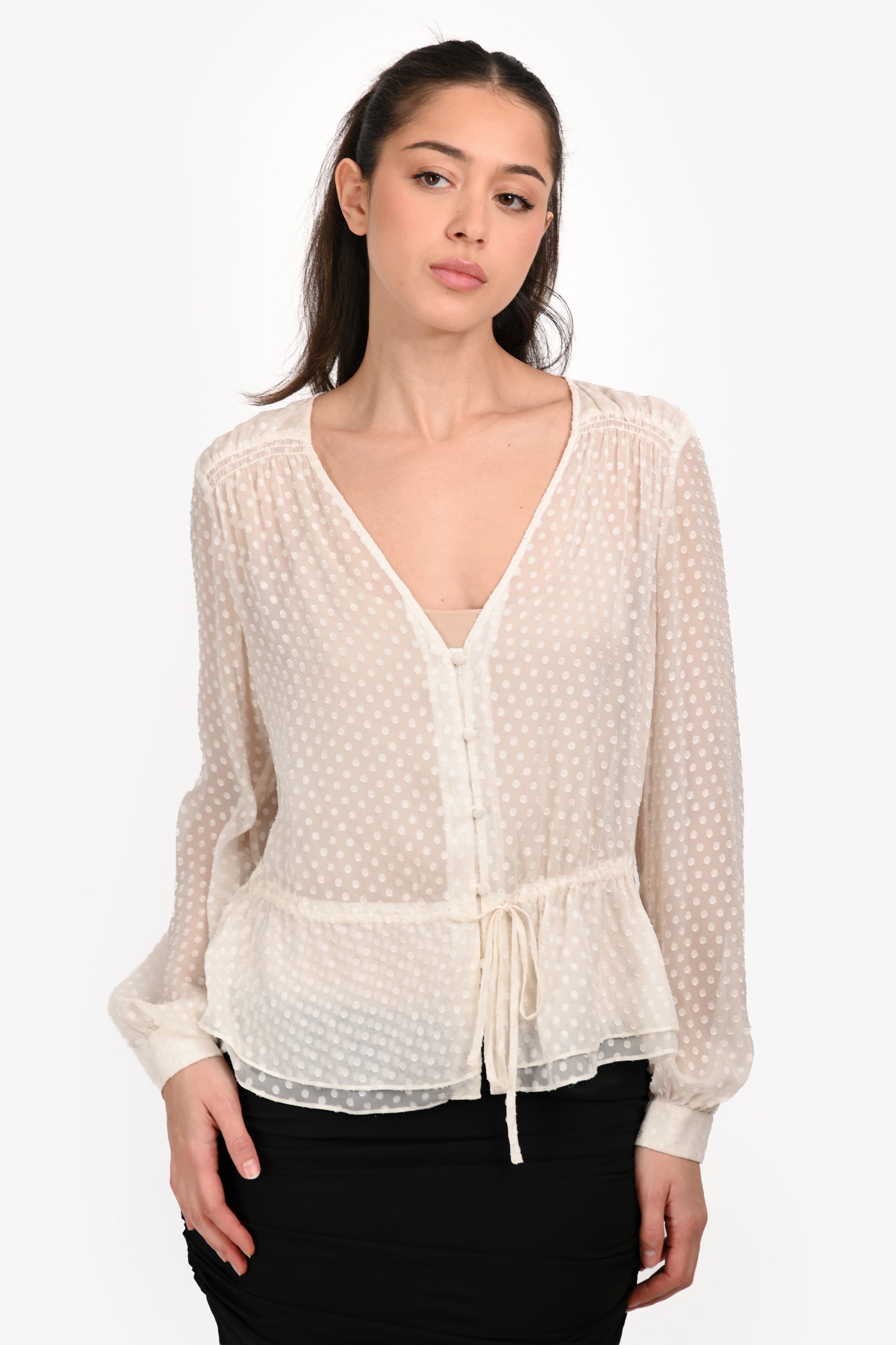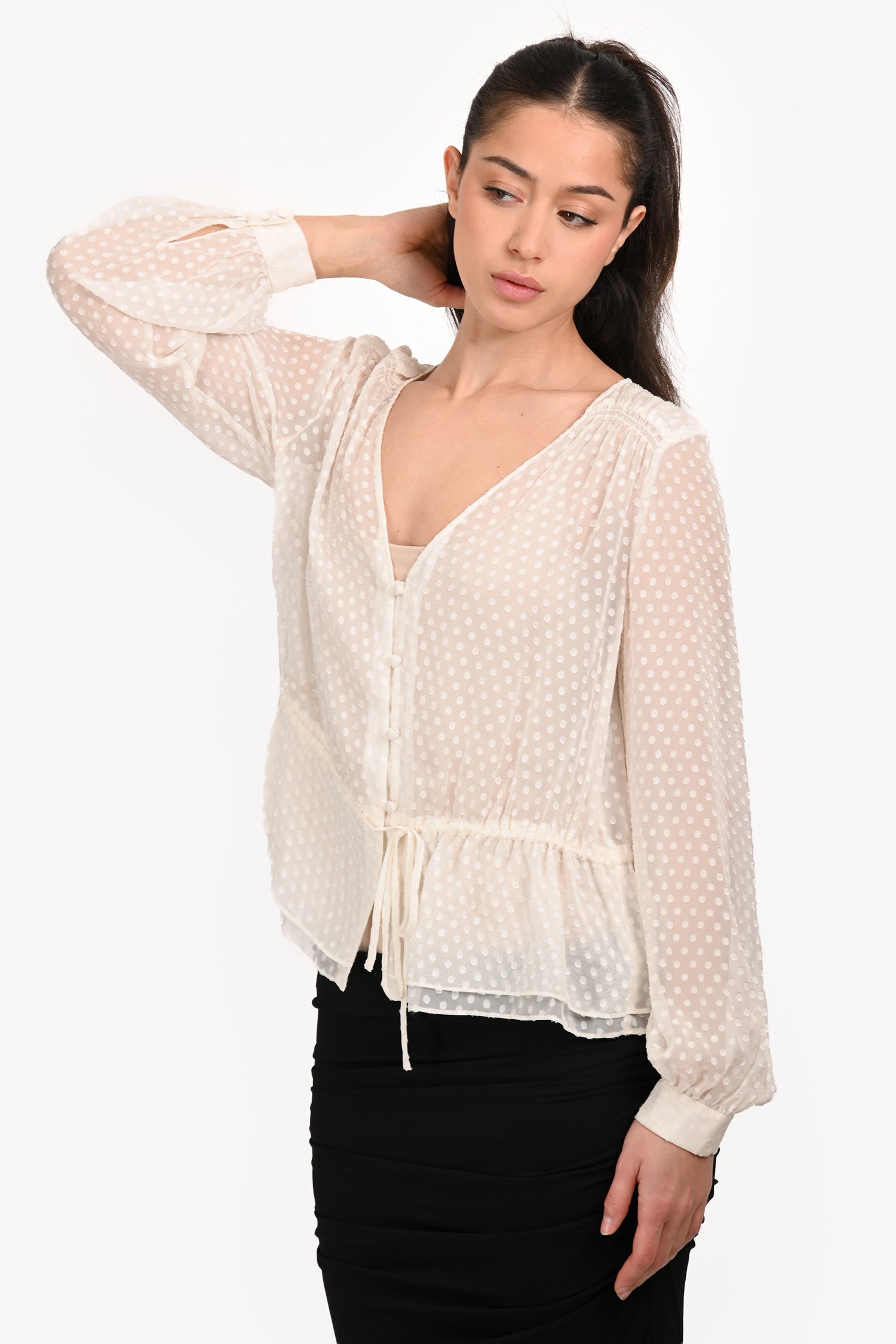 Refresh availabilityFrame White Silk Polka Dots Blouse. V-Neckline. Front button-up closure. Tie-up closure on the hemline. Sleeve cuffs with button closures. Tonal stitching.