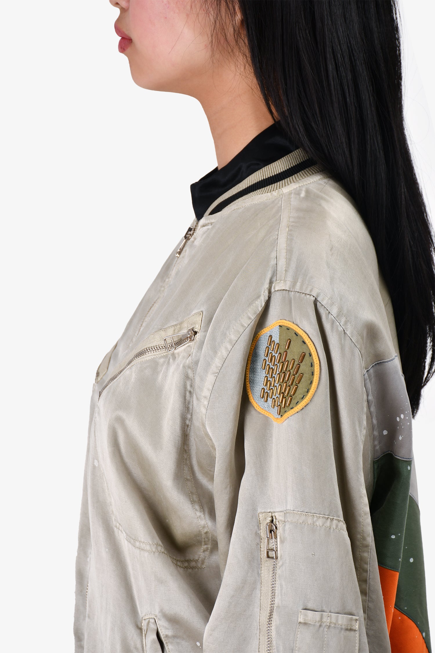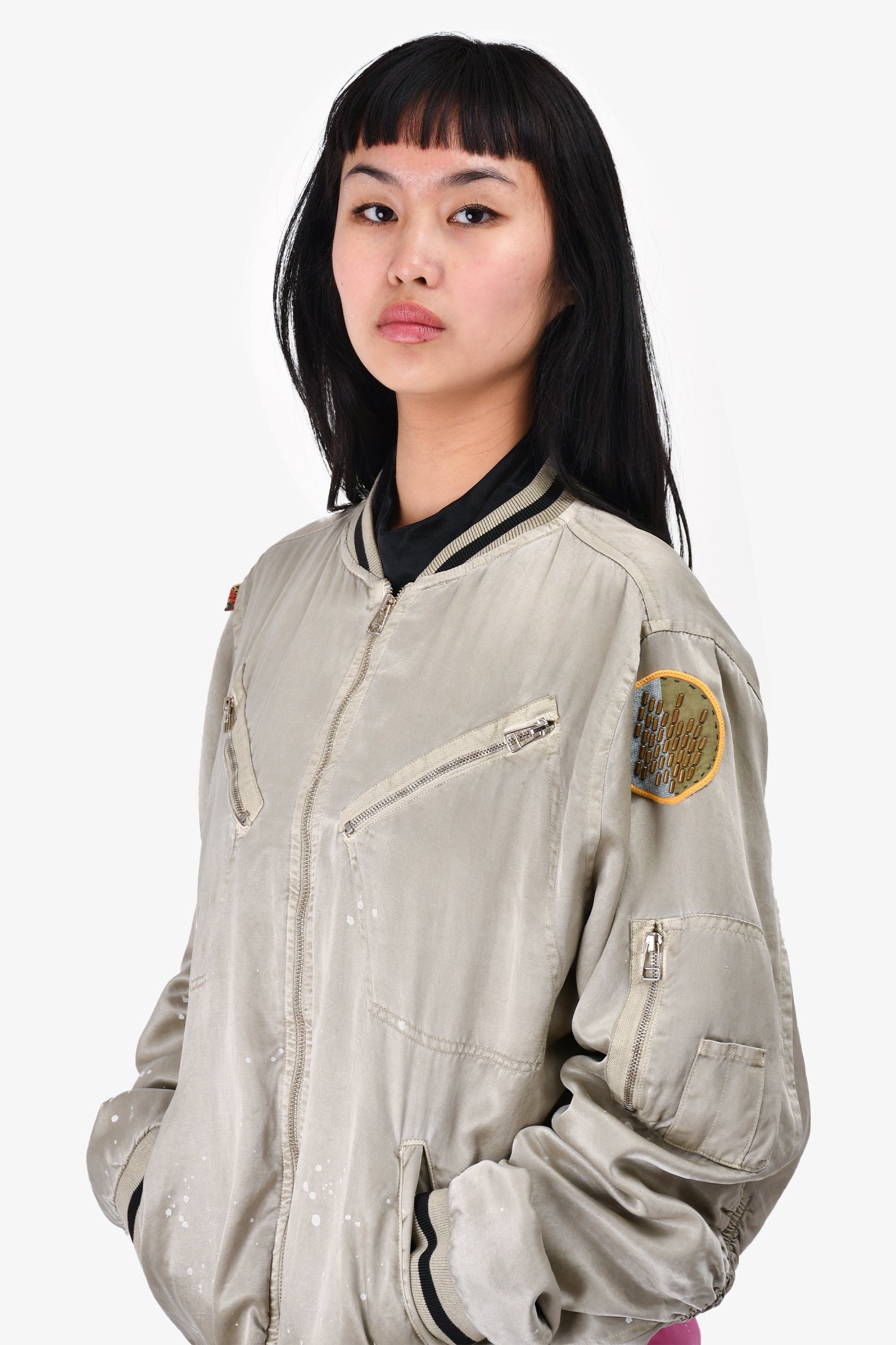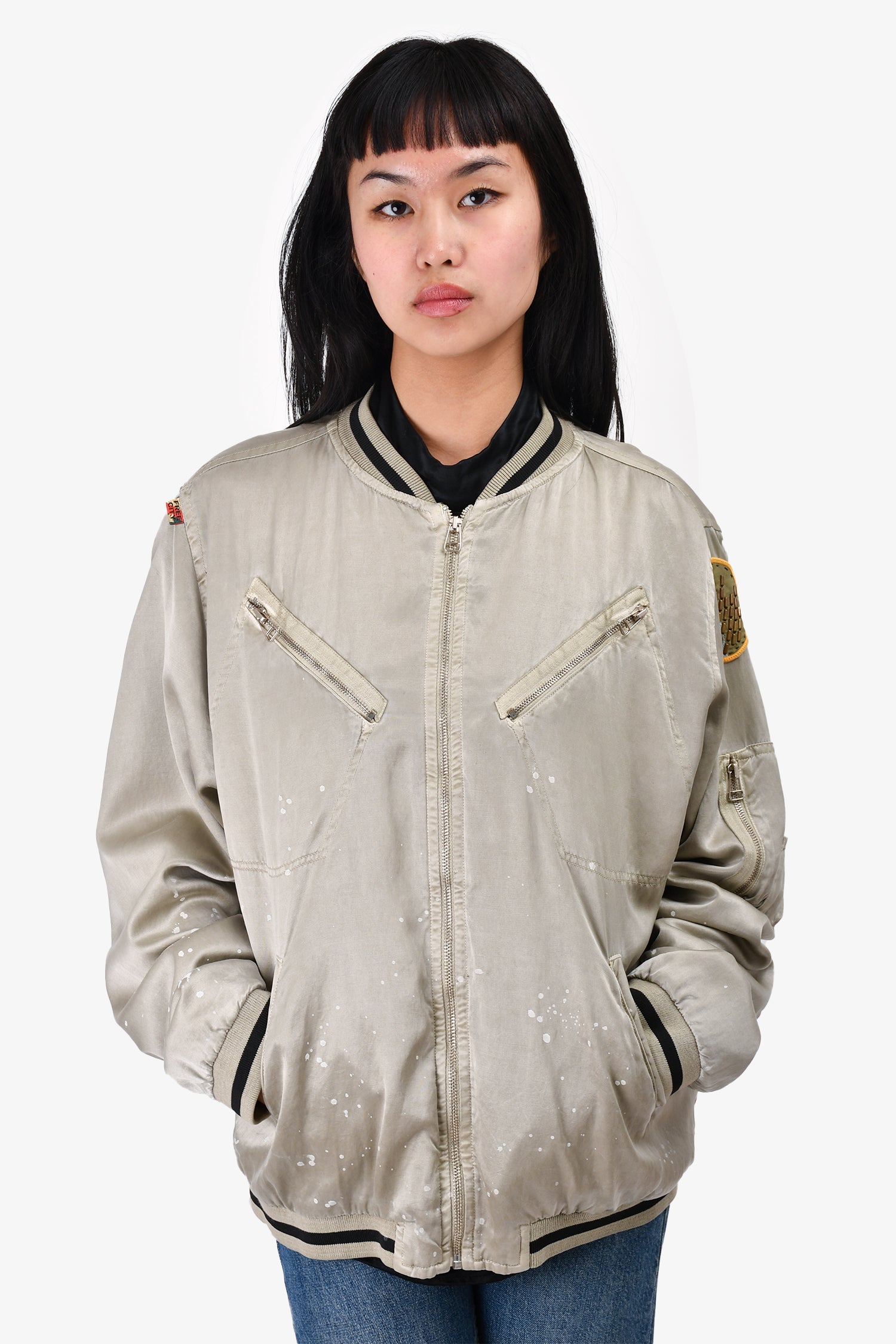 Refresh availabilityFree City Light Green Paint Splatter Bomber Jacket. Front pockets. Ribbed neck, cuffs and hem. Tonal stitching.