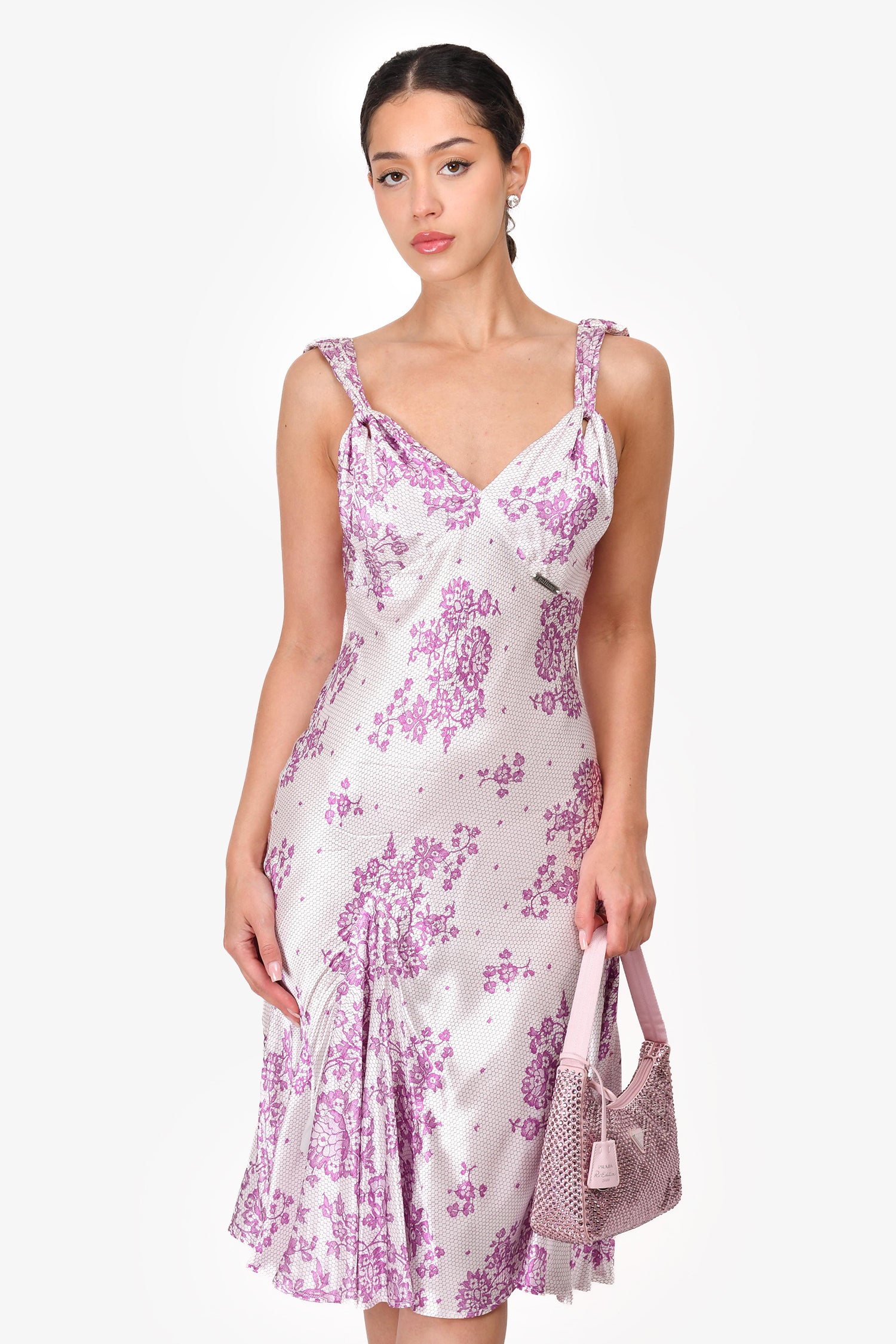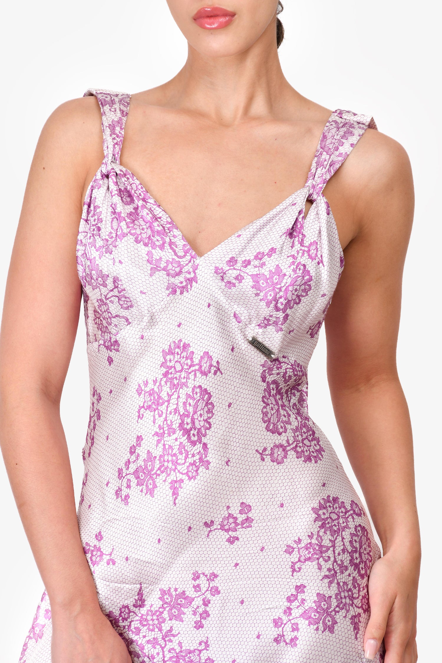 Refresh availabilityGalliano White/Purple Lace Printed Sleeveless Midi Dress. V-neck. Pull-on. Side zip closure. Unlined.