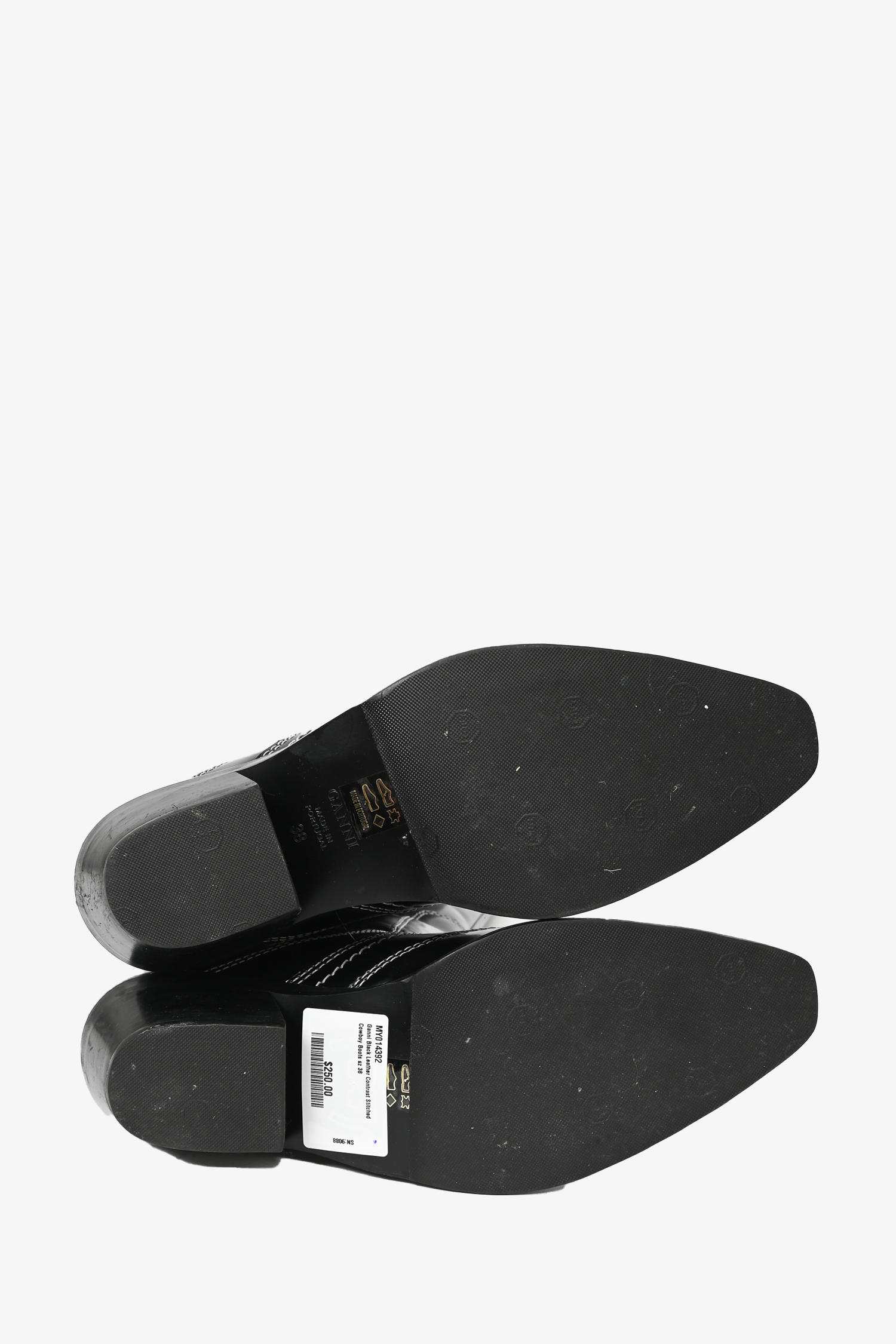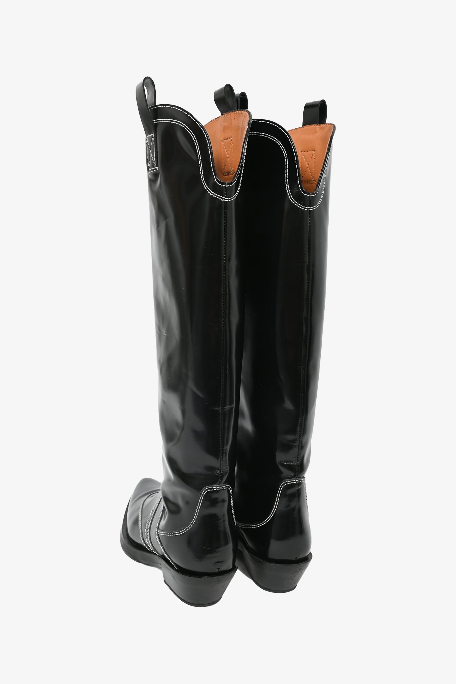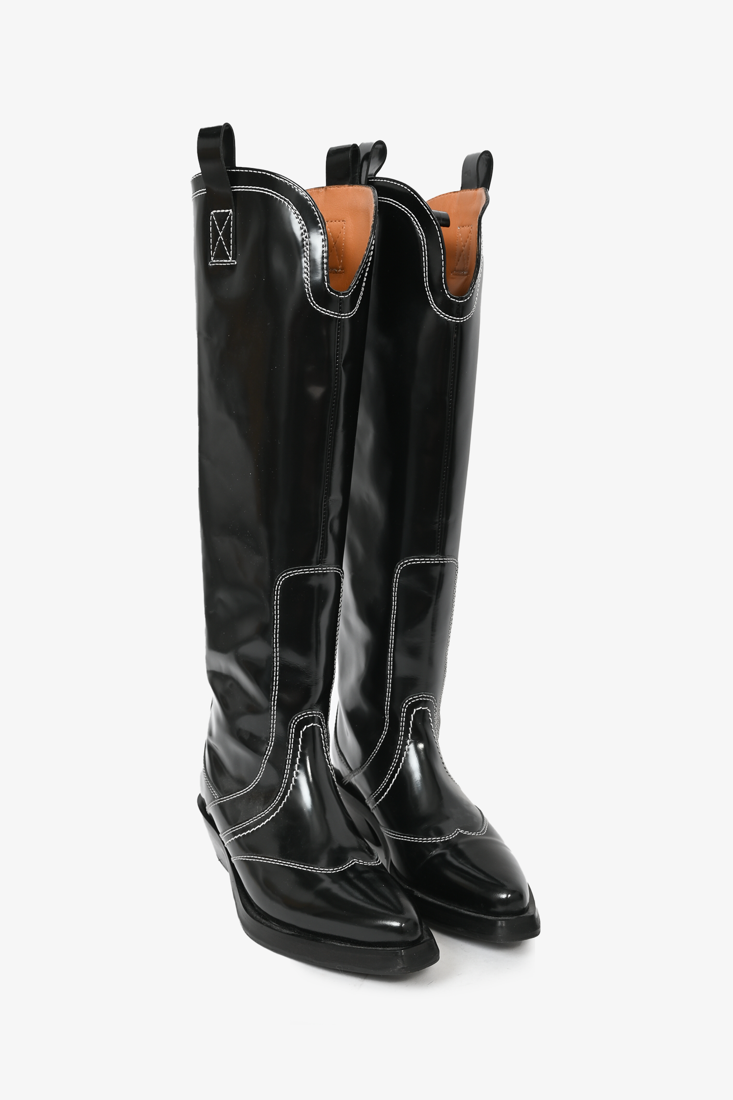 Refresh availabilityGanni Black Leather Contrast Stitched Cowboy Boots. Pull-on. Pointed toe. Curved heel. Tonal stitching. Topy soles.