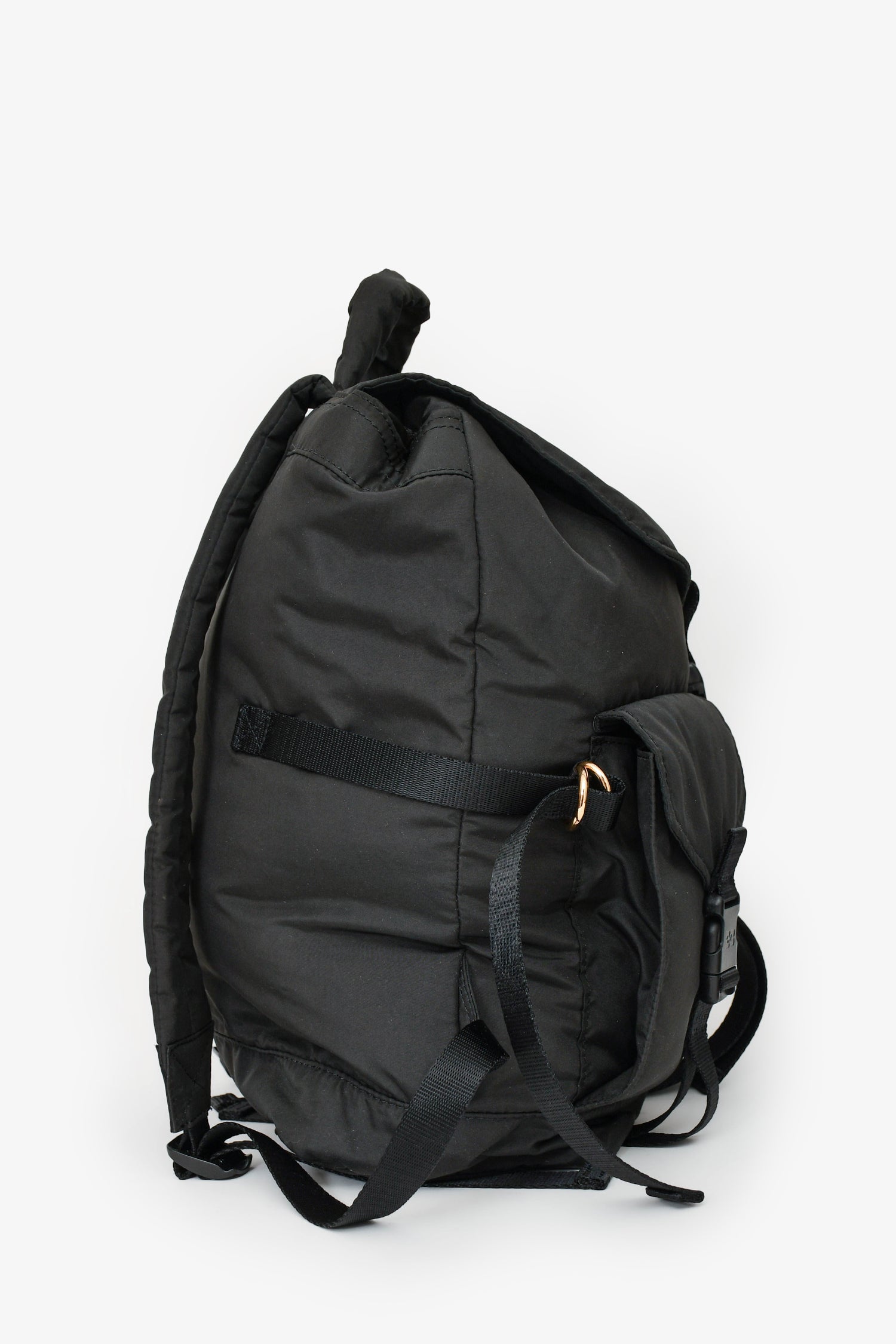 Ganni Black Recycled Tech Backpack. Features top flap with buckle closure and drawstring opening. Two front pockets with buckle closure. Single interior zipped pocket. Adjustable padded shoulder straps. Tonal stitching.