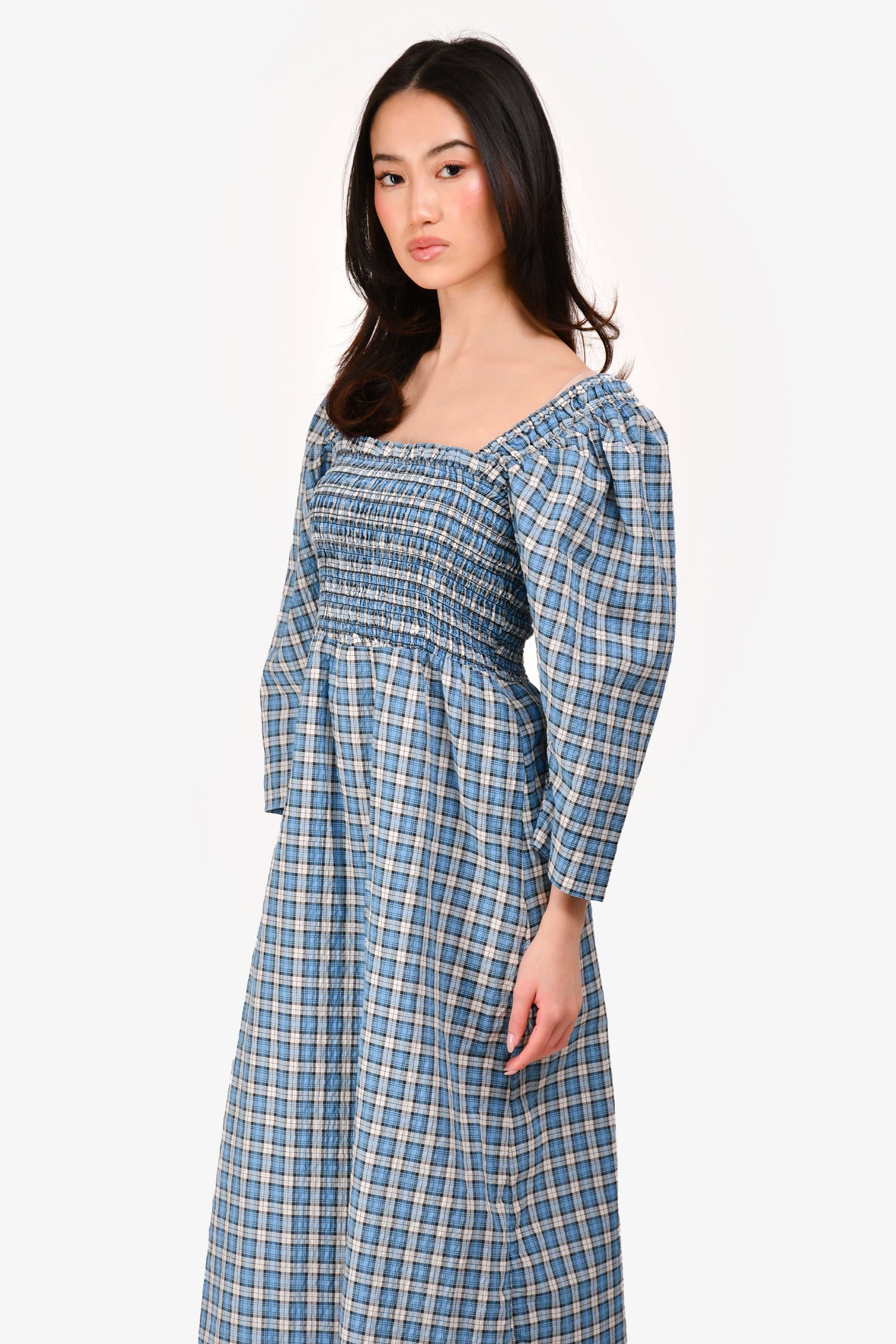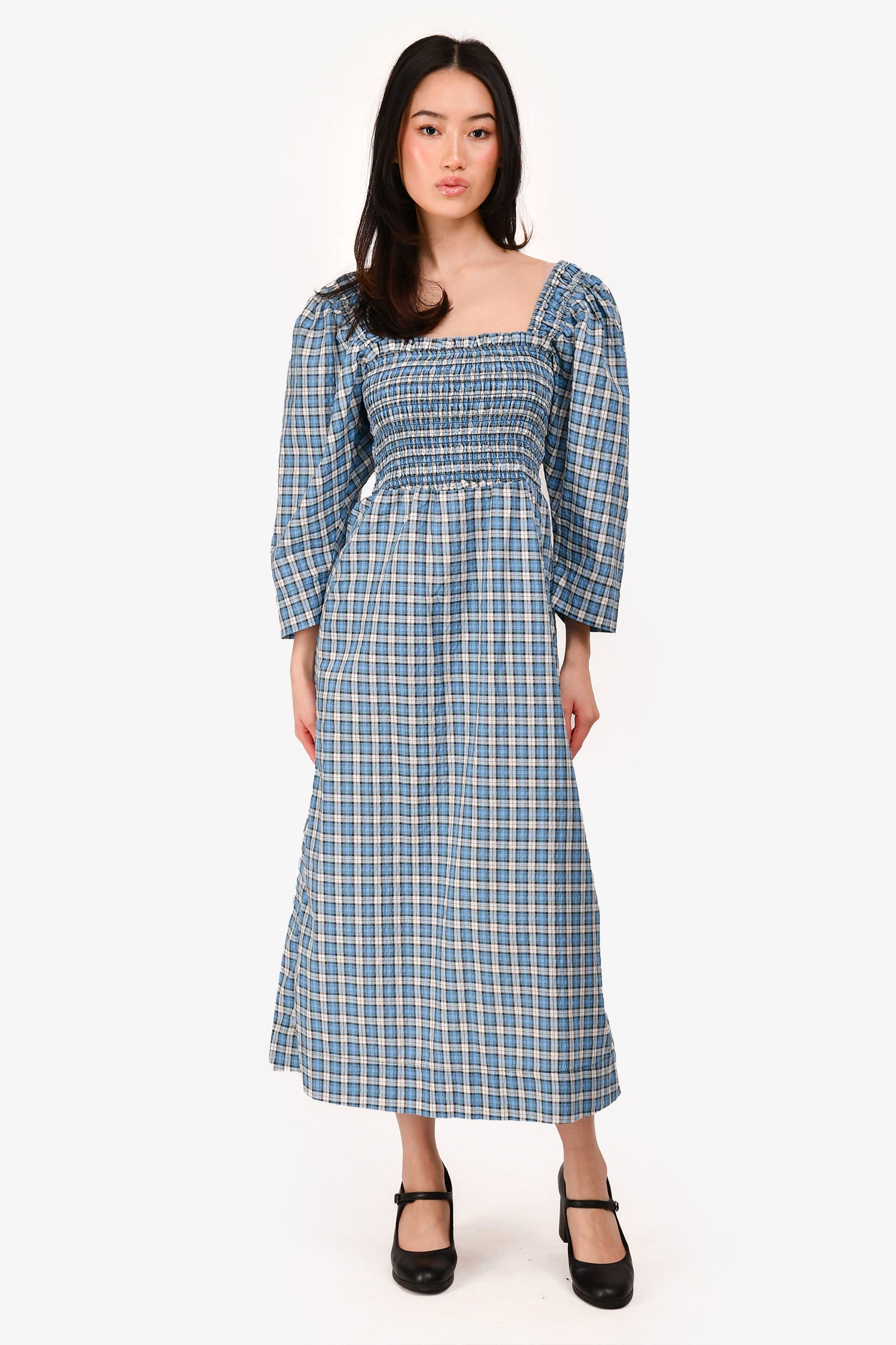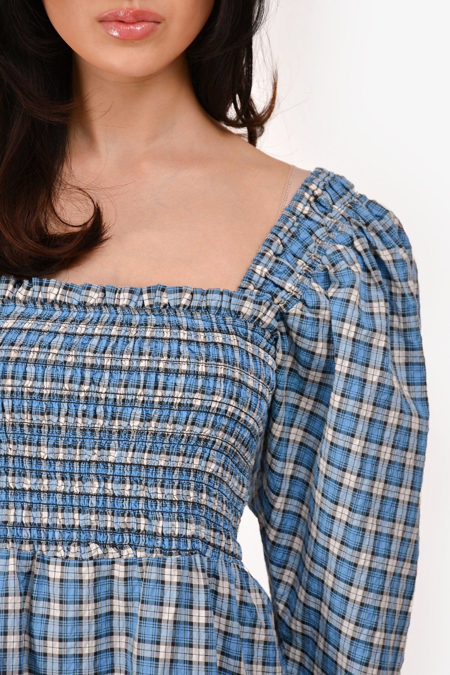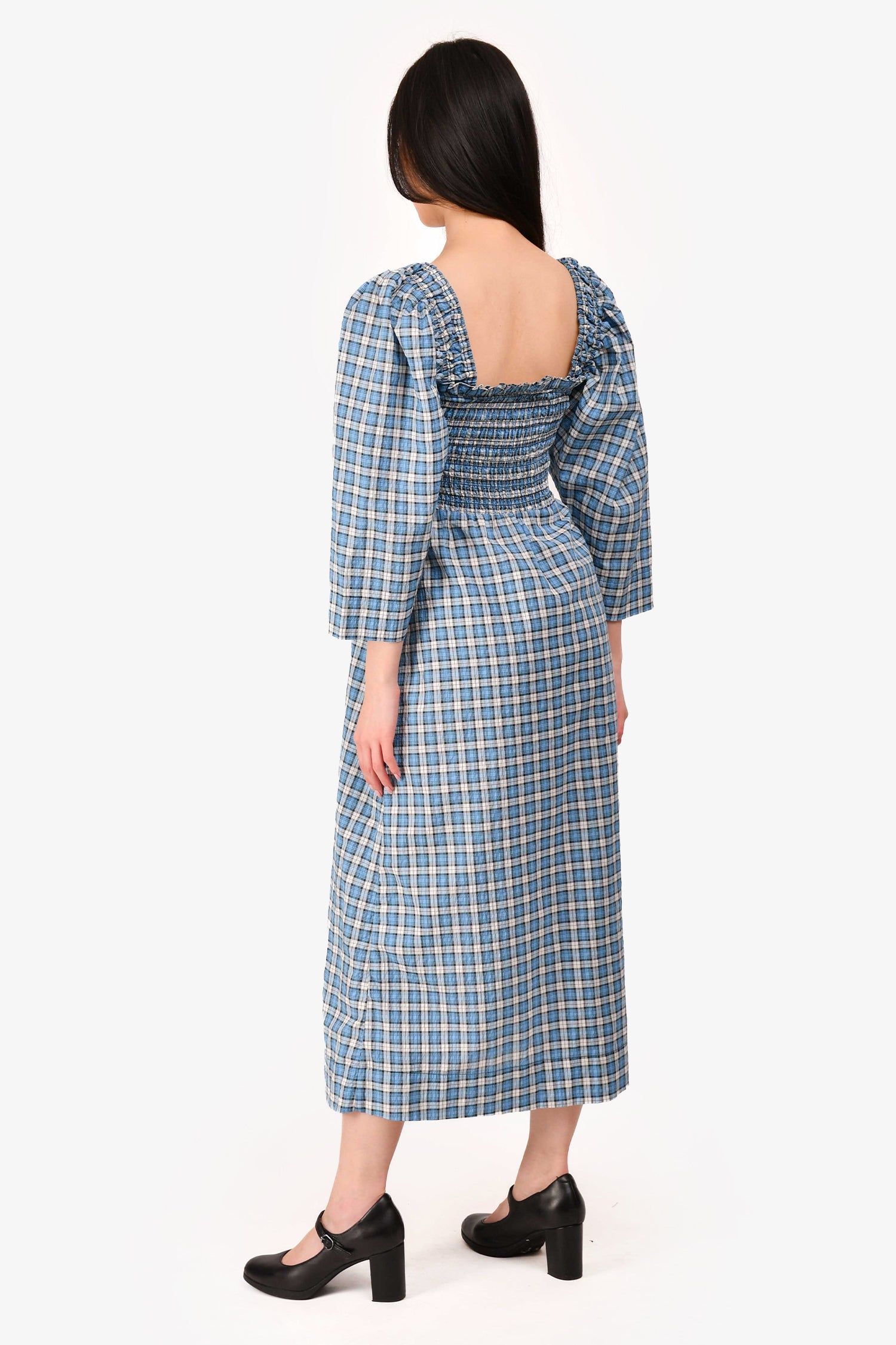 Refresh availabilityGanni Blue Cotton Plaid Ruched Dress. Ruched at the bust. Square neckline. Tonal stitching. Side zipper closure. Tonal stitching.