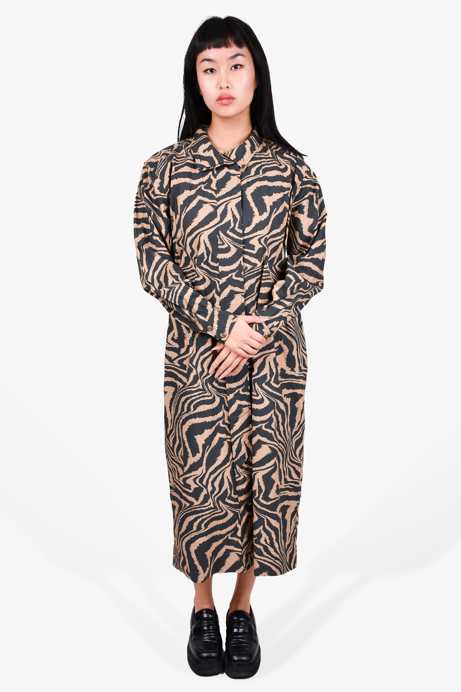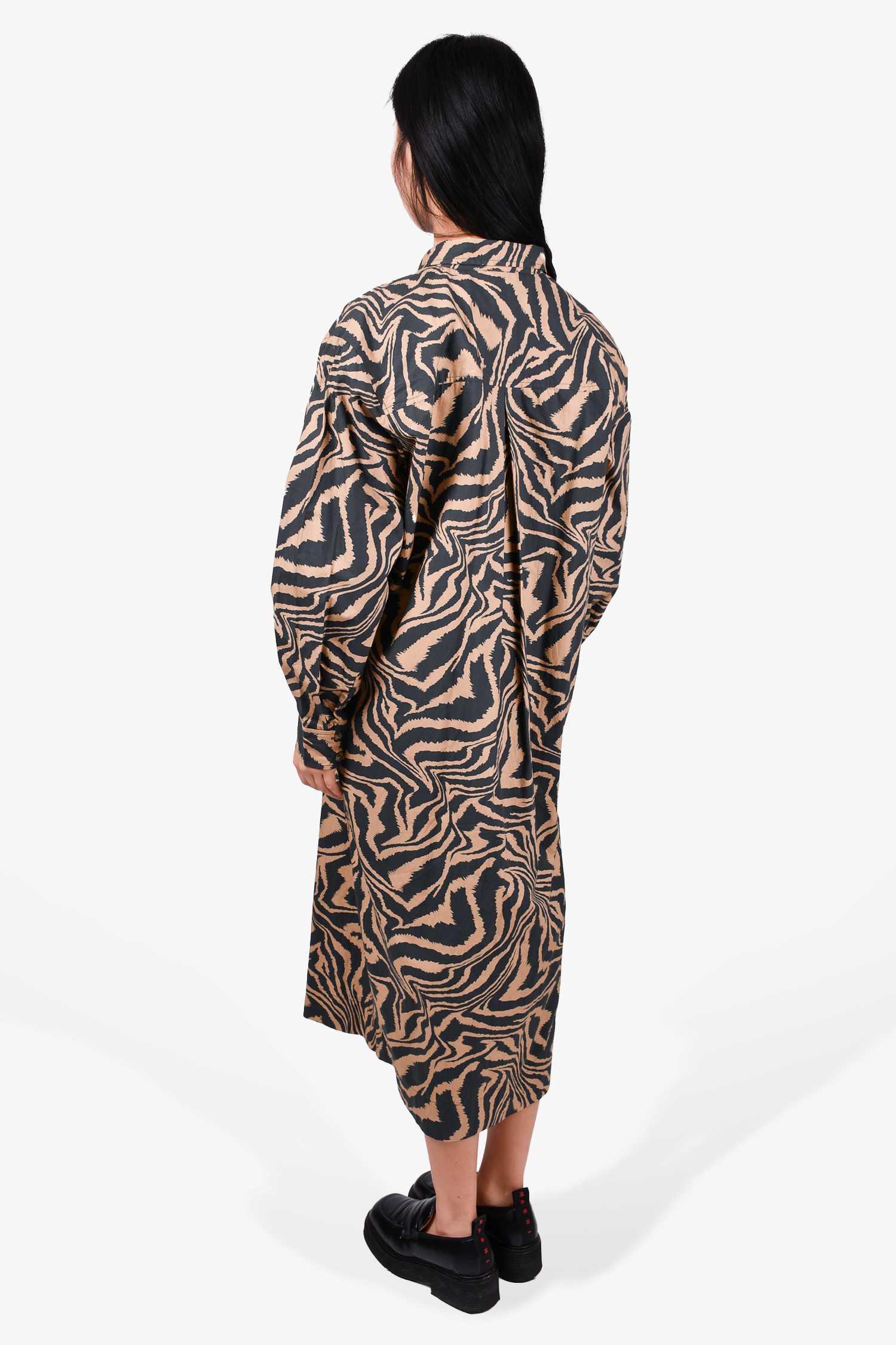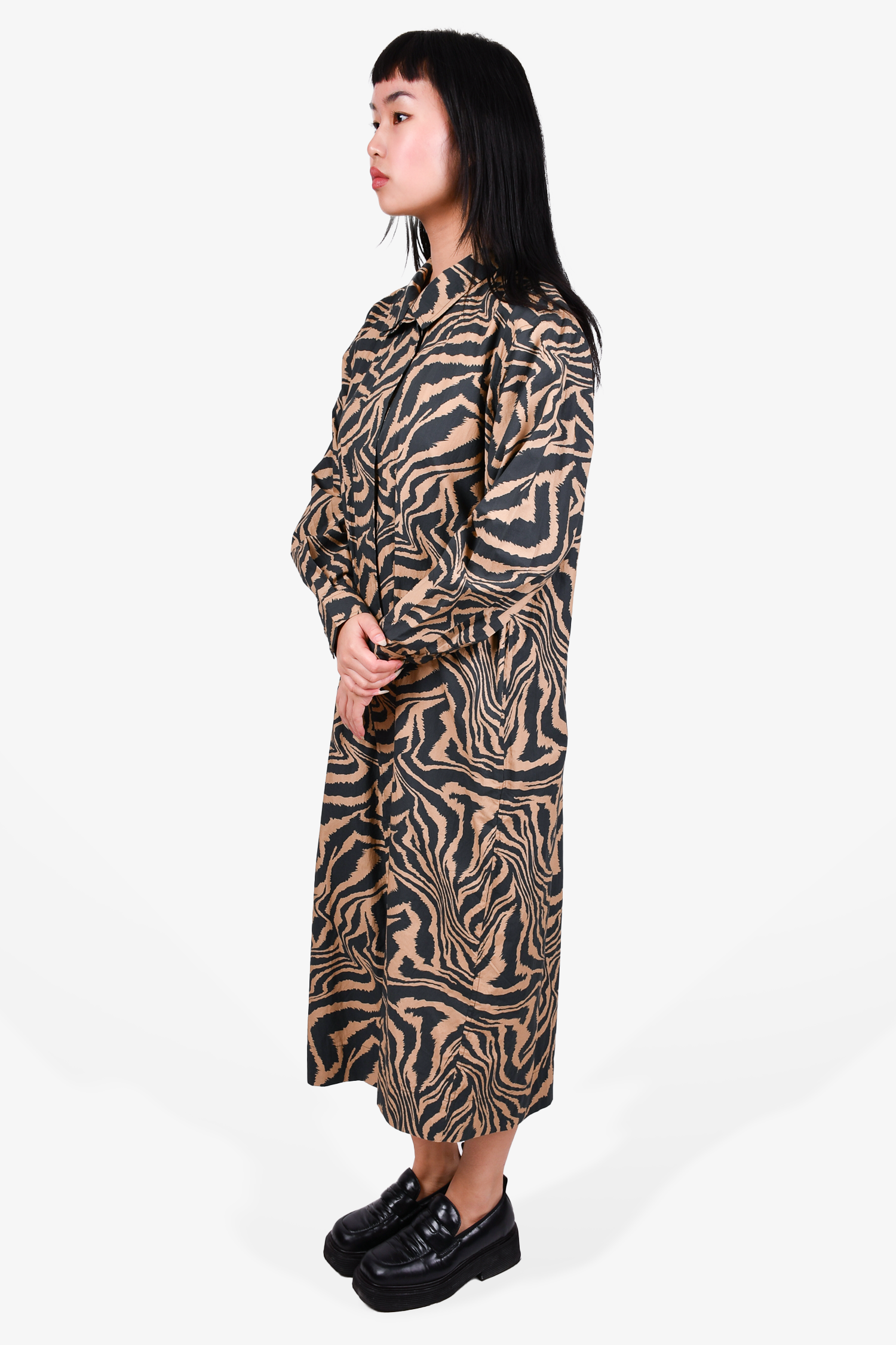 Refresh availabilityGanni Brown Animal Print Button Down Dress. Collared neckline. Front button closure. Button closure on sleeves. Tonal stitching.