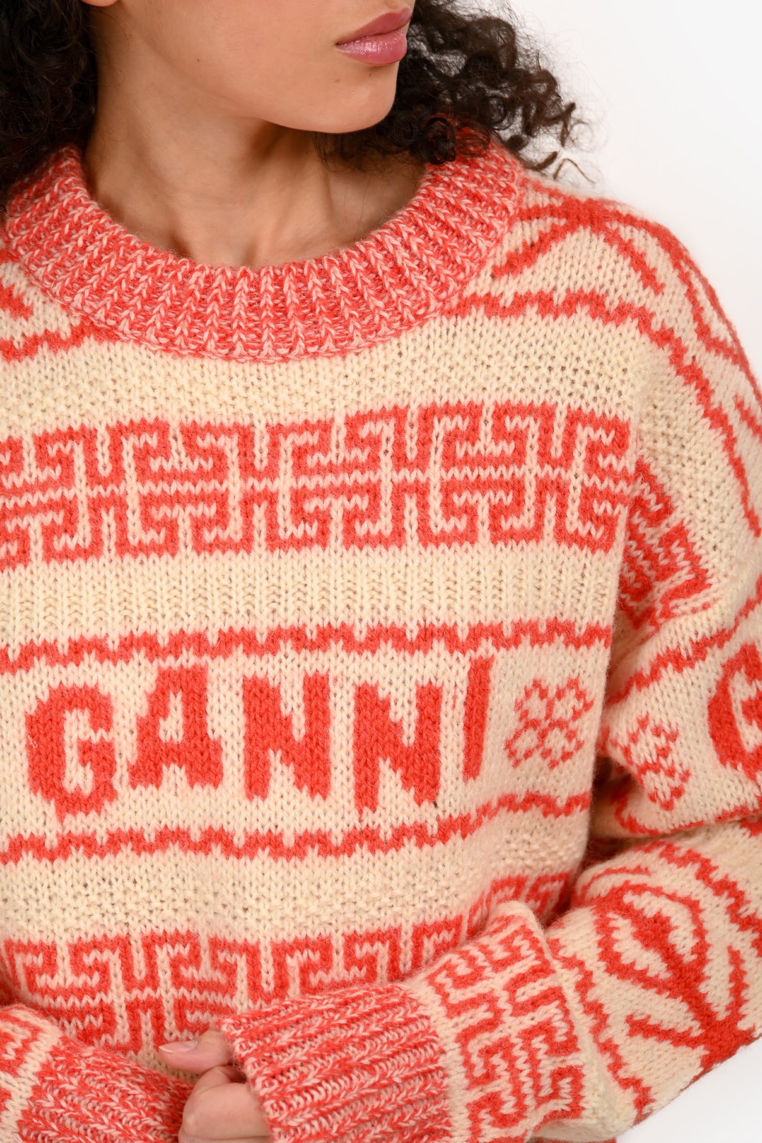 Refresh availabilityGanni Cream/Red Wool All Over Logo Crew Neck Sweater. Pull-on. Round neckline. Ribbed neck, cuffs, and hemline.