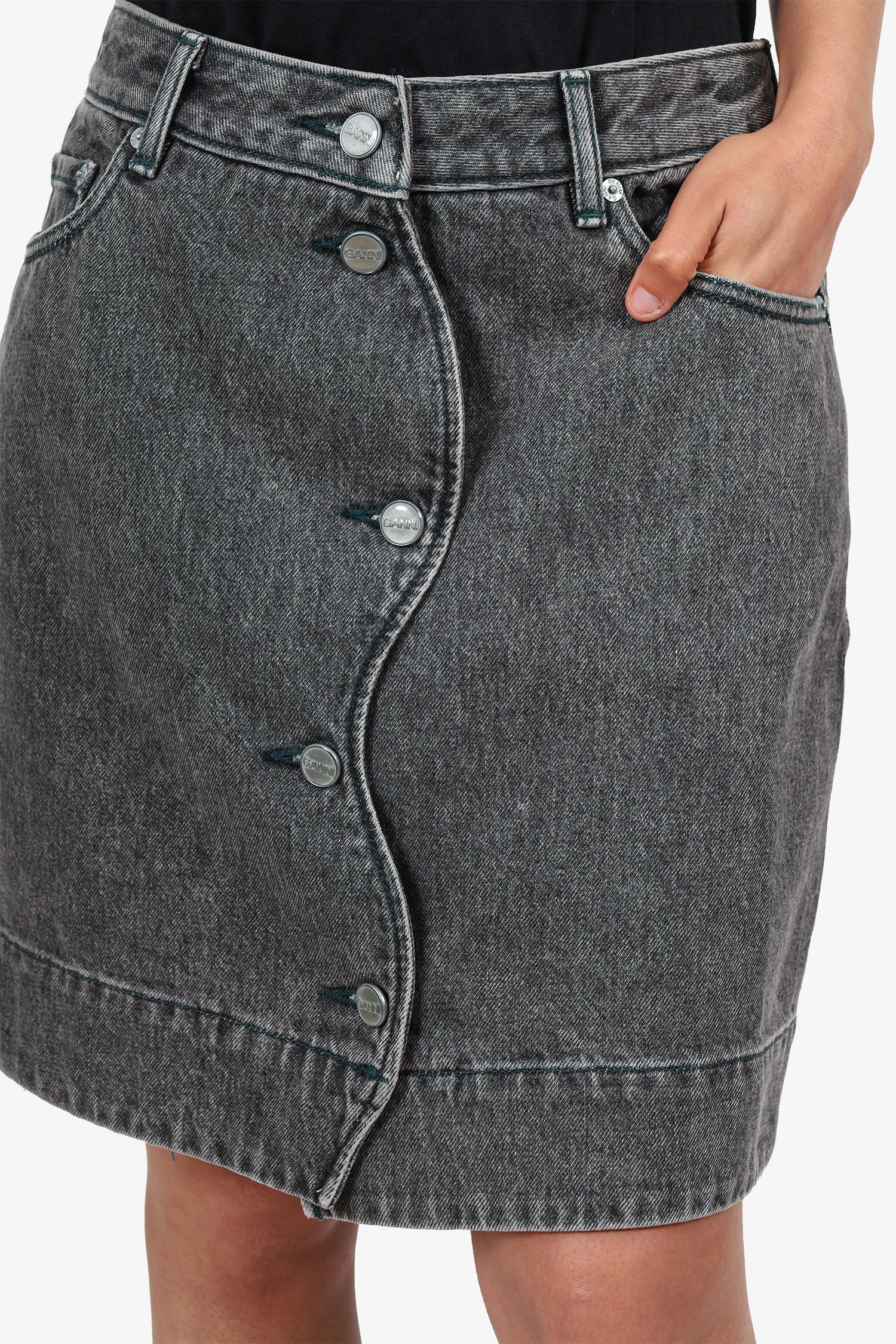 Refresh availabilityGanni Grey Denim Button Up Mini Skirt. Slip-on. Front button-up closure. Waistband belt loops. 5 exterior pockets; 2 front side slip and 1 mini compartment, 2 rear slip. Silver-tone hardware. Tonal stitching.