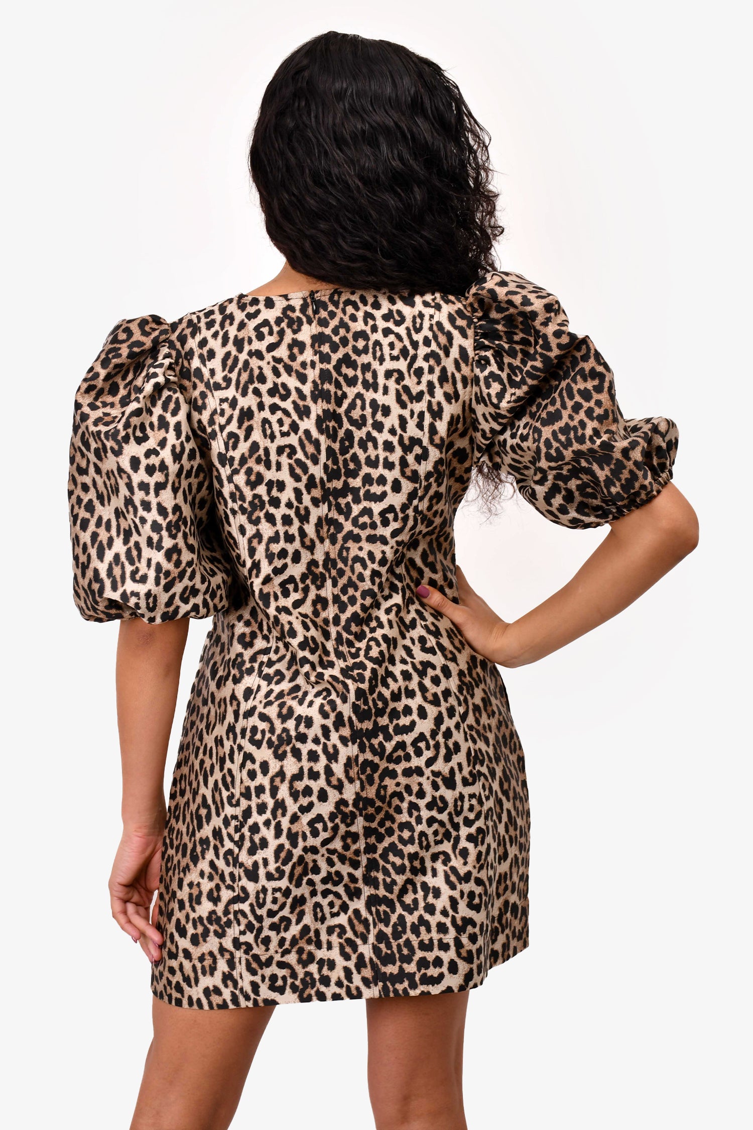 Refresh availabilityGanni Leopard Print Puff Sleeve V-Neck Mini Dress. 2 hand pockets. Hidden back zip closure. Unlined. Tonal stitching.