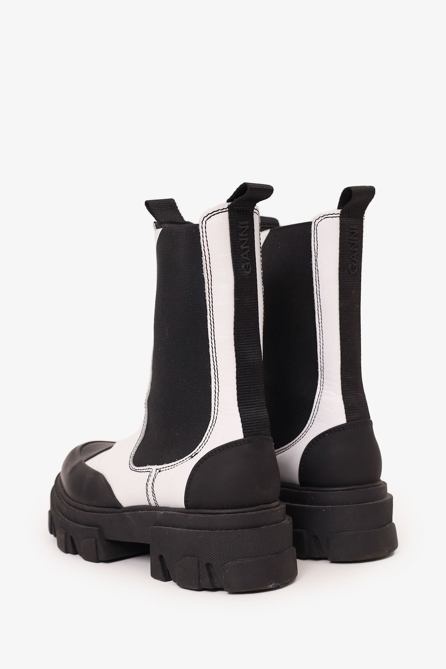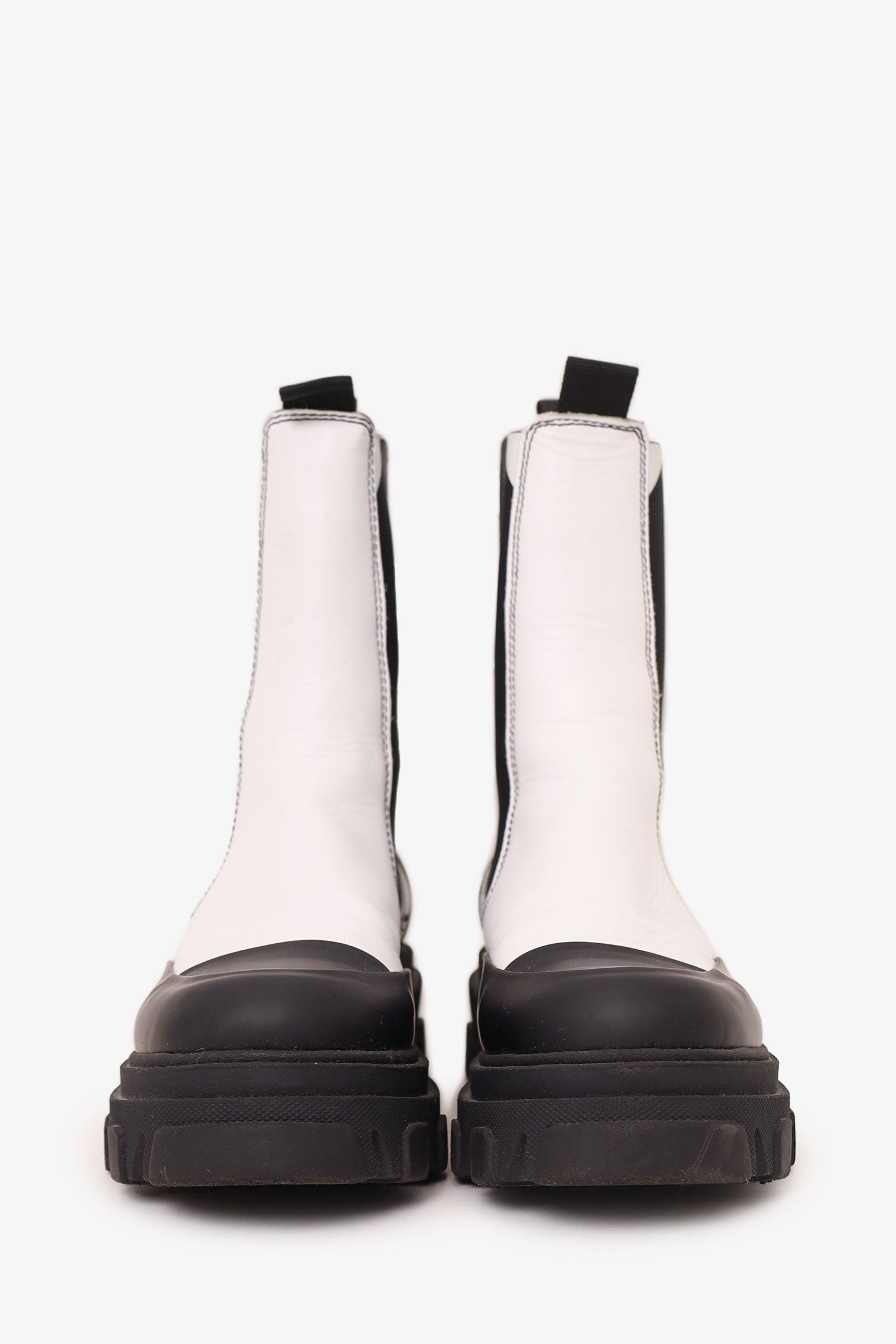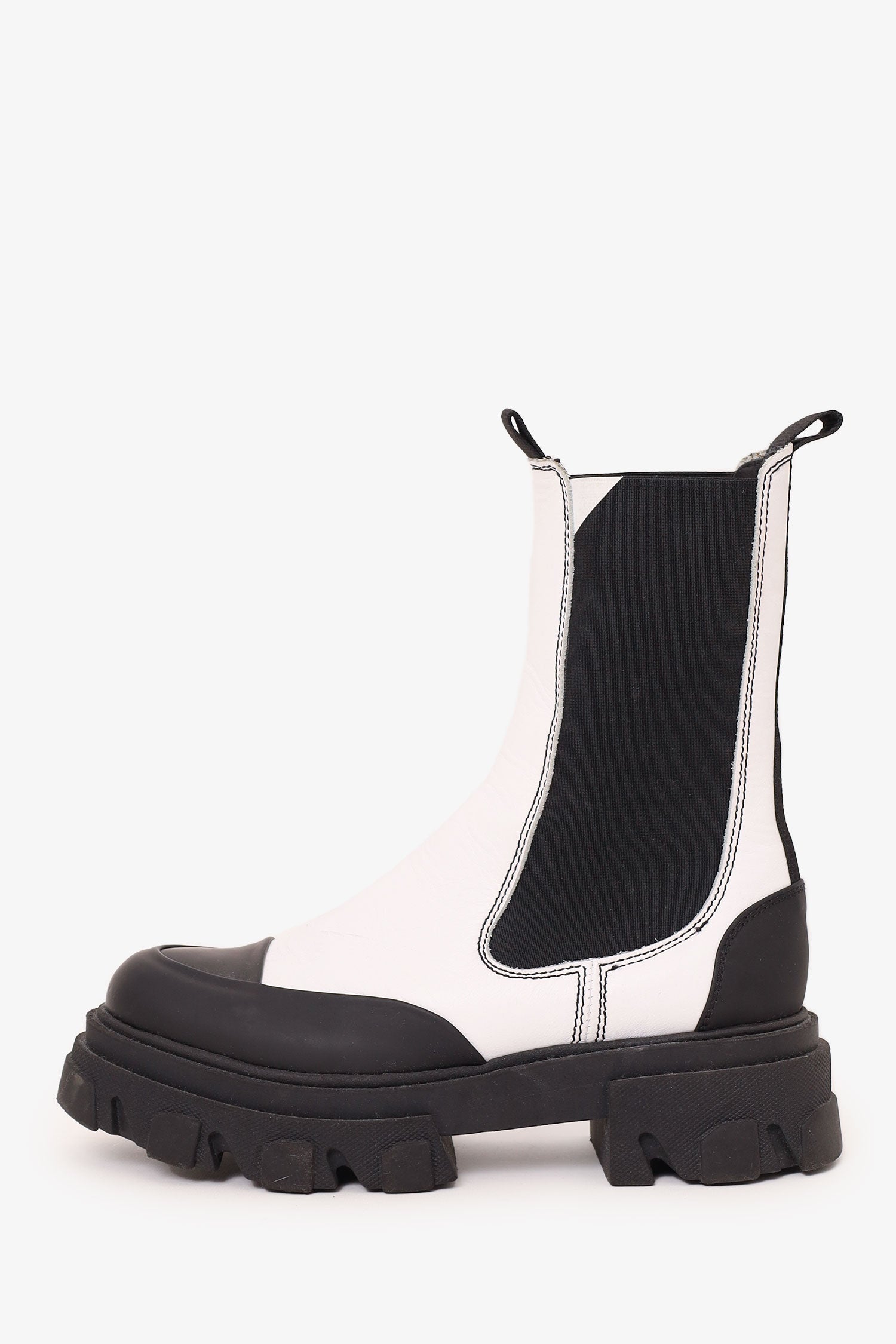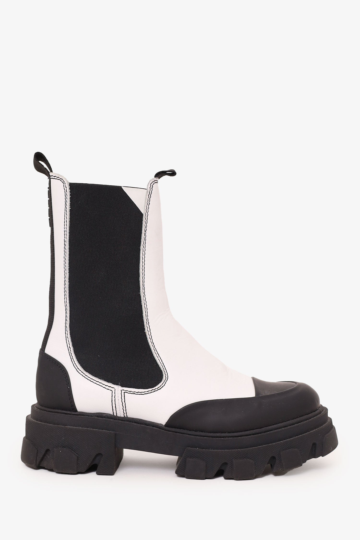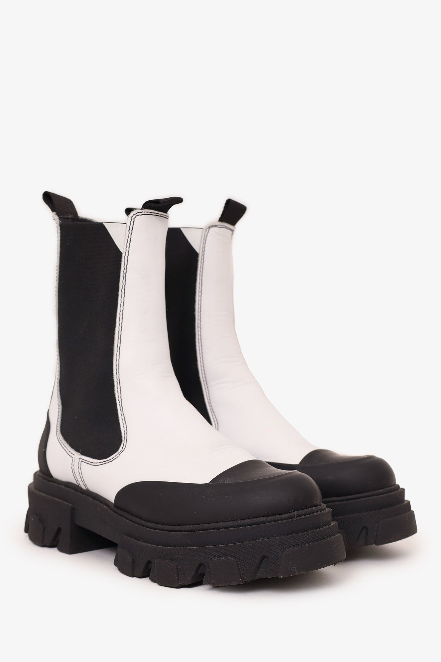 Refresh availabilityGanni White/Black Leather Chunky Chelsea Boots. Pull-on with pull tabs on rear. Round toe. Elasticated sides. Tonal stitching.