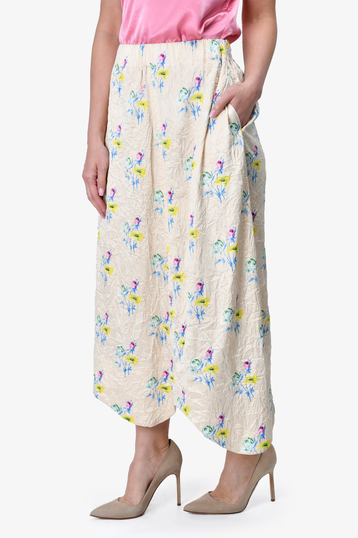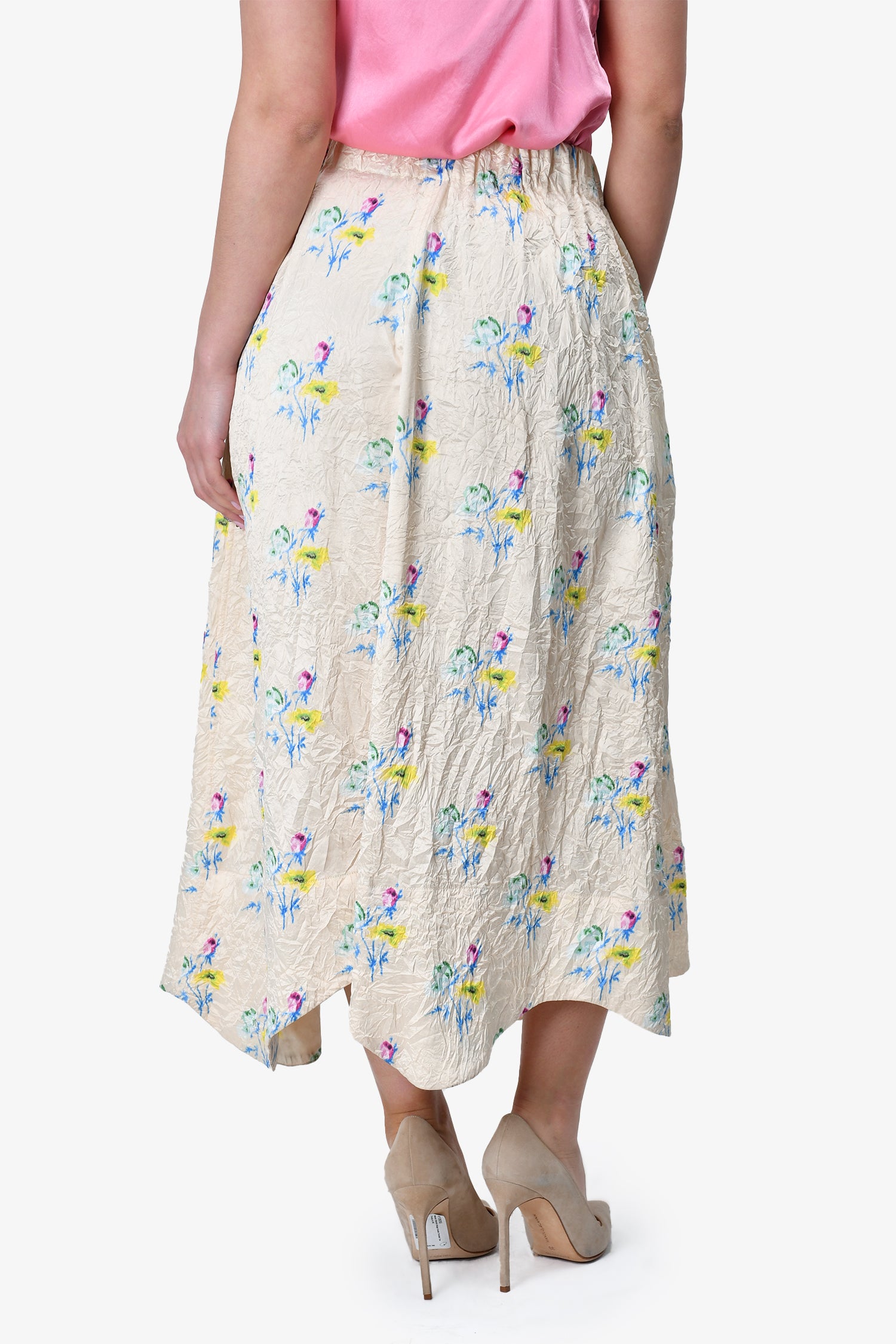 Refresh availabilityGanni Yellow Floral Printed Asymmetrical Midi Skirt. Crinkled fabric. Elastic band at the waist. Two front pockets. Tonal stitching.