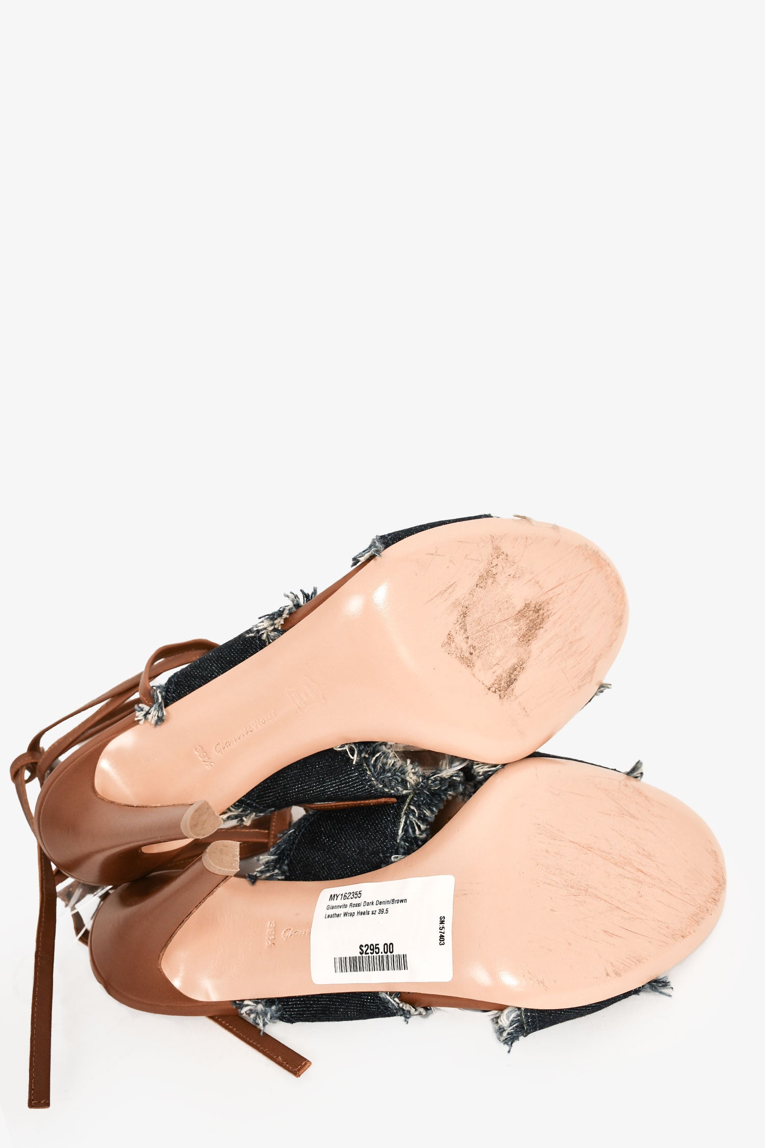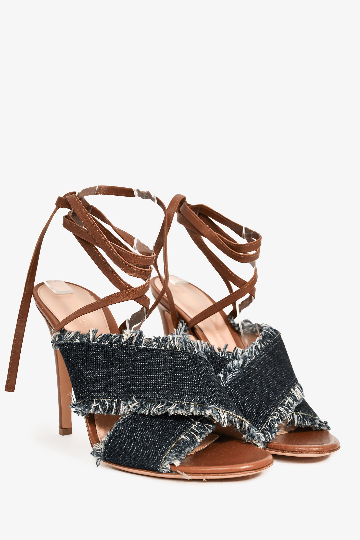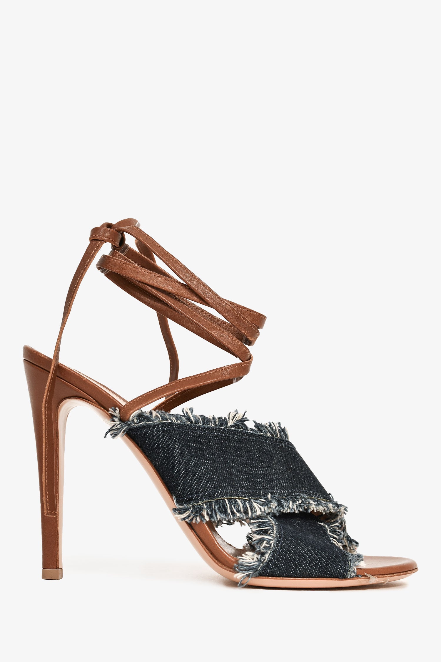 Refresh availabilityGianvito Rossi Dark Denim/Brown Leather Wrap Heels. Denim criss-cross straps with frayed edges. Leather insoles. Leather wrap-around straps. Tonal stitching.
