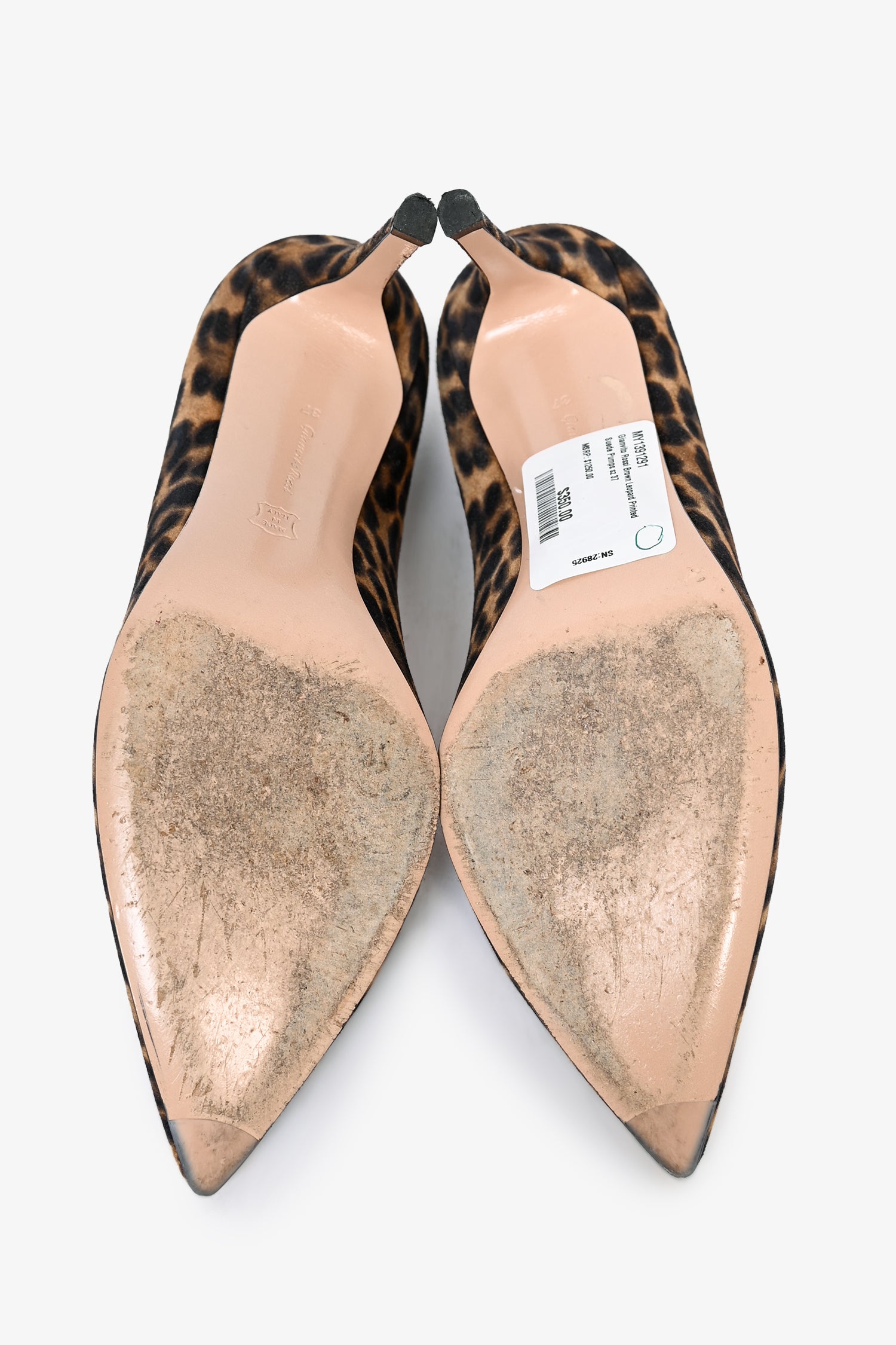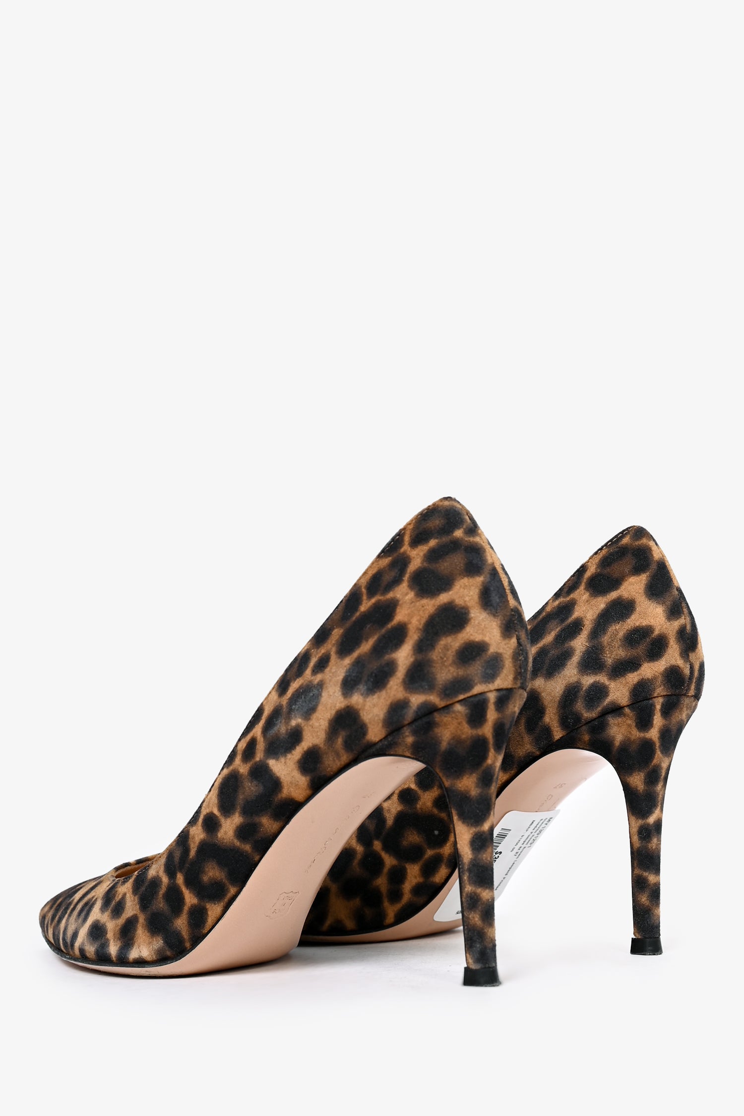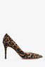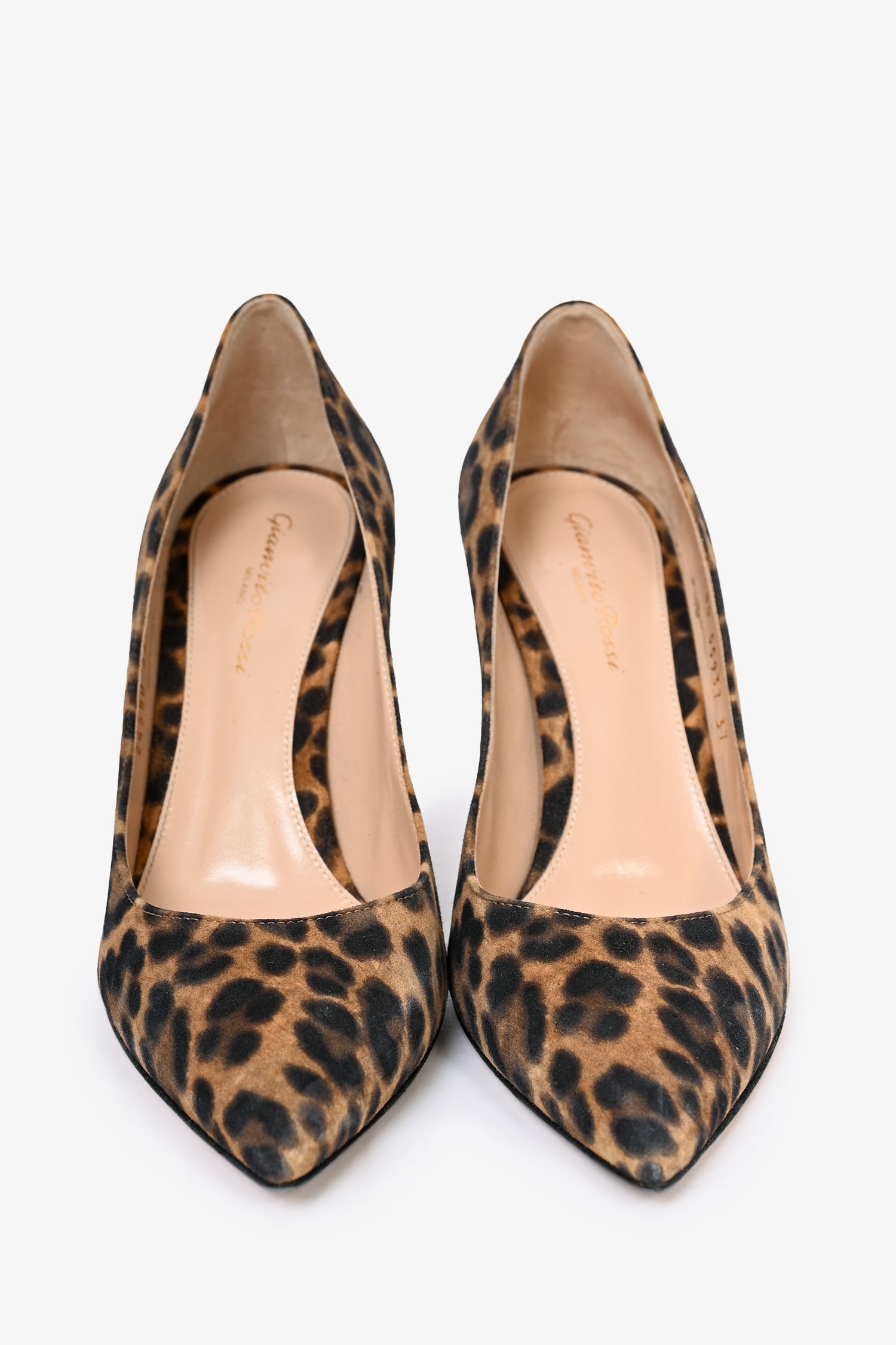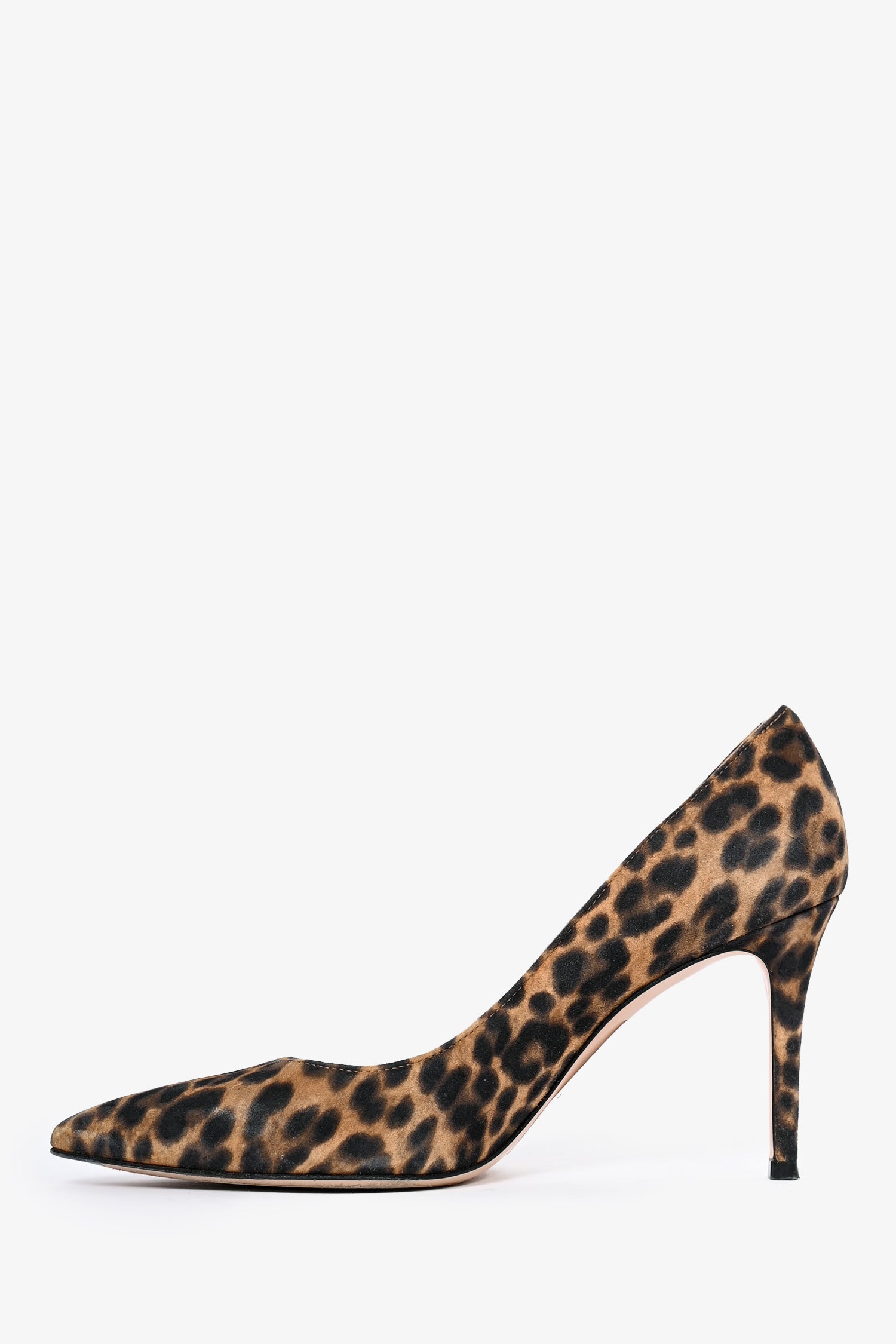 Refresh availabilityGianvito Rossi Brown Leopard Printed Suede Pumps. Pointed toe front. Covered stiletto heel in suede. Leather lined interior.