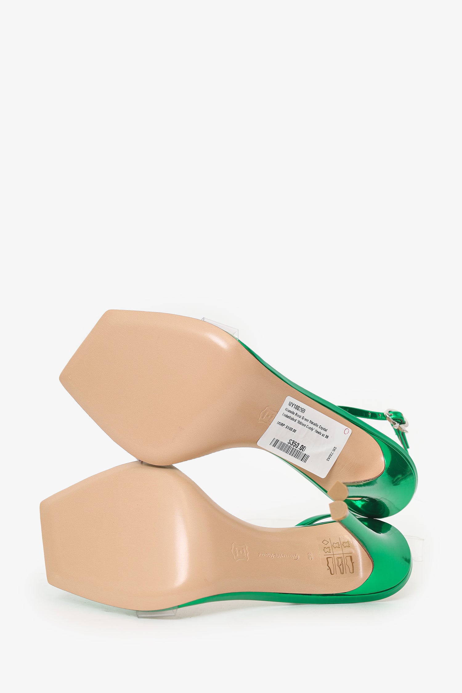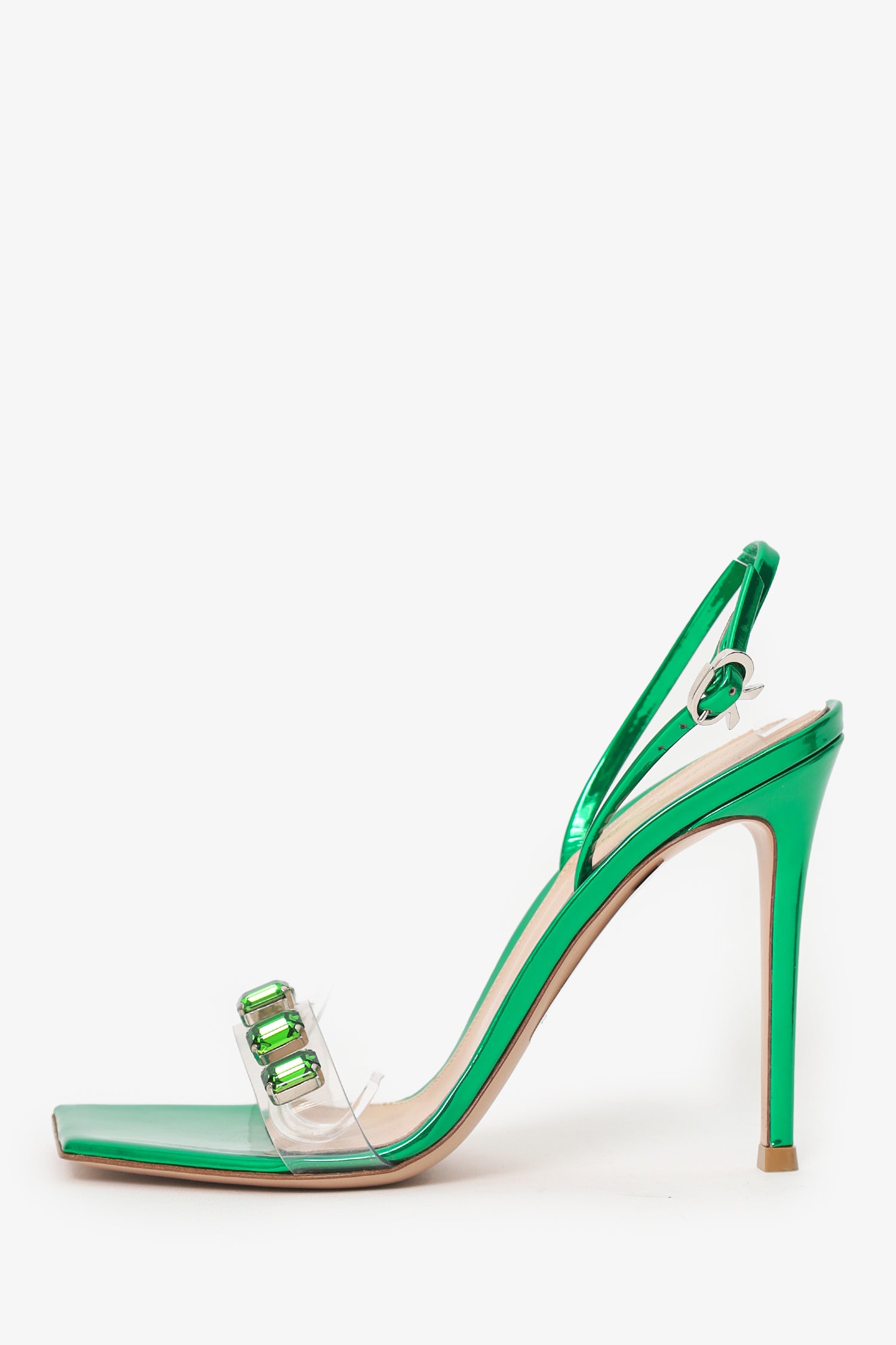 Refresh availabilityGianvito Rossi Green Metallic Crystal Embellished 'Ribbon Candy' Heel. Slip-on. Open squared-toe. Ankle strap with adjustable buckle closure. PVC vamp. Palladium-tone hardware. Tonal stitching.