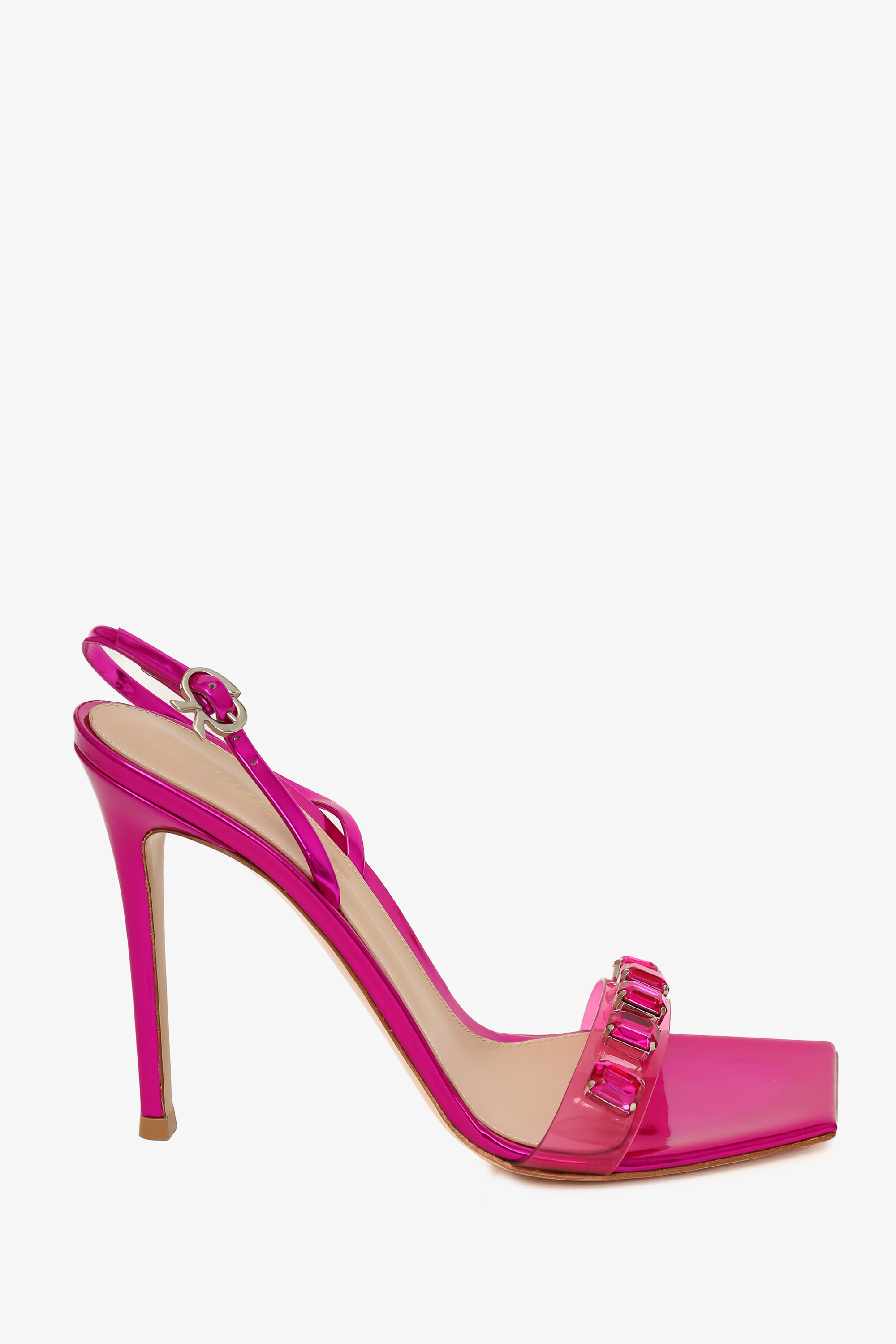 Refresh availabilityGianvito Rossi Pink Metallic Jewel 105 Plexi Strap Sandals. Open square toe. Jewel detail on front strap. Ankle strap with adjustable closure. Silver-tone buckle. Tonal stitching. Comes with box and dustbags.
