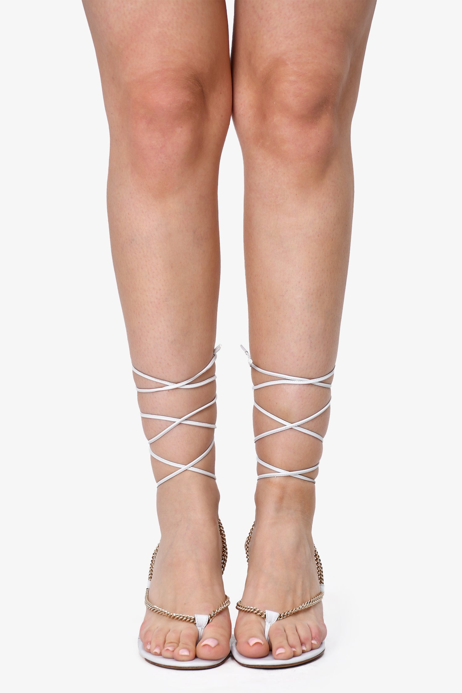 Refresh availabilityGianvito Rossi White Leather Chain Link Heeled Sandals. Round toe. Gold-toned hardware. Tonal stitching.