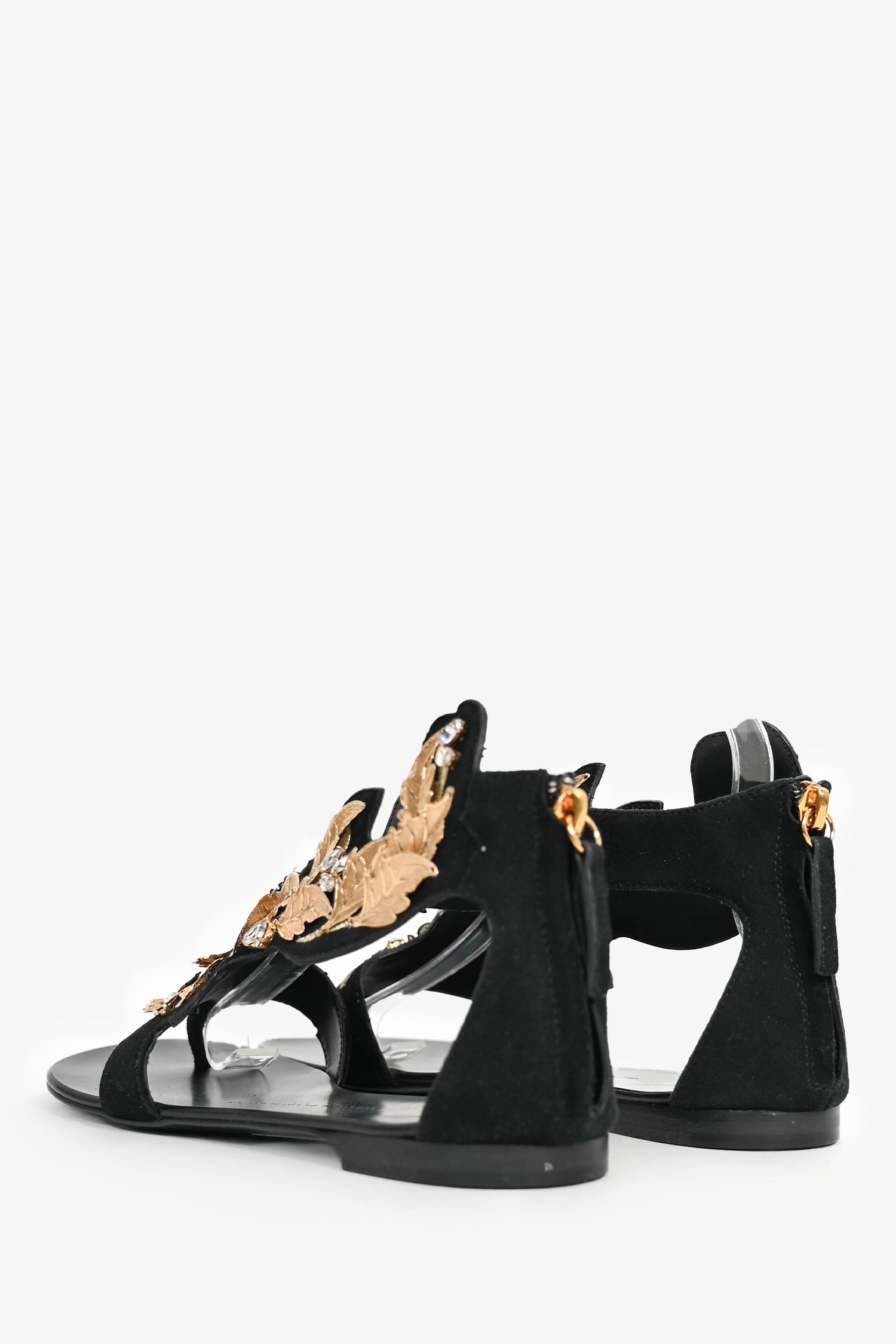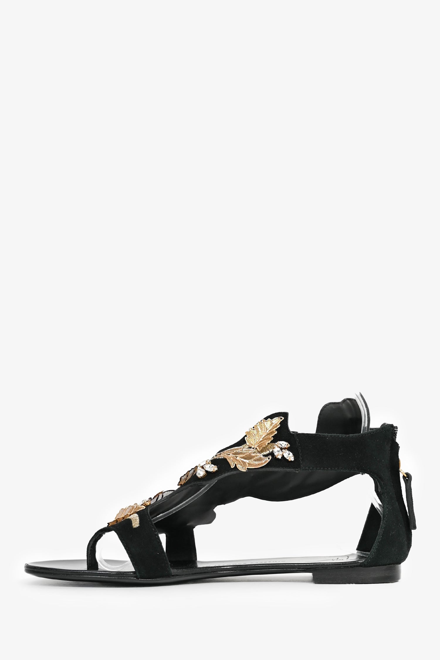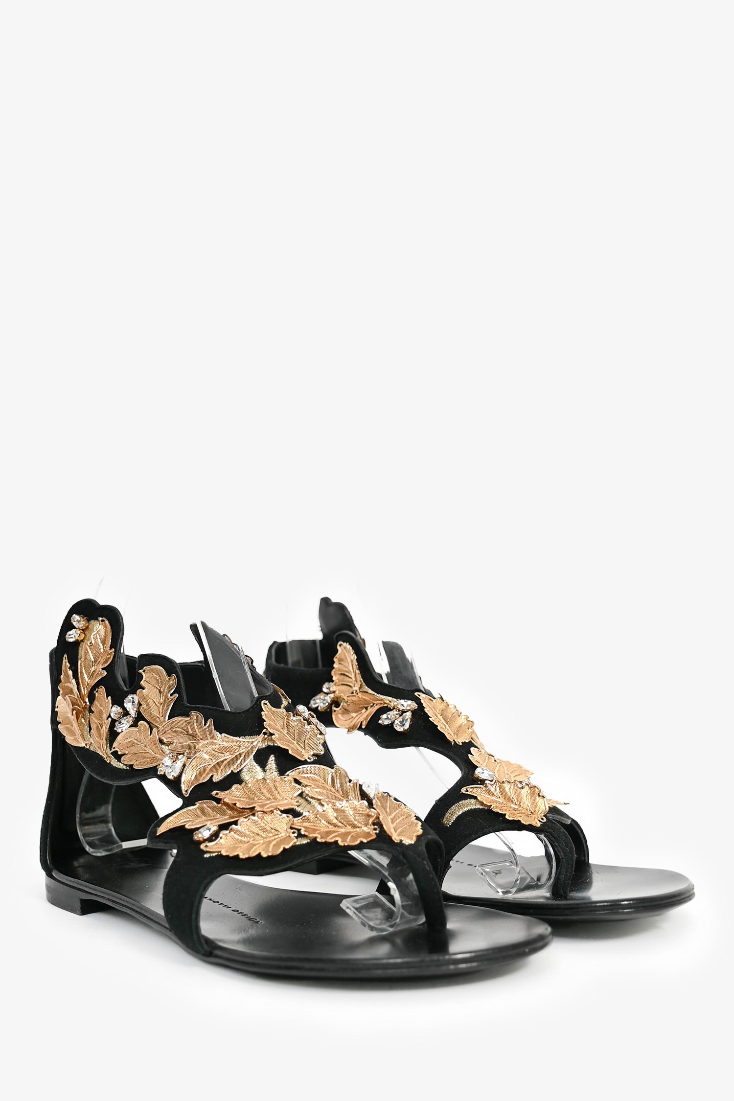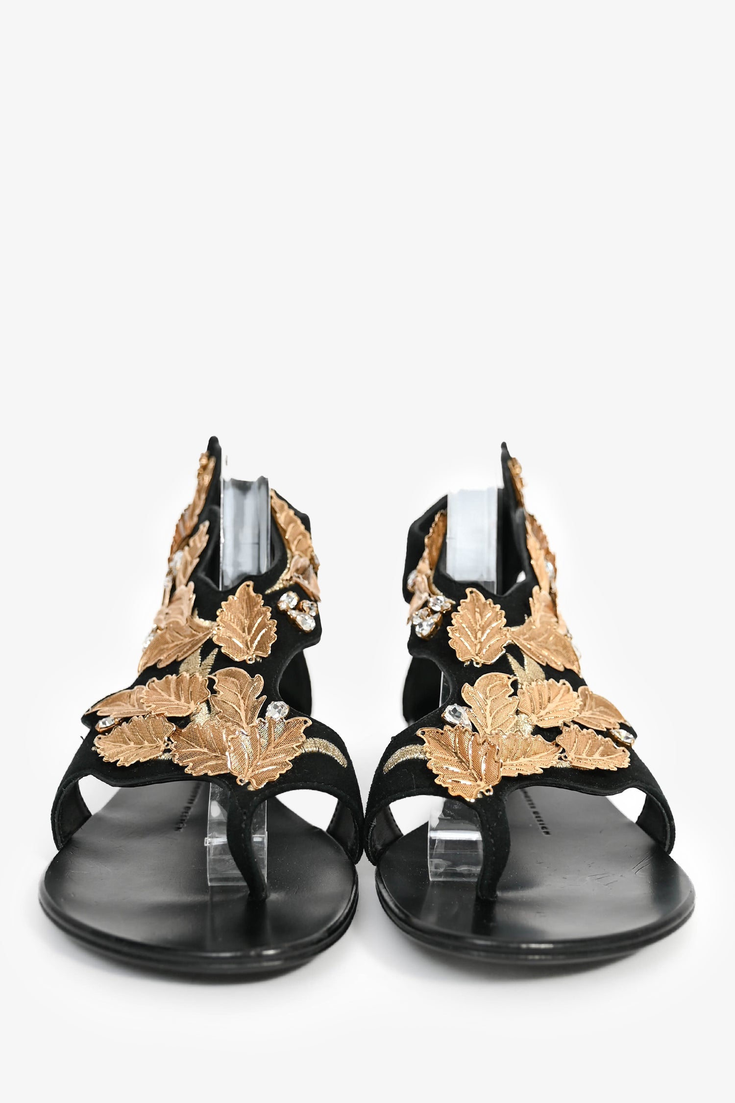 Refresh availabilityGiuseppe Zanotti Black Gold Leaf Embellished Sandals. Leather insole. Back zipper. Suede trimming. Tonal stitching.