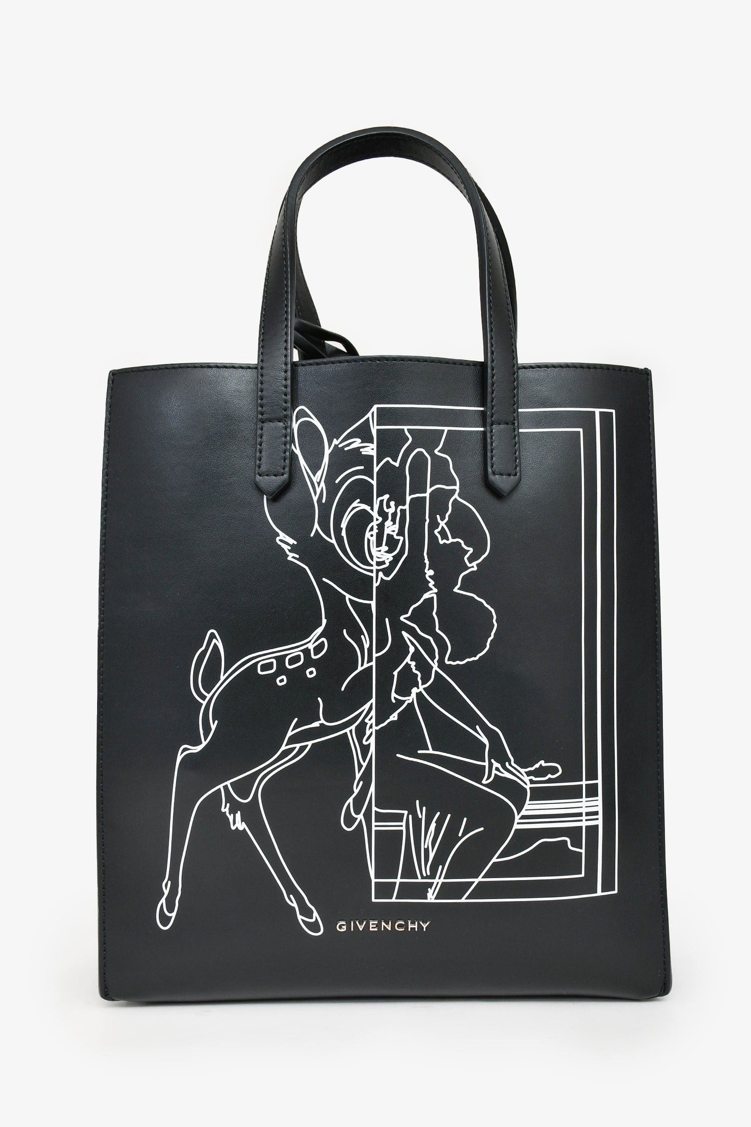 Refresh availabilityGivenchy 2016 Black Leather Bambi Print Tote with Strap. Open top. Dual leather handles. Detachable shoulder strap. Detachable zipped pouch. Silver-tone hardware. Tonal stitching. Comes with dust bag.