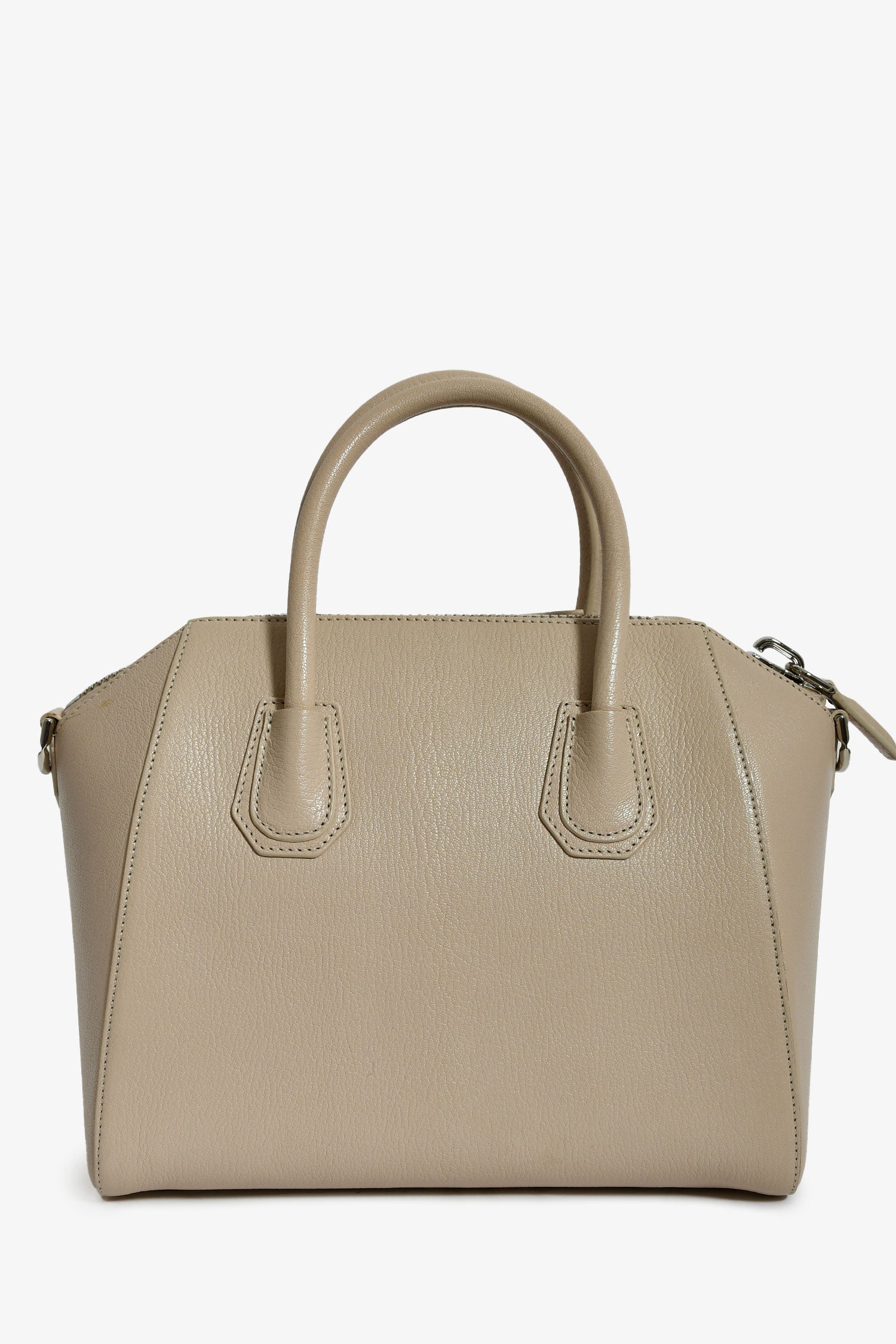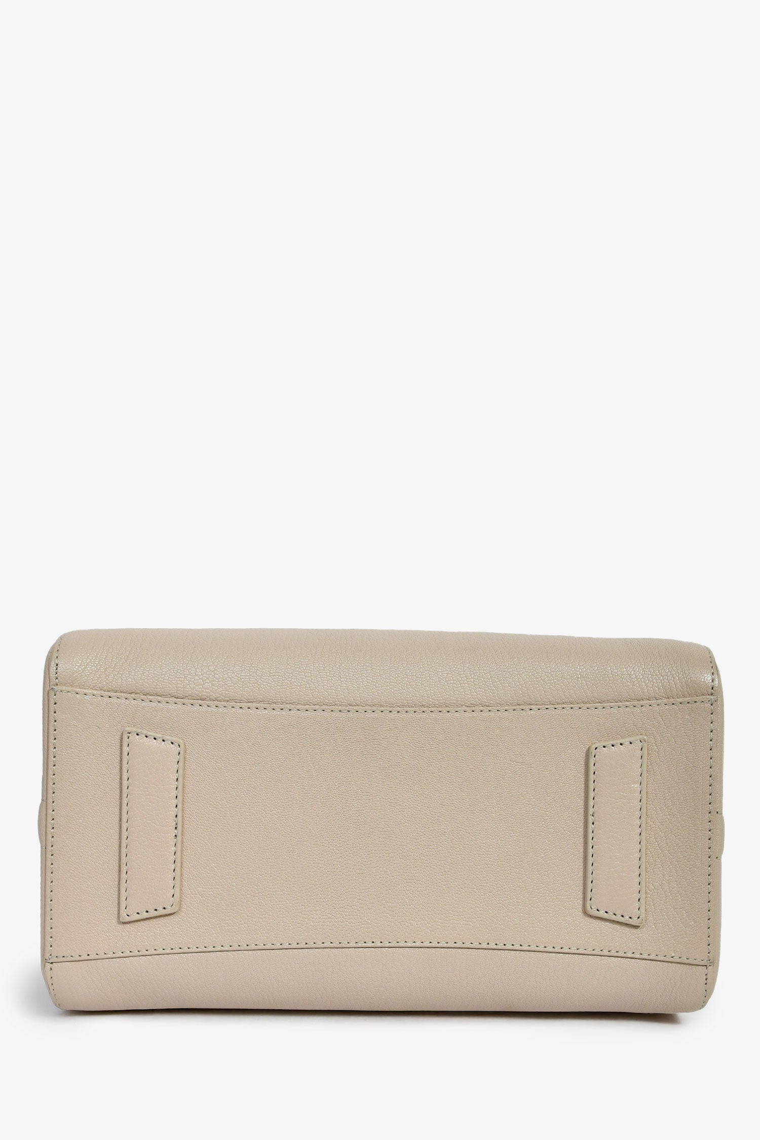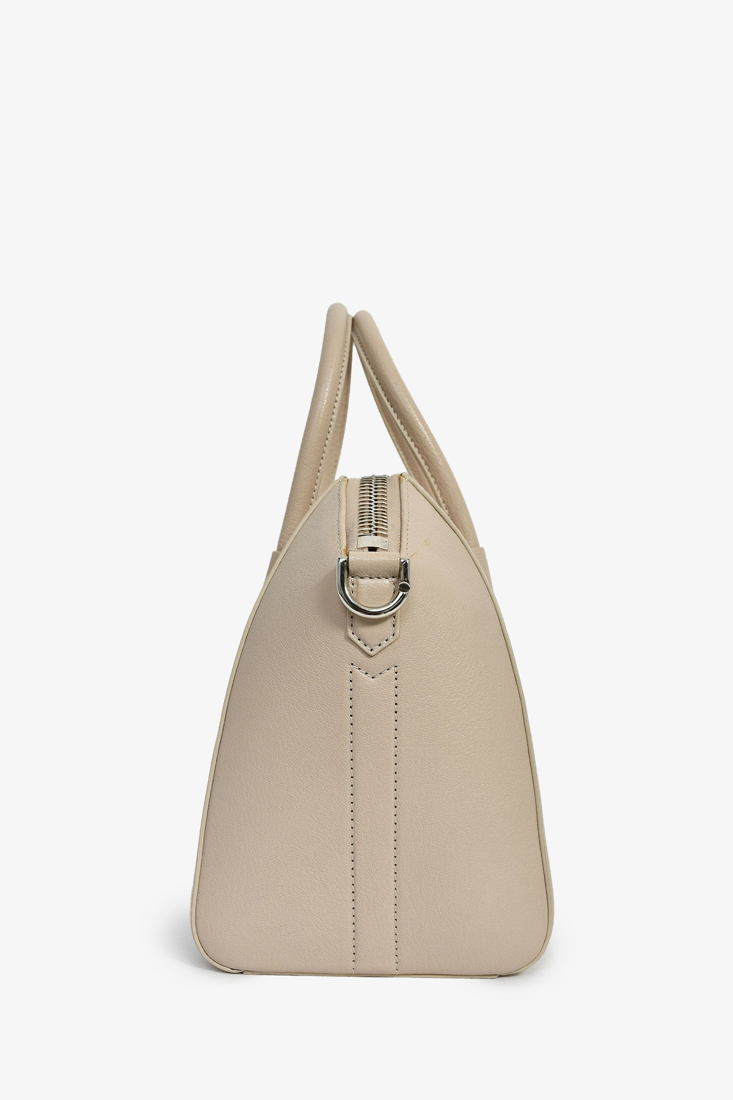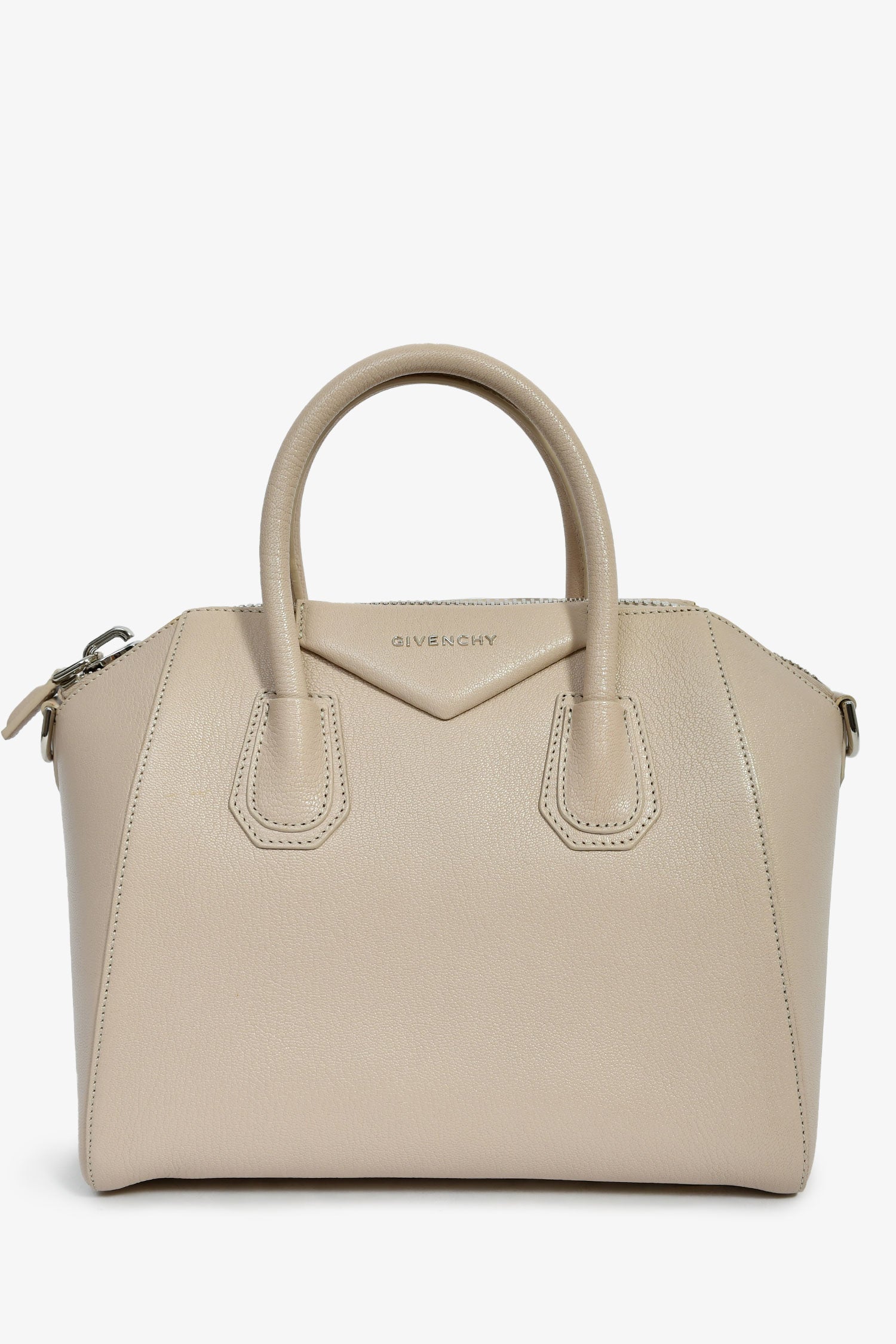 Refresh availabilityGivenchy Beige Leather Antigona Medium Top Handle. Top zip. Dual rolled handles. Attachable strap. Lined interior with 1 zip and 2 slip pockets. Silver-tone hardware. Tonal stitching.